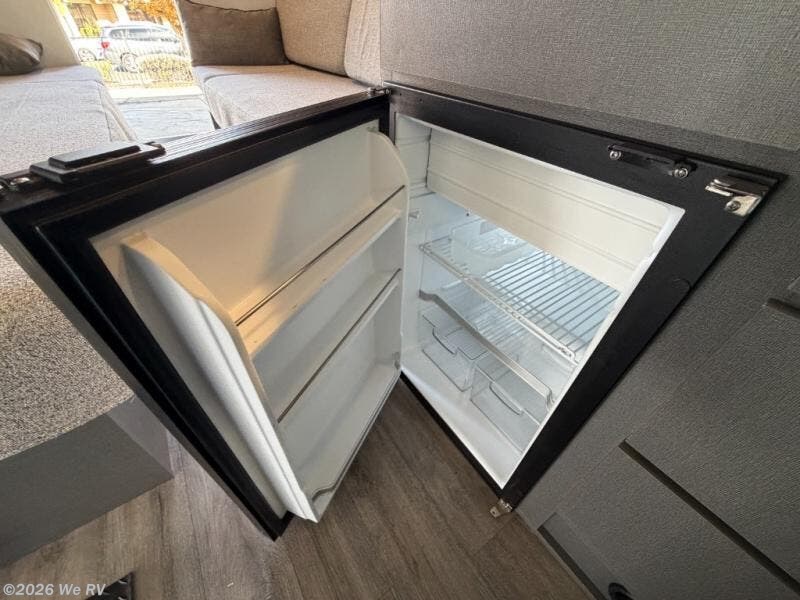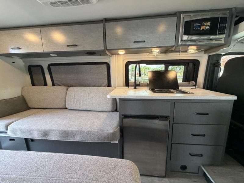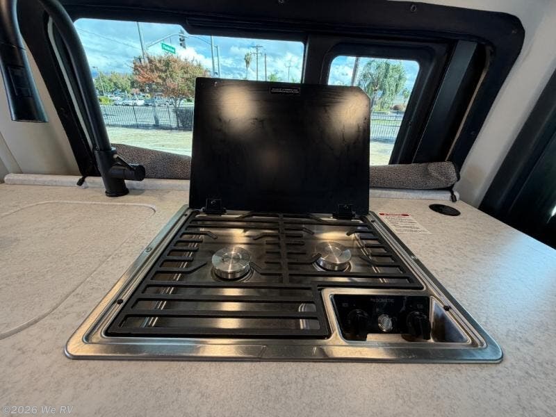 This Thor Motor Coach Dazzle includes a wet bath located all the way to the rear so you have more living space up front. The kitchen is just behind the cockpit swivel chairs, with a single door 12V refrigerator, two burner cooktop, and stainless steel sink. Towards the back are two twin beds that serve as seating areas during the day, and at night they can be converted to a king-size bed. There's also a removable dining table to enjoy all your meals. The fully enclosed rear wet bath features a shower and power vent. There's also an outdoor shower to keep things extra clean.
