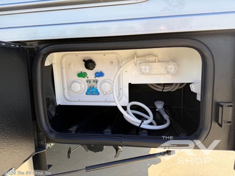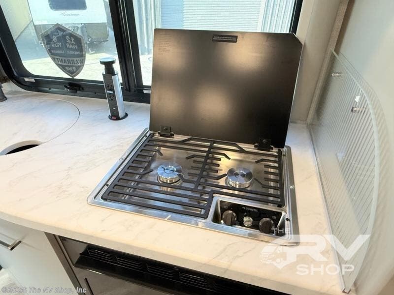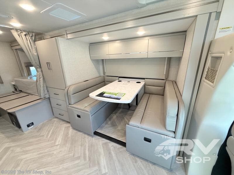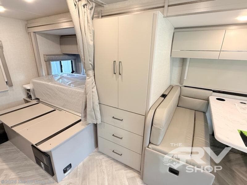 One look at this full-wall slide out coach and you'll be hooked! The swivel captain's seats can become a part of the living area once you're parked, and your guests can sit at the 76" Dream Dinette with storage drawer(s). Prepare lunch on the two burner gas cooktop, or use the convenient convection microwave with an air fryer. You'll find a large closet that can be used for clothes, food, or miscellaneous camp gear, plus there are overhead compartments for even more storage. The cab-over bunk provides additional sleeping space, and you'll enjoy the flip-up queen bed in the bedroom, along with a 32" Smart TV.