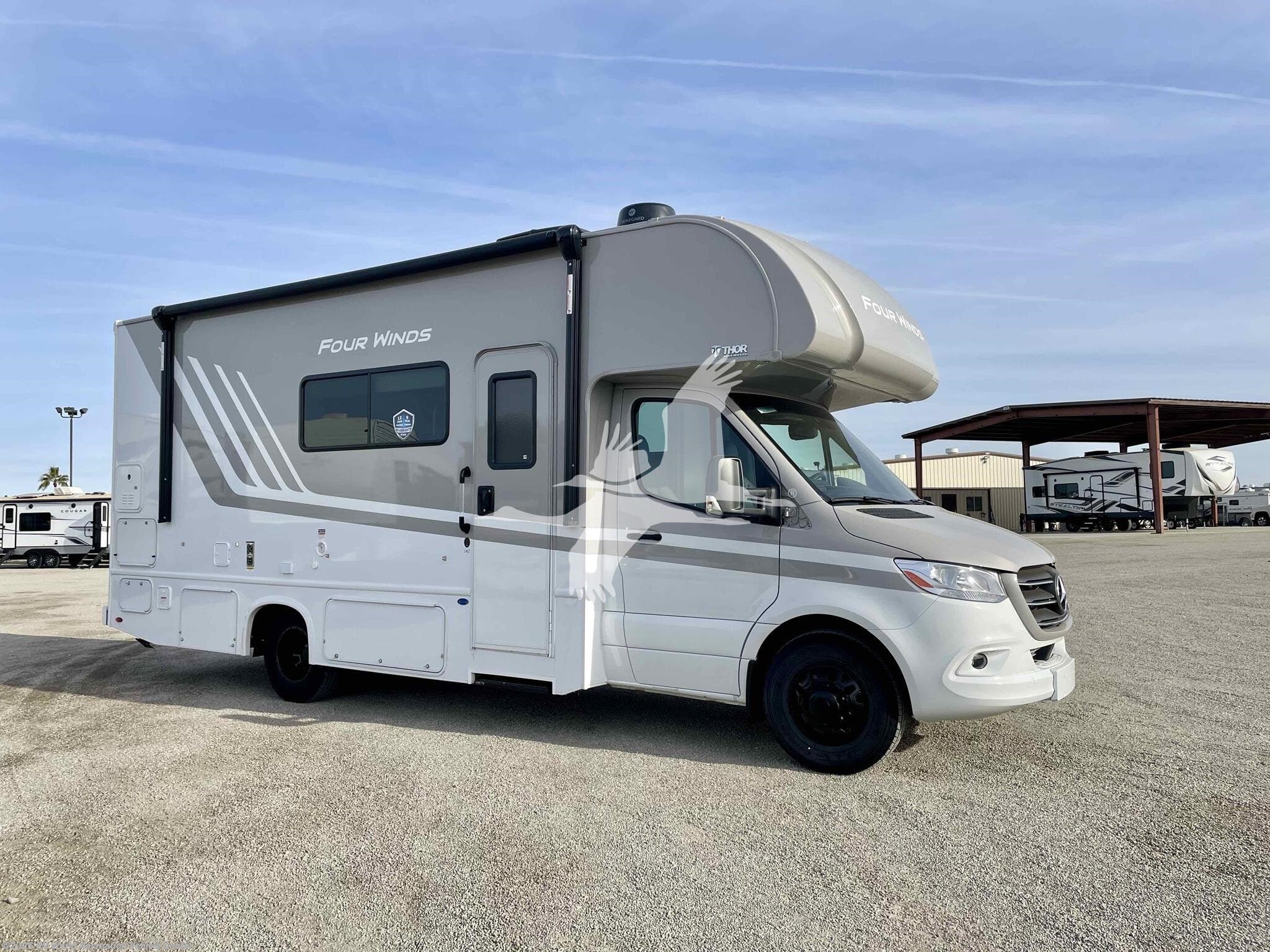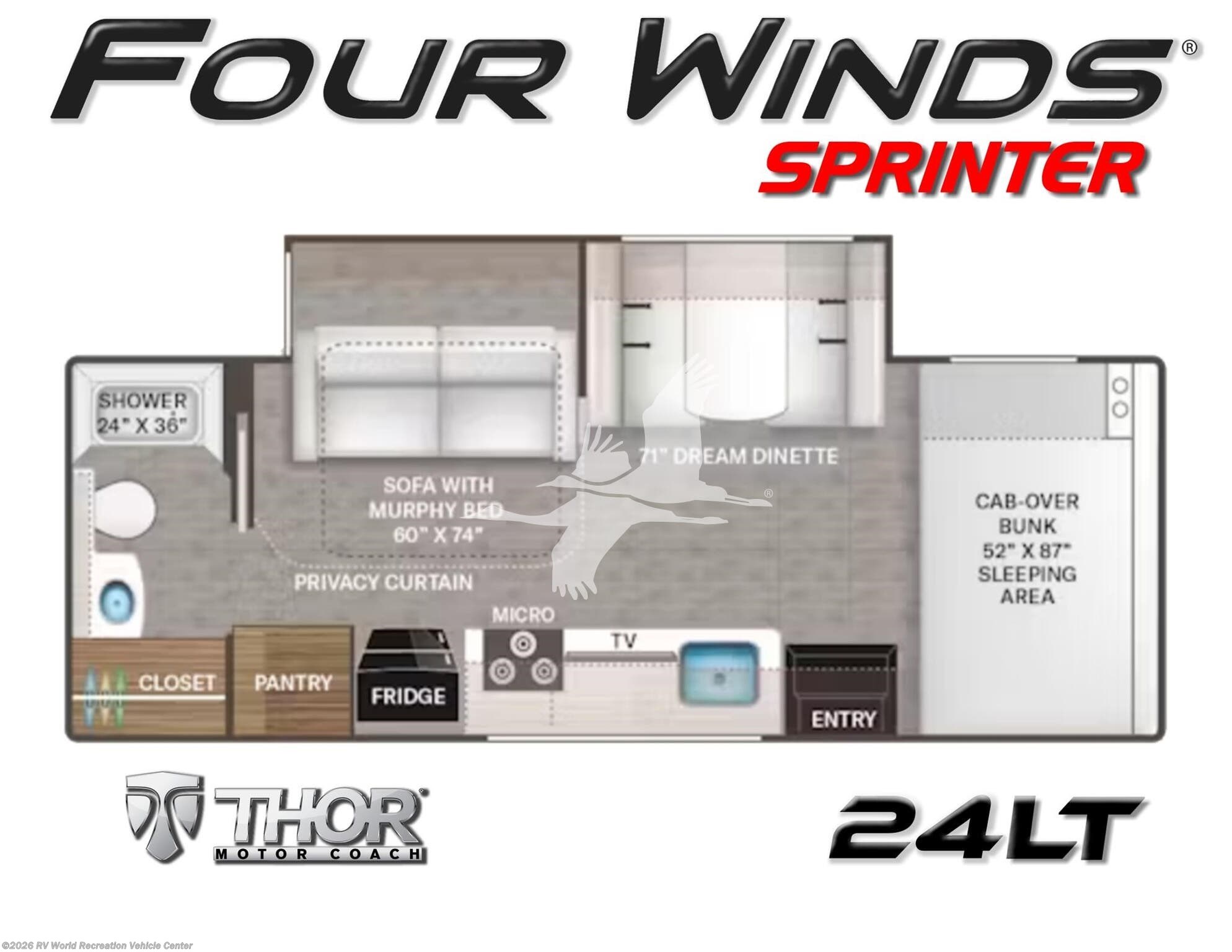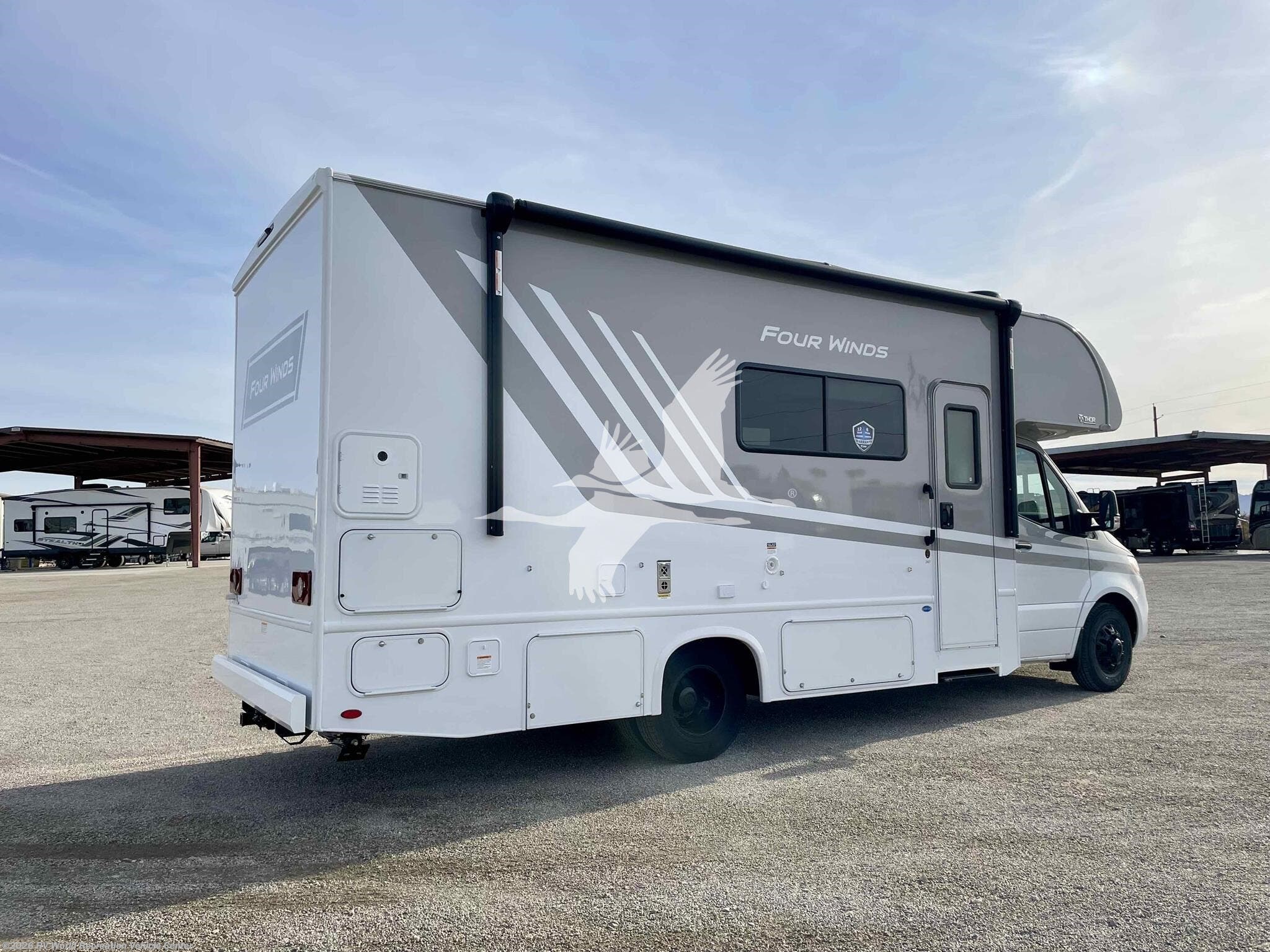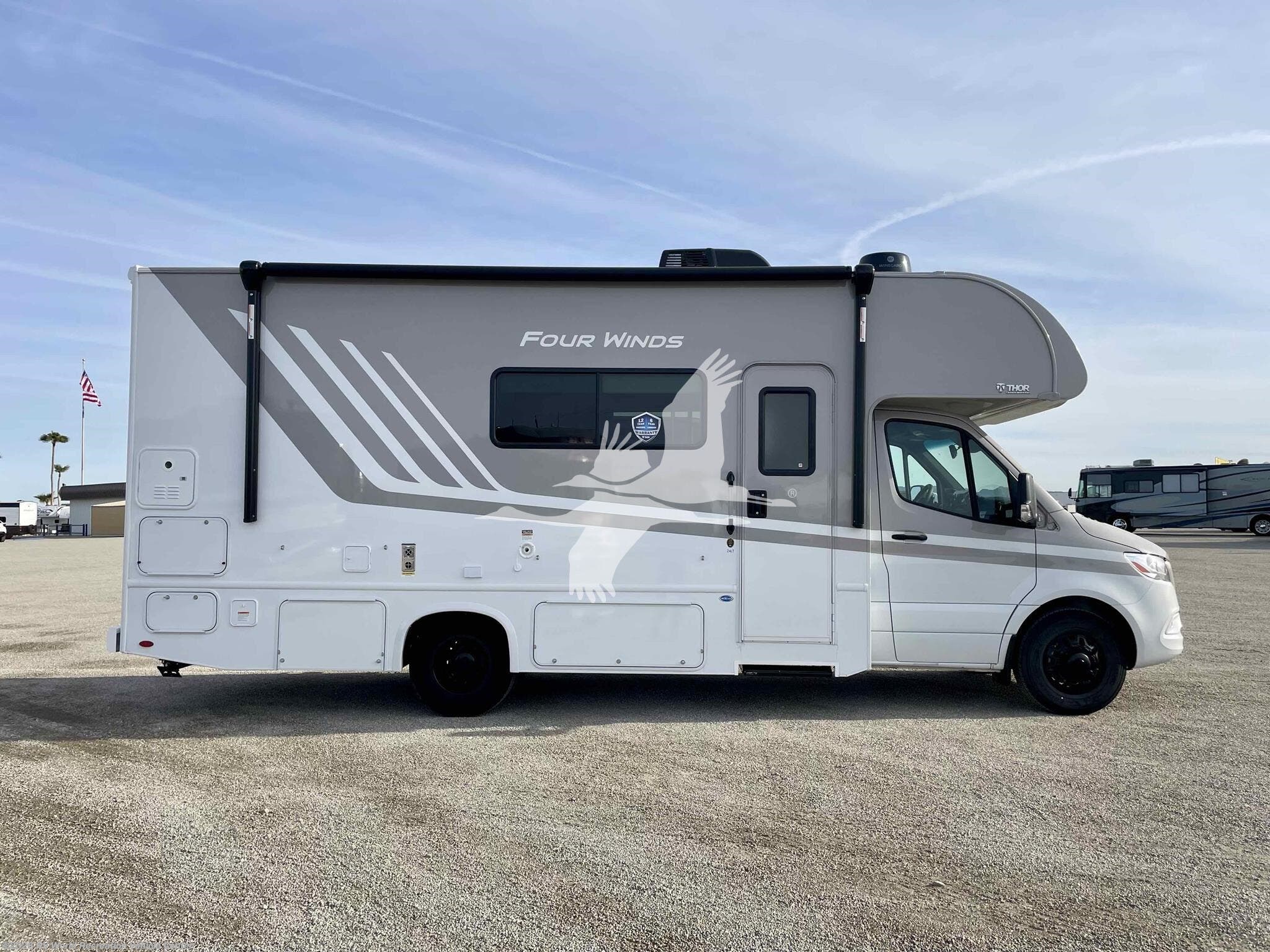 ****Stk#: TH18692.**** ------------- ON SPECIAL & JUST REDUCED!!! ----------- Perfect for family vacations or a weekend for two, the 2025 Four Winds® is made to fit you. The Four Winds Sprinter has everything you need to make your trip unforgettable. Easy to drive and easy to love, you’ll never want to leave. With multiple floor plans and decor colors, there’s something for every taste and style. Whether a solo traveler or a family of four, this Class C motorhome offers the perfect solution for your holiday adventures. The 24LT is 25' 10" in overall length so it's easy to drive and navigate even in city traffic. The 24LT features a Dream Dinette booth and Murphy Bed slide-out creating an abundance of space and comfortable seating inside. It will also sleep 4 people. Key Features include Mercedes-Benz Sprinter Chassis, Rotocast Storage Compartments, One-Piece Fiberglass Front Cap, Touchscreen Dash Radio with Back-Up Monitor, Heated/Remote Exterior Side Mirrors, 5,000 lb. Trailer Hitch, Leatherette Furniture, 3 Burner H/0 Gas Range Top & Convection Microwave Oven w/Air Fryer, Power Patio Awning w/lntegrated LED Lighting, Slide-Out Room Awning, Roof Ladder. Other features include 32" TV w/Blu-ray Player in Living Area, 100-watt Solar Charging, Tankless Water Heater, Outside Shower, Exterior LP BBQ Connection, 3.2kw Onan Diesel Generator, and more.