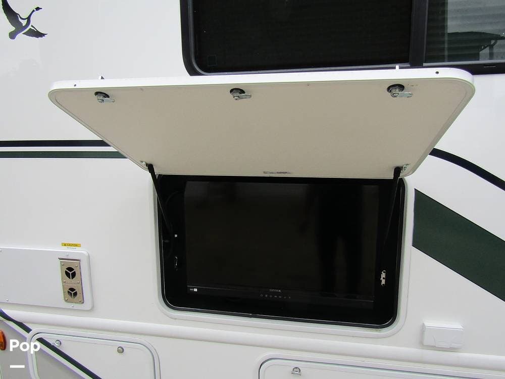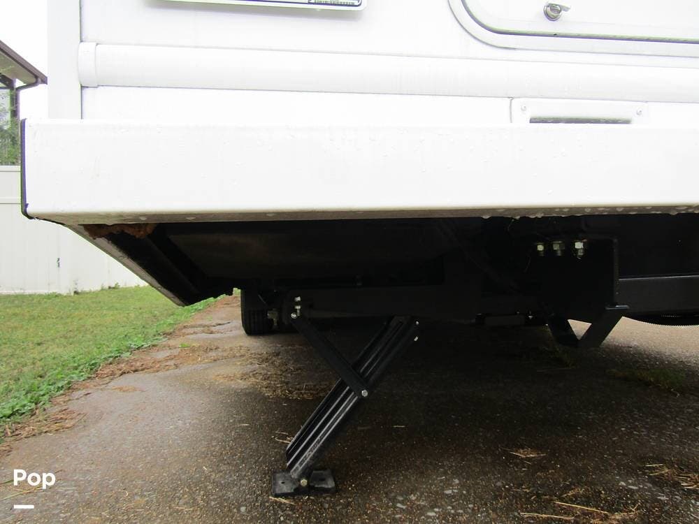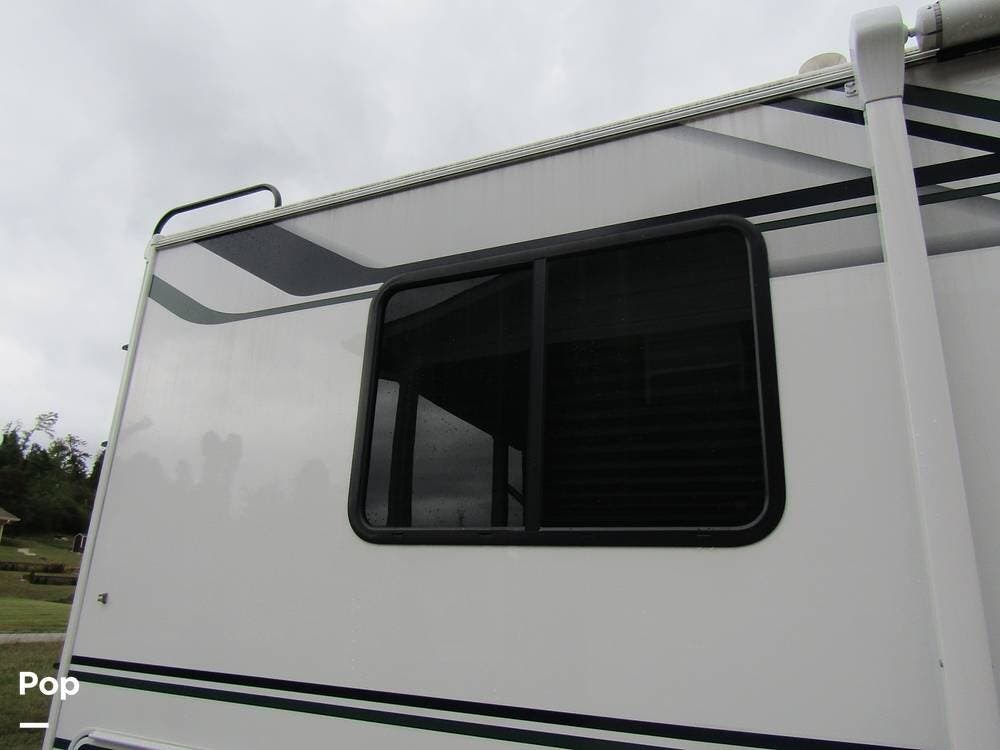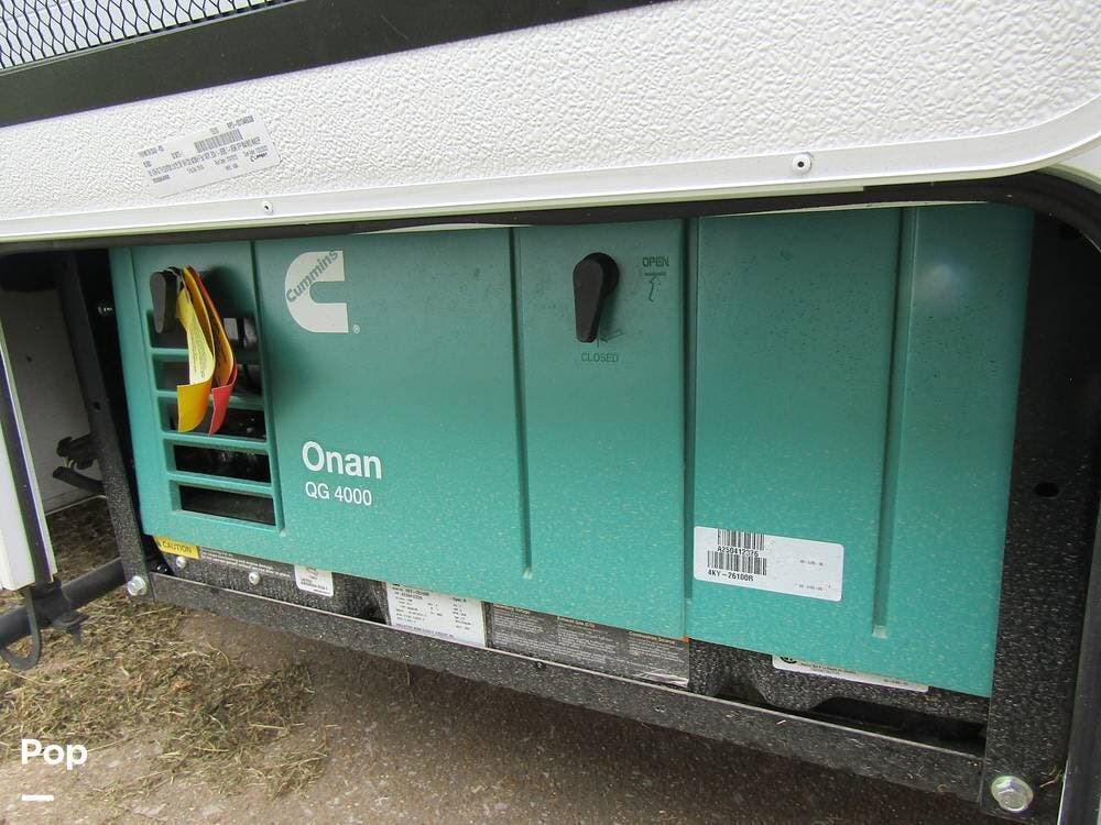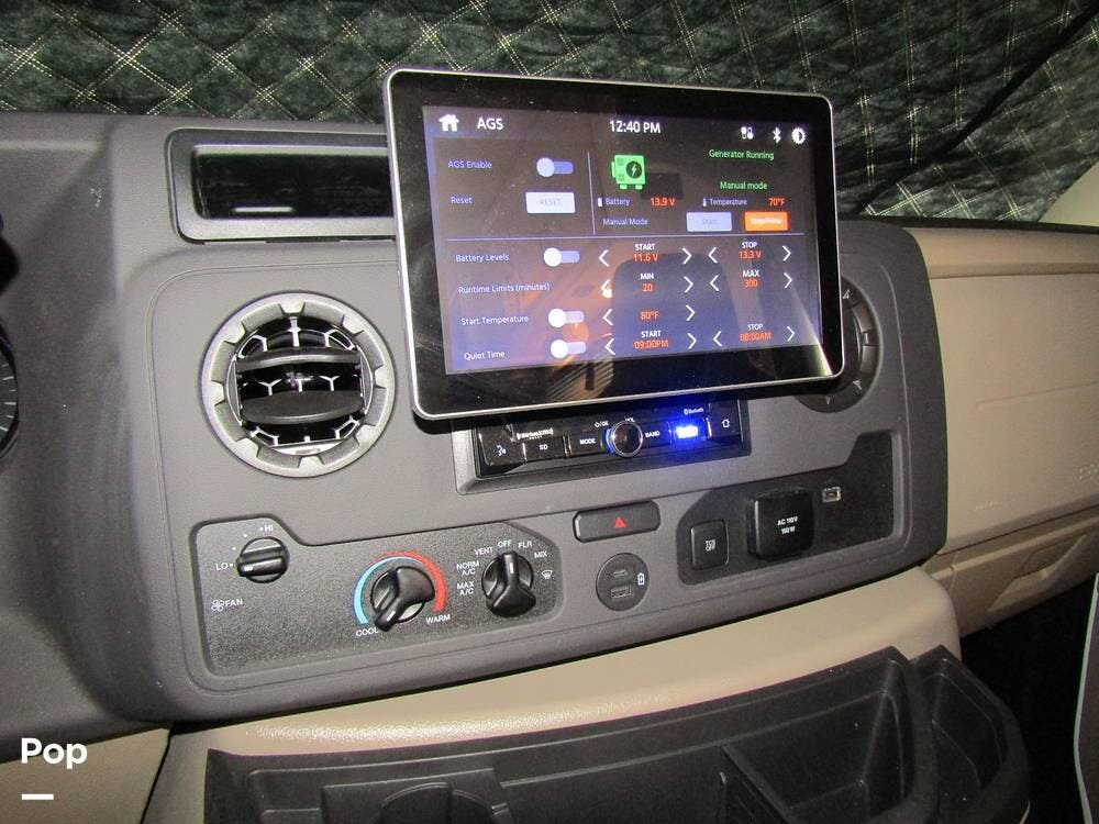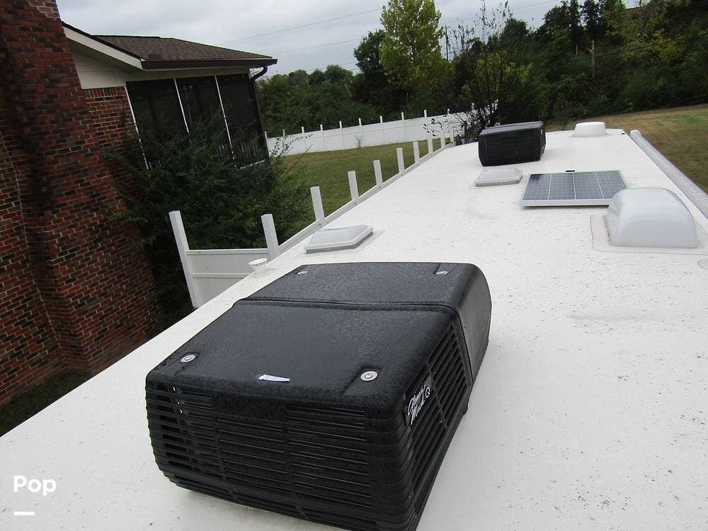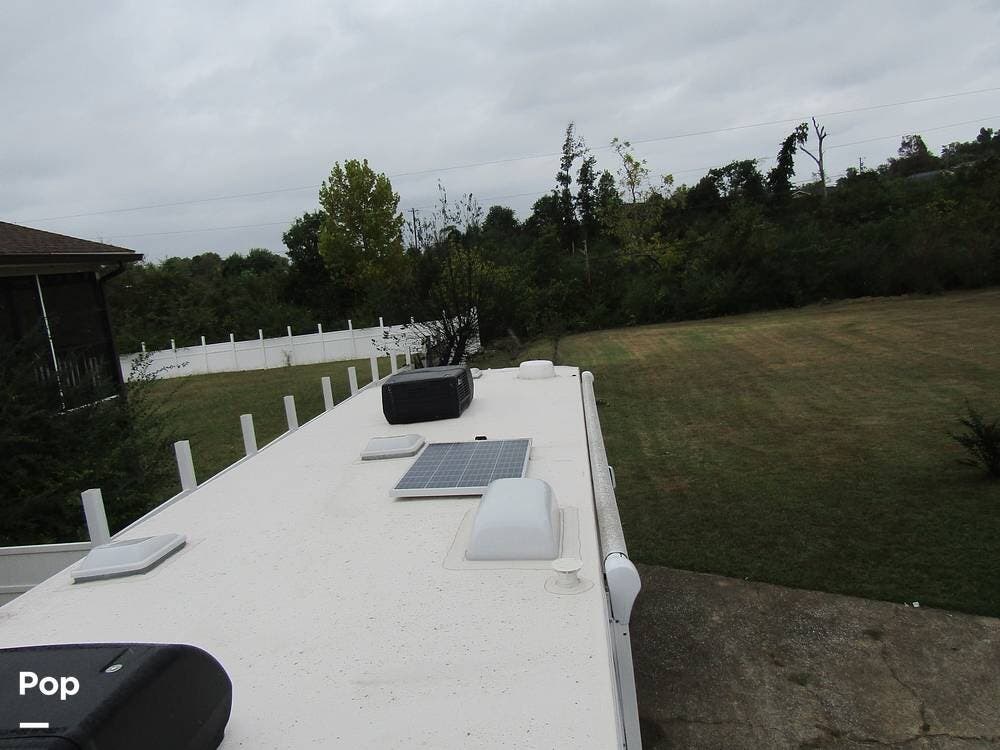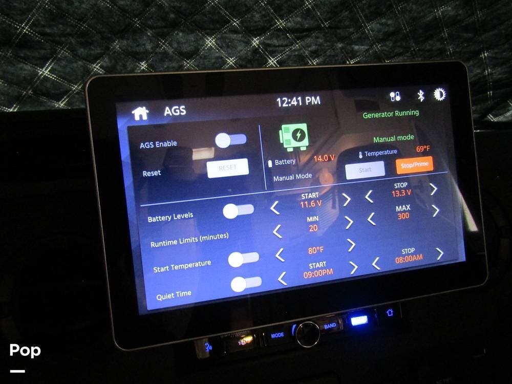 There is an external entertainment center with a 32" TV with a built-in JBL Sound Bar, a roof access ladder, a solar panel, a rear-view camera, electric stabilizers, and a 4000 Watt Generator with an AGS auto-start generator system that will turn itself on and off to keep your RV at room temperature, whether you're there or not