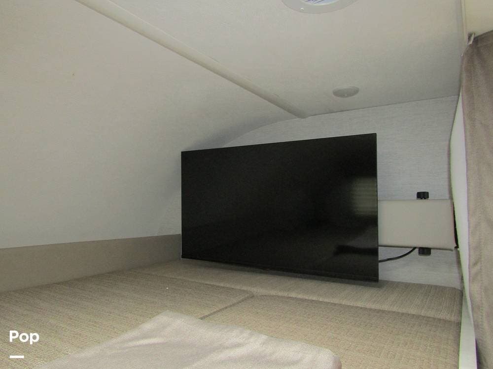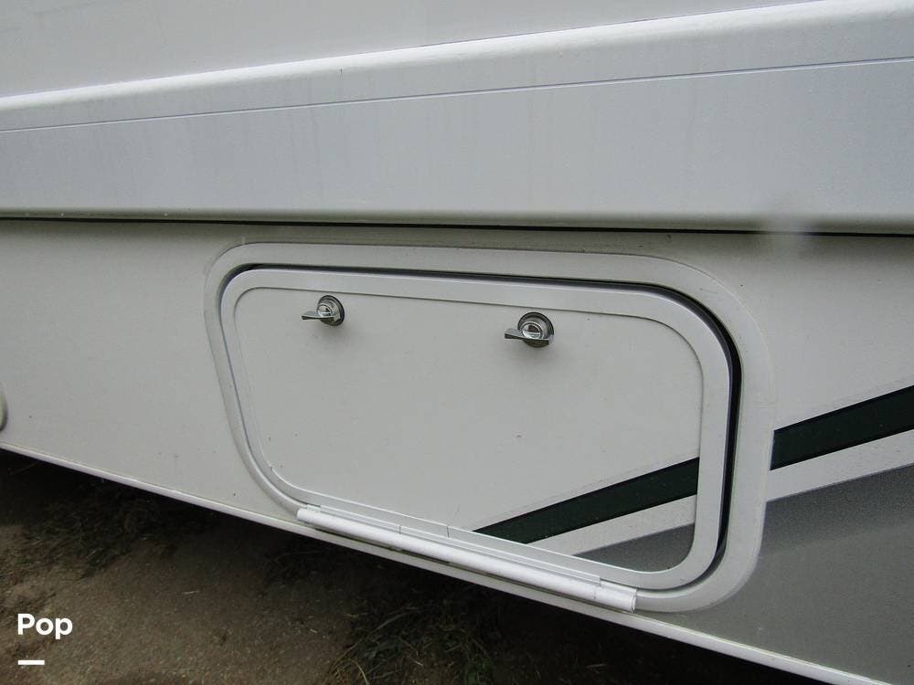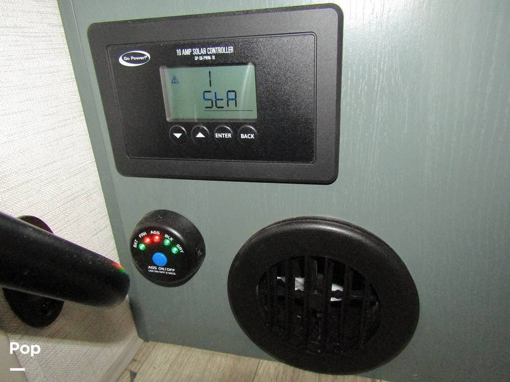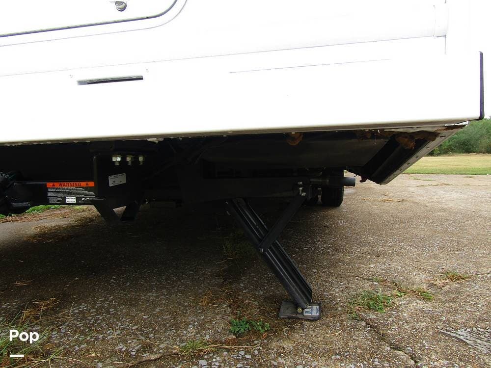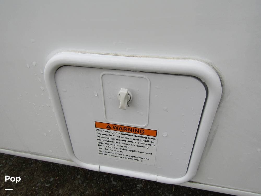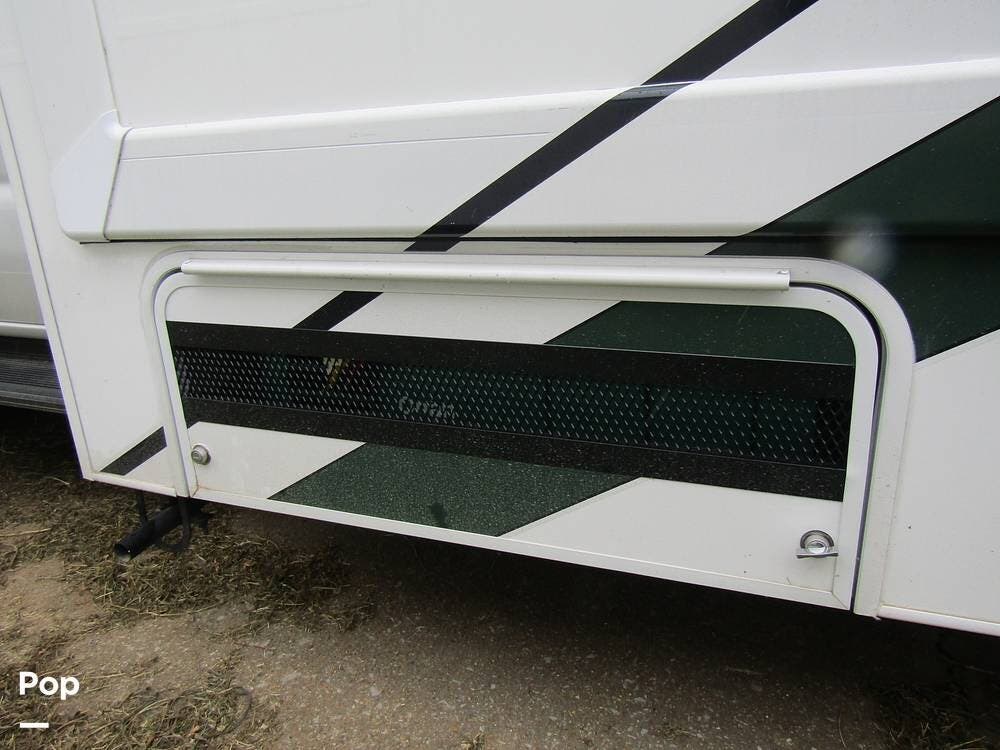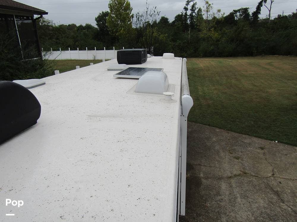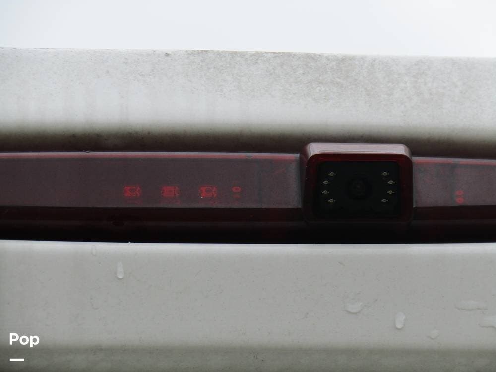 There is an external entertainment center with a 32" TV with a built-in JBL Sound Bar, a roof access ladder, a solar panel, a rear-view camera, electric stabilizers, and a 4000 Watt Generator with an AGS auto-start generator system that will turn itself on and off to keep your RV at room temperature, whether you're there or not