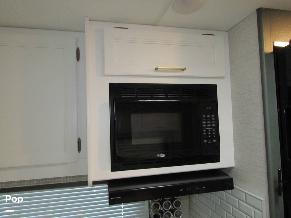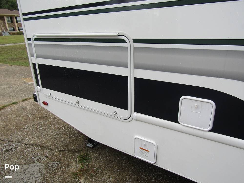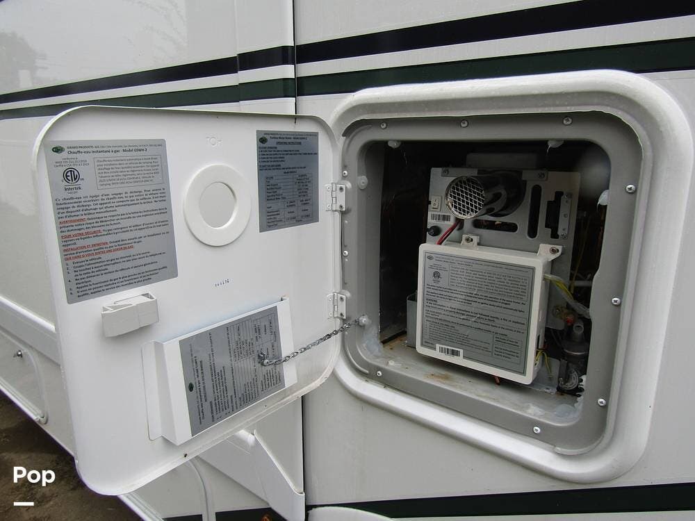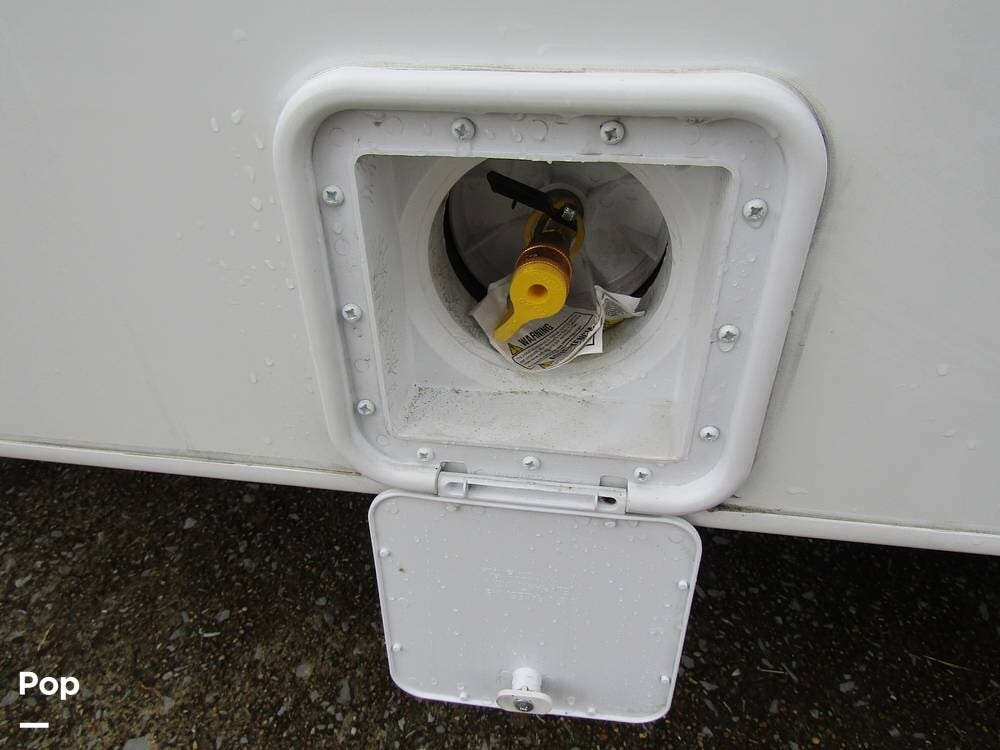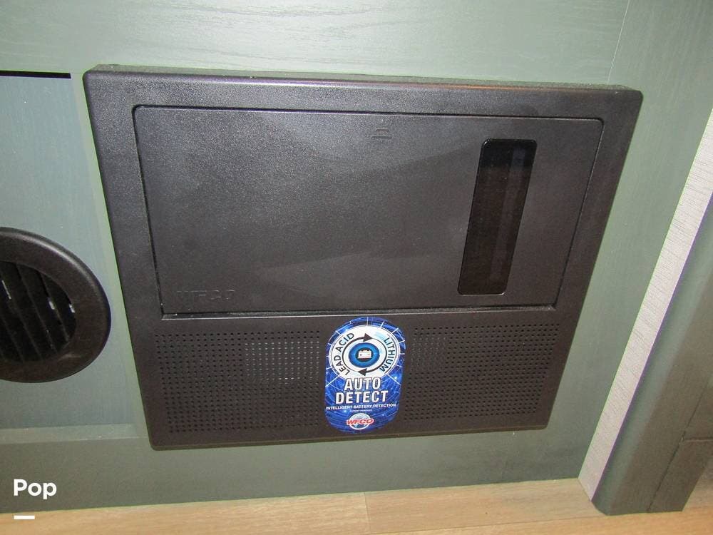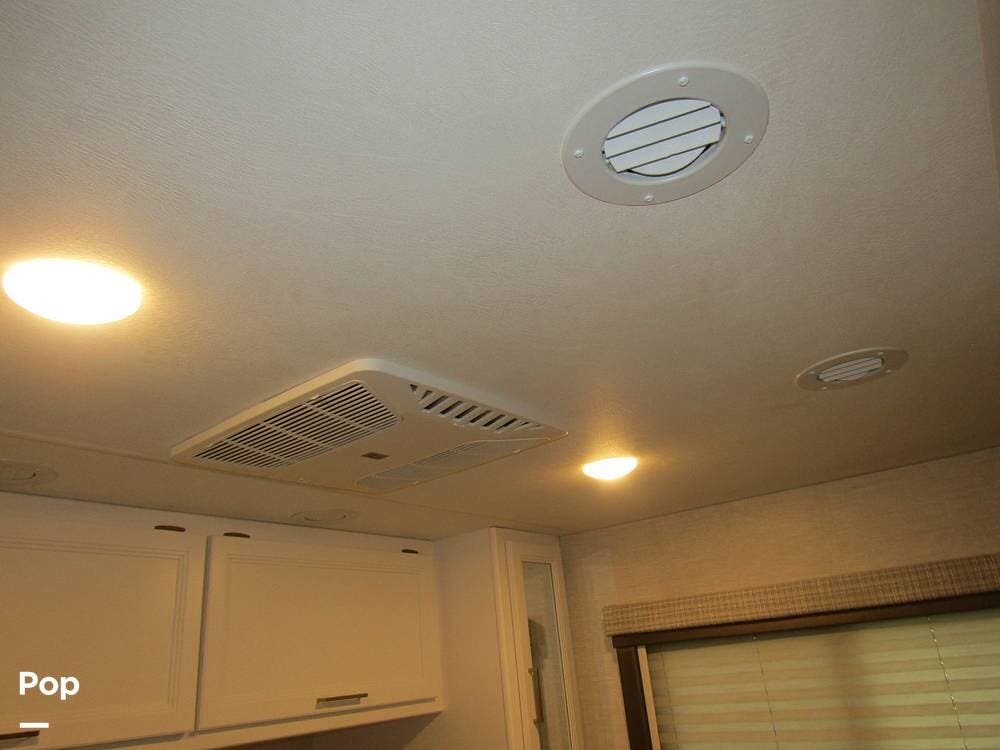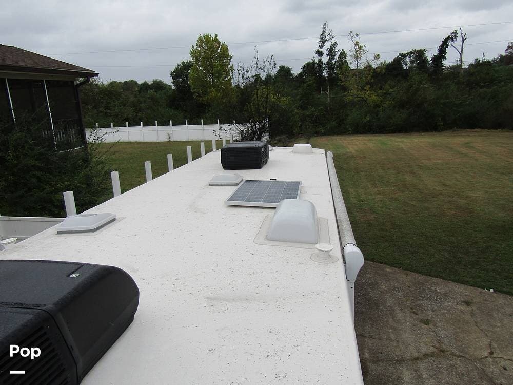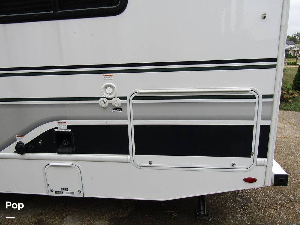 There is an external entertainment center with a 32" TV with a built-in JBL Sound Bar, a roof access ladder, a solar panel, a rear-view camera, electric stabilizers, and a 4000 Watt Generator with an AGS auto-start generator system that will turn itself on and off to keep your RV at room temperature, whether you're there or not