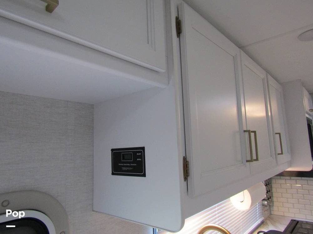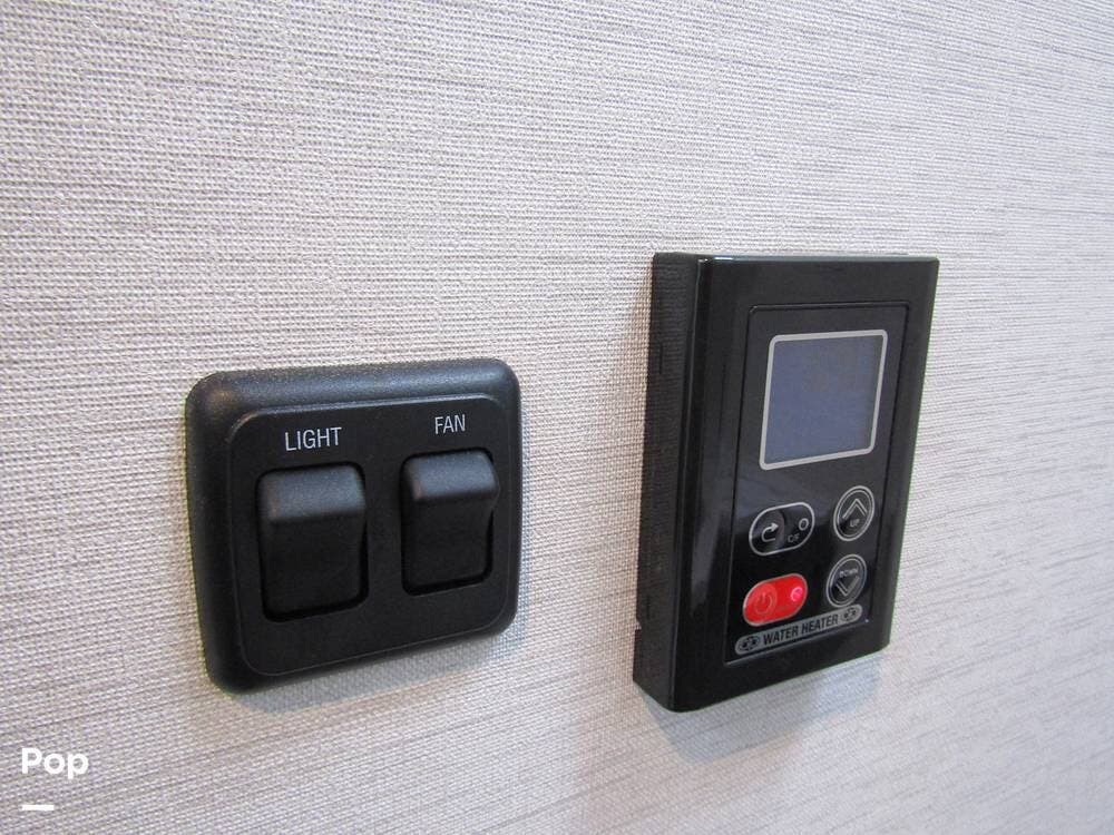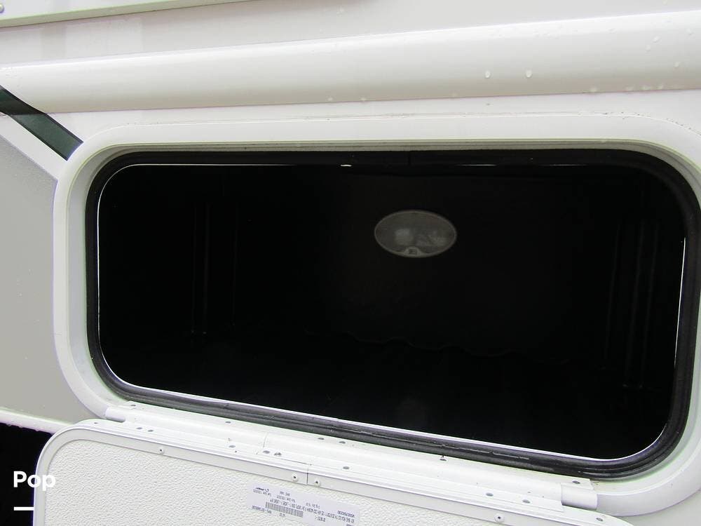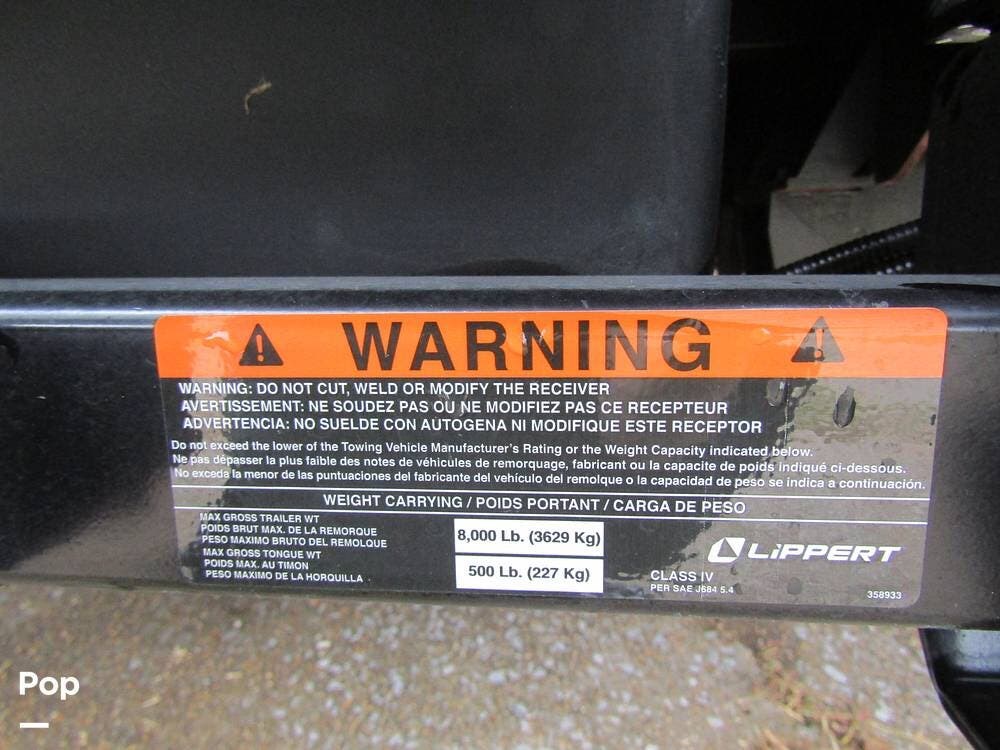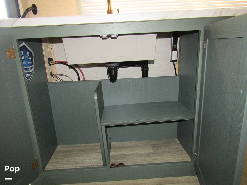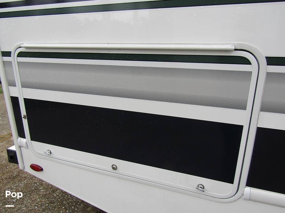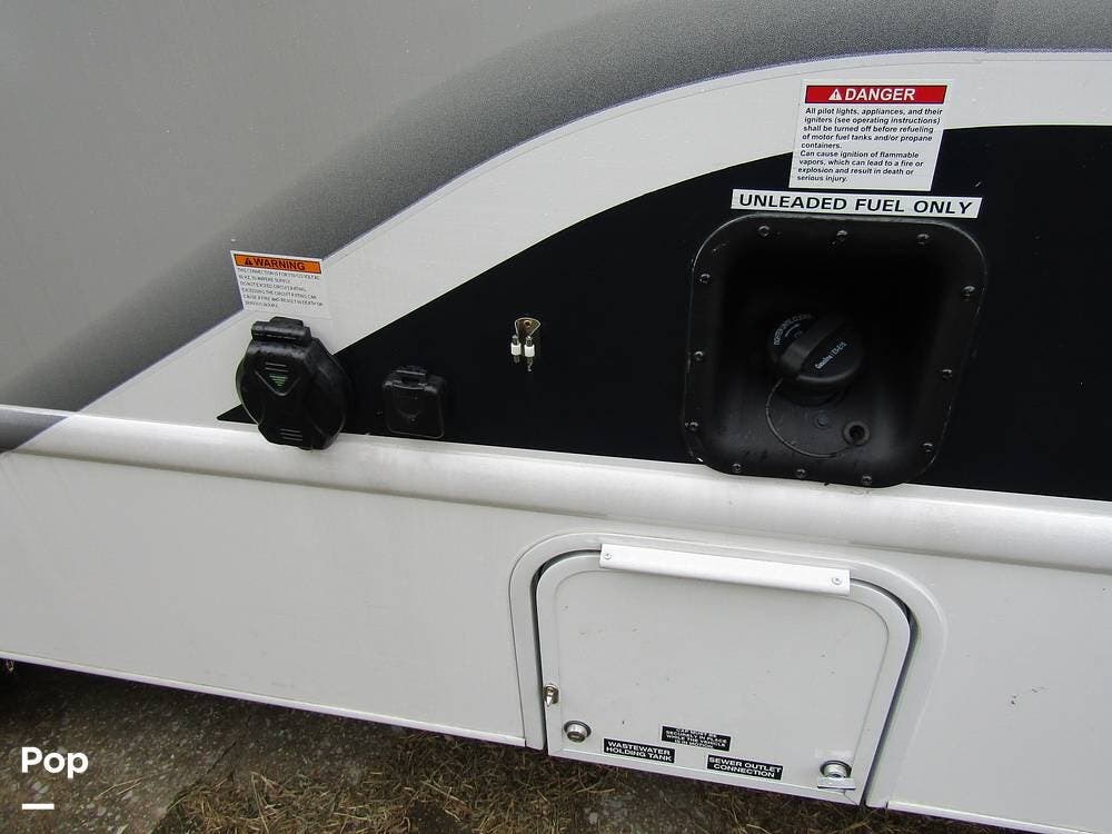 There is an external entertainment center with a 32" TV with a built-in JBL Sound Bar, a roof access ladder, a solar panel, a rear-view camera, electric stabilizers, and a 4000 Watt Generator with an AGS auto-start generator system that will turn itself on and off to keep your RV at room temperature, whether you're there or not