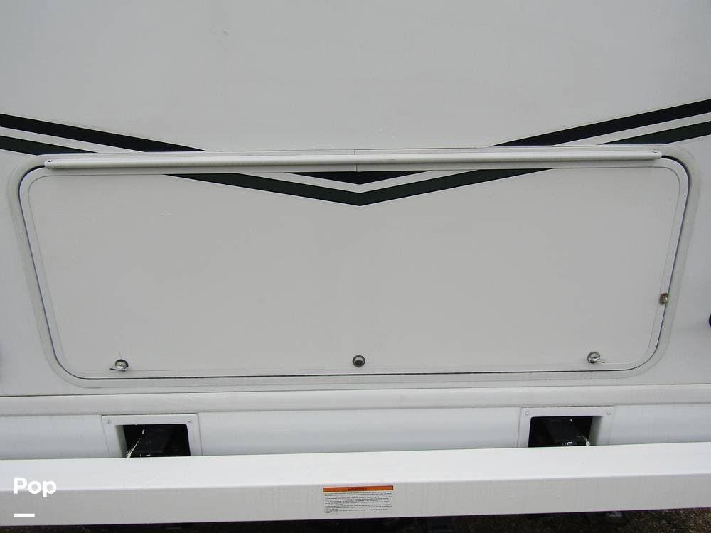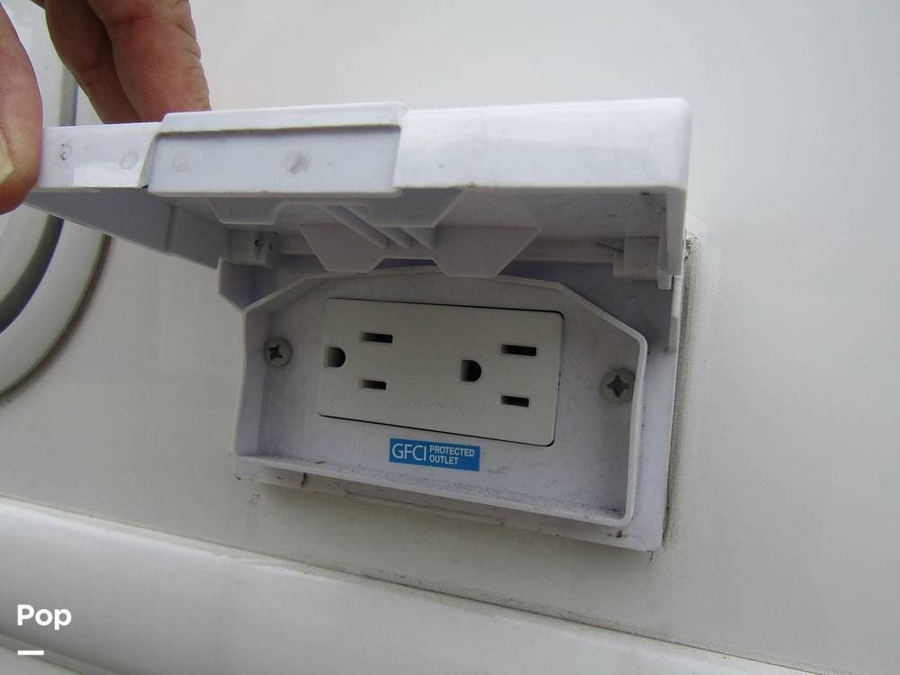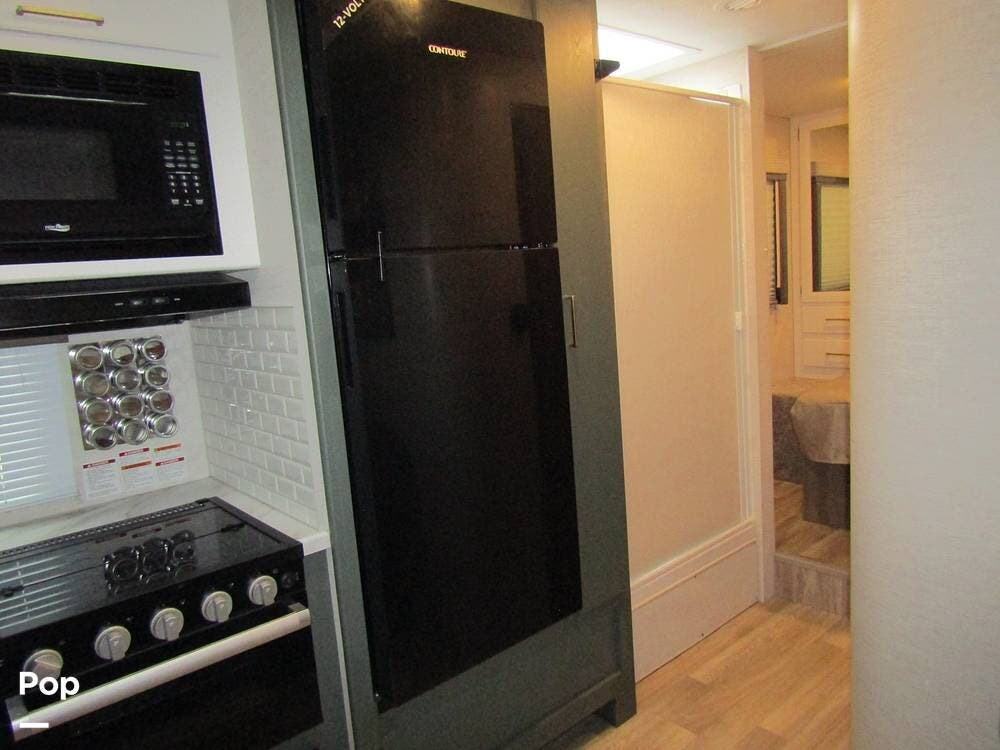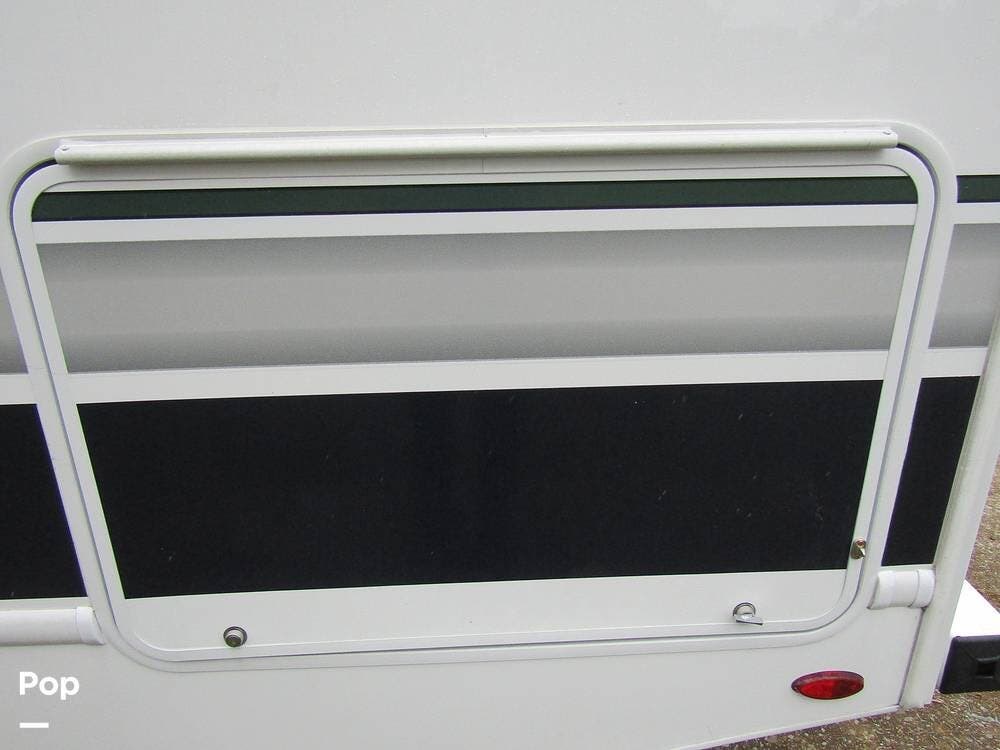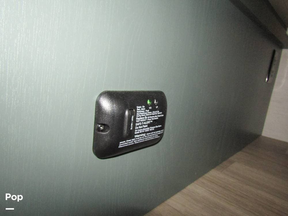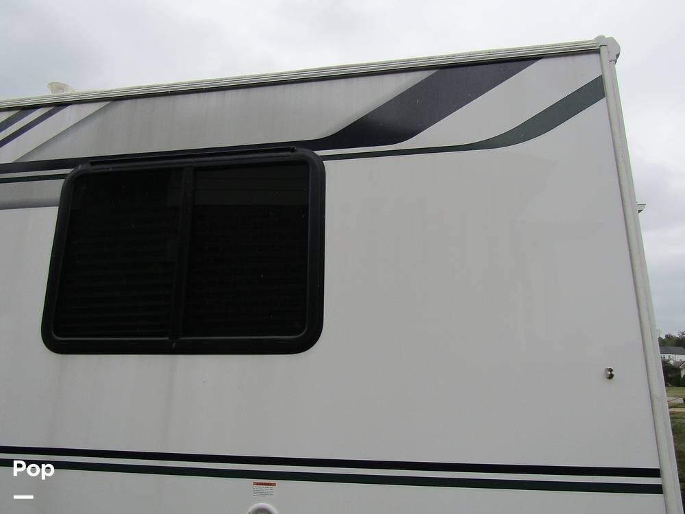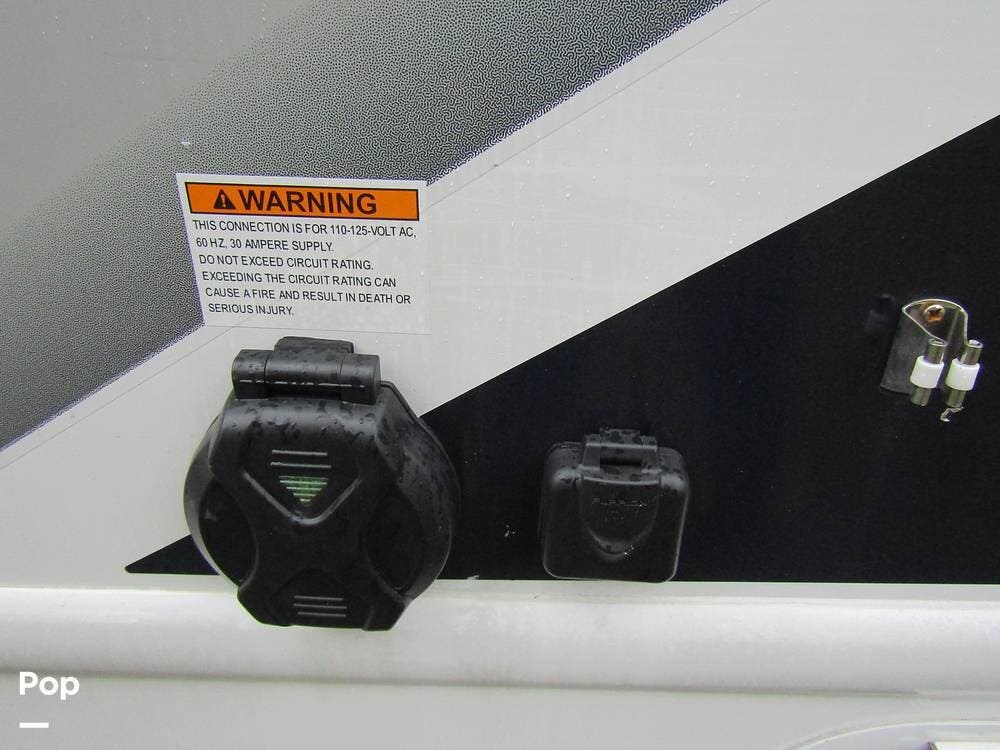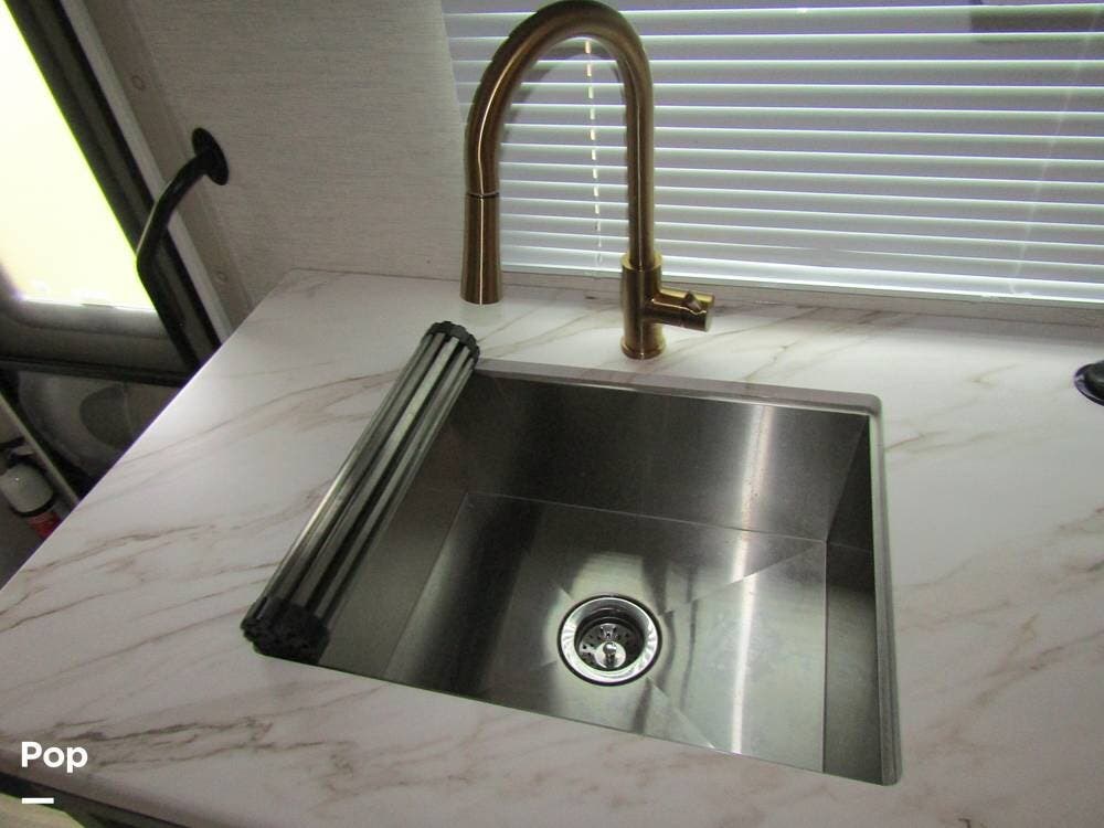 There is an external entertainment center with a 32" TV with a built-in JBL Sound Bar, a roof access ladder, a solar panel, a rear-view camera, electric stabilizers, and a 4000 Watt Generator with an AGS auto-start generator system that will turn itself on and off to keep your RV at room temperature, whether you're there or not
