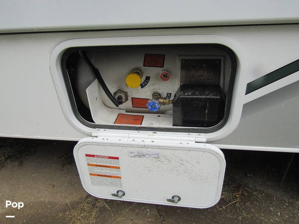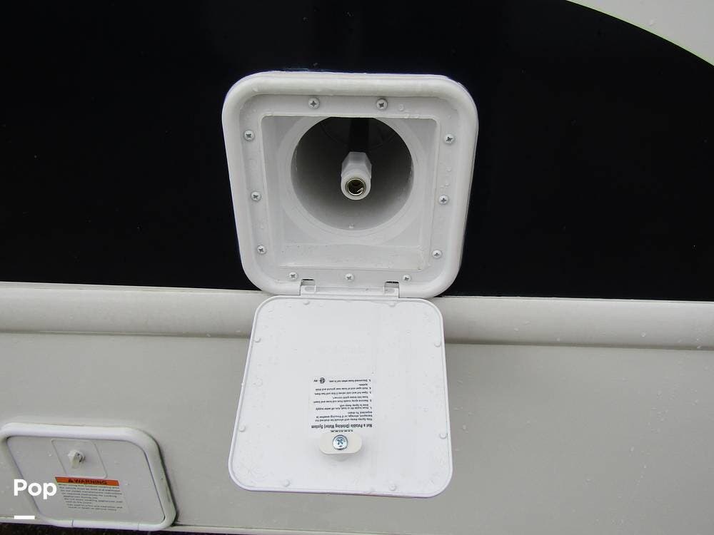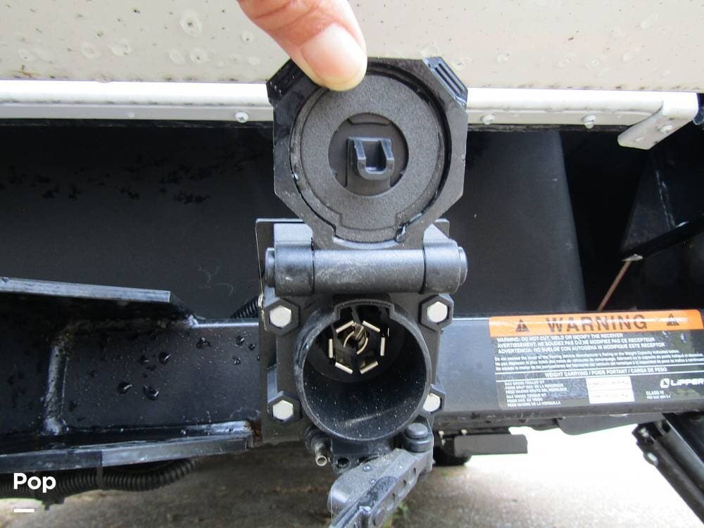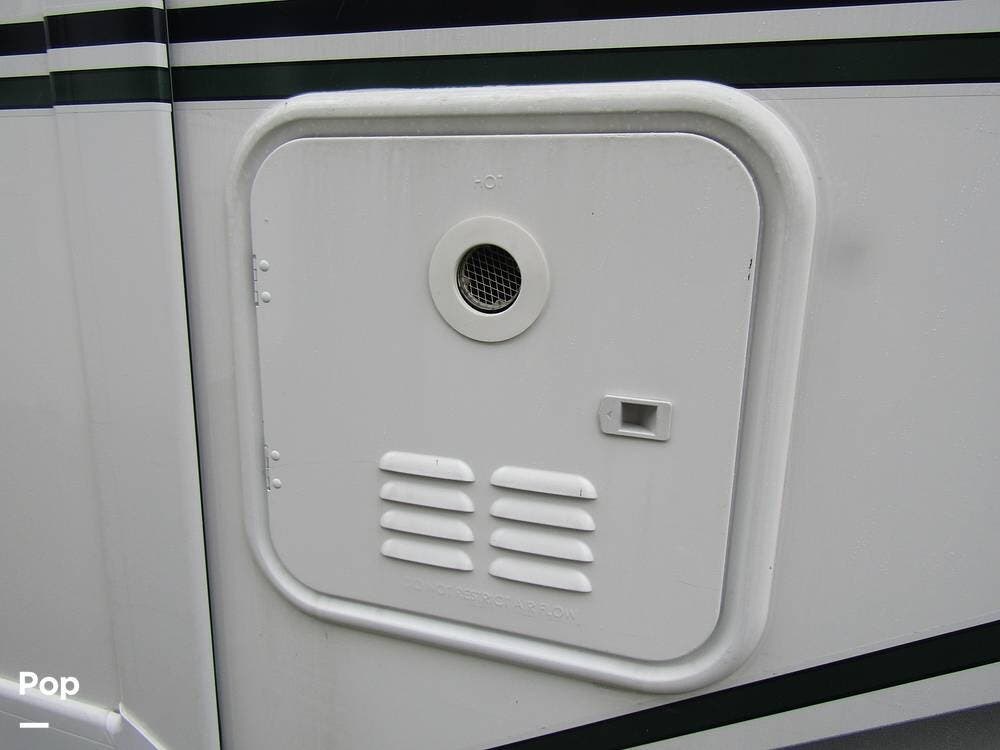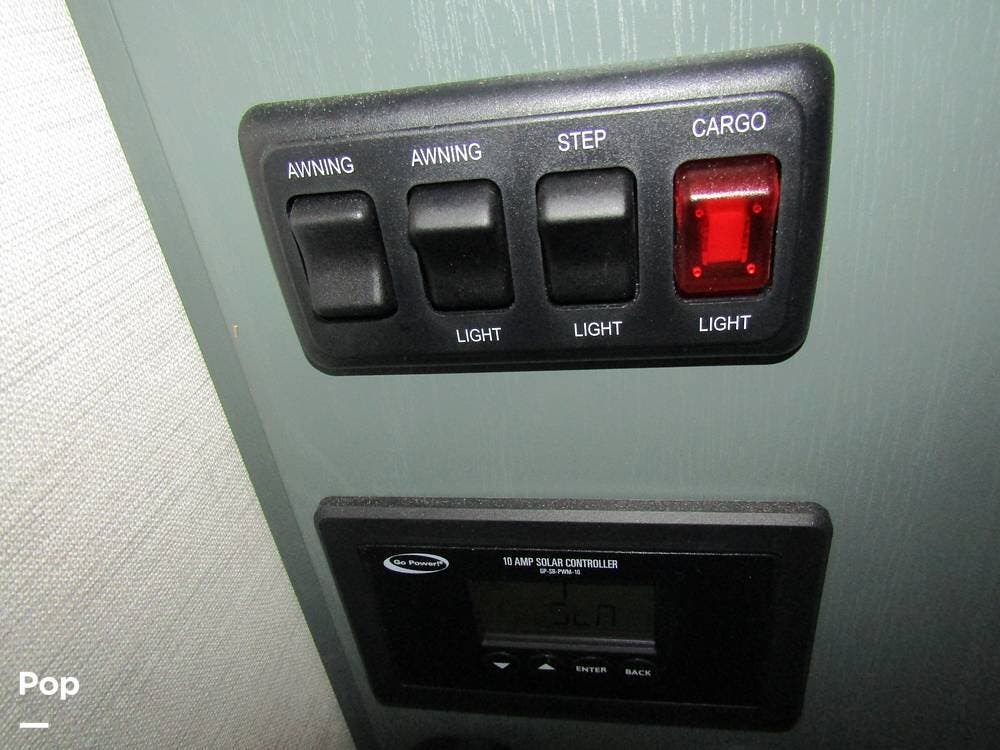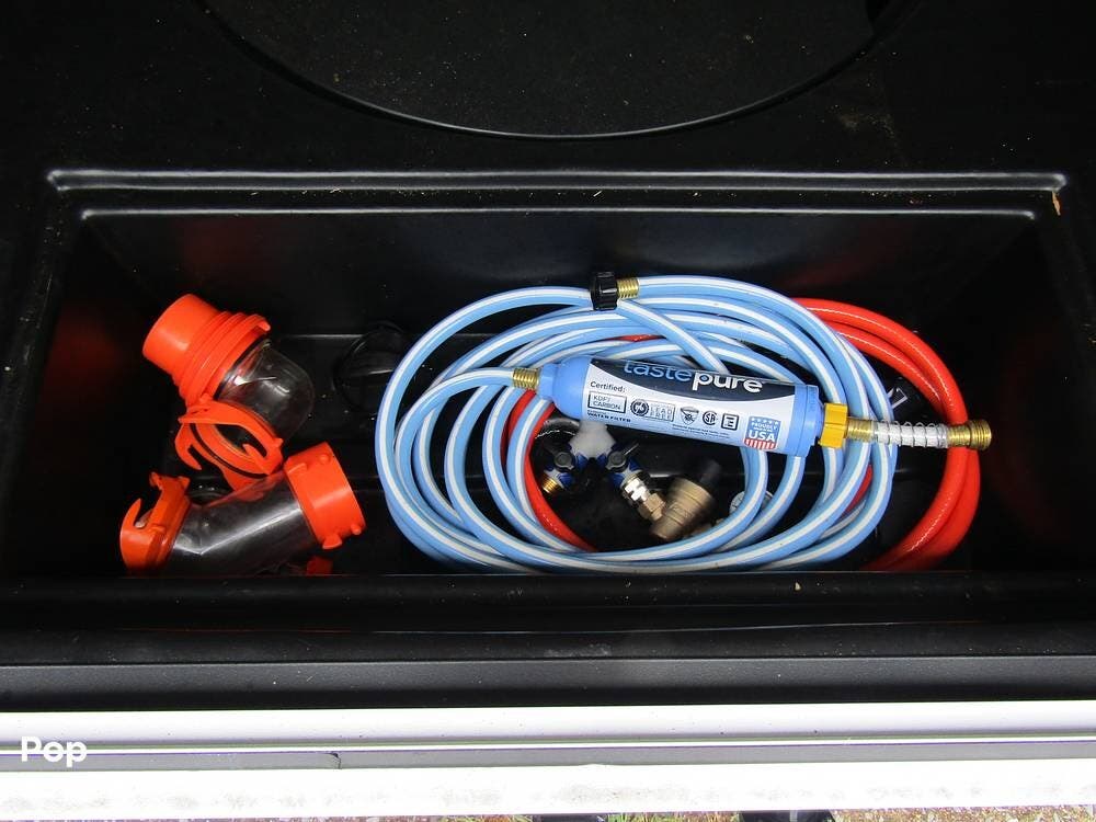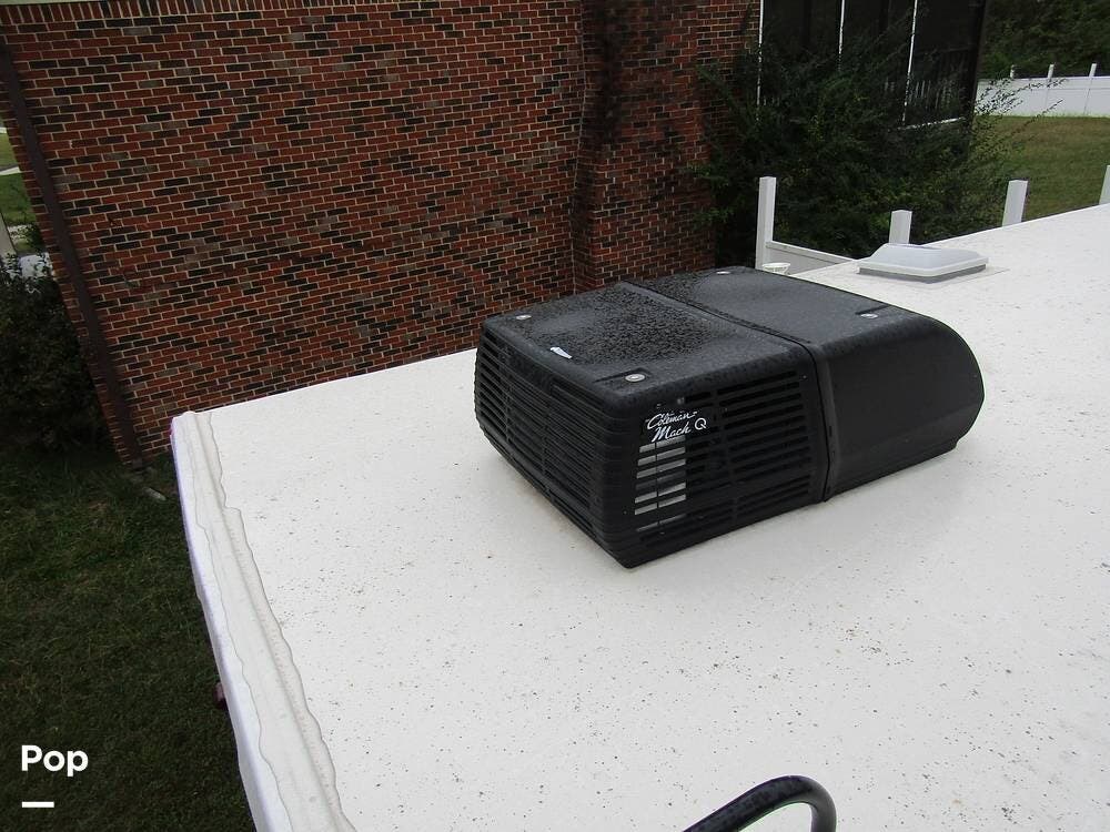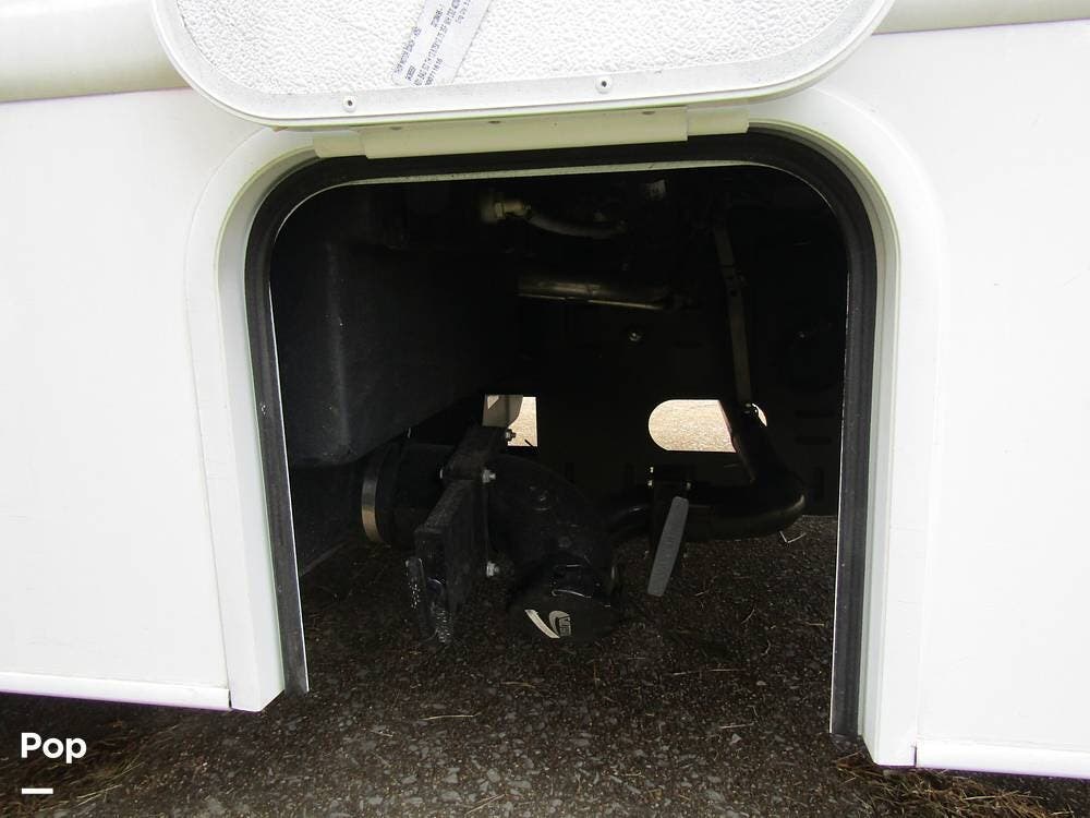 There is an external entertainment center with a 32" TV with a built-in JBL Sound Bar, a roof access ladder, a solar panel, a rear-view camera, electric stabilizers, and a 4000 Watt Generator with an AGS auto-start generator system that will turn itself on and off to keep your RV at room temperature, whether you're there or not