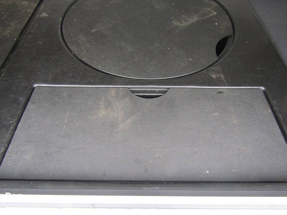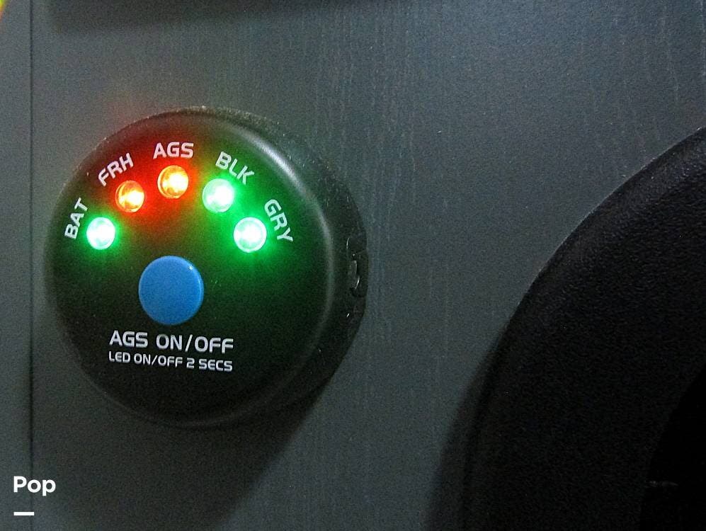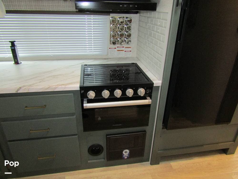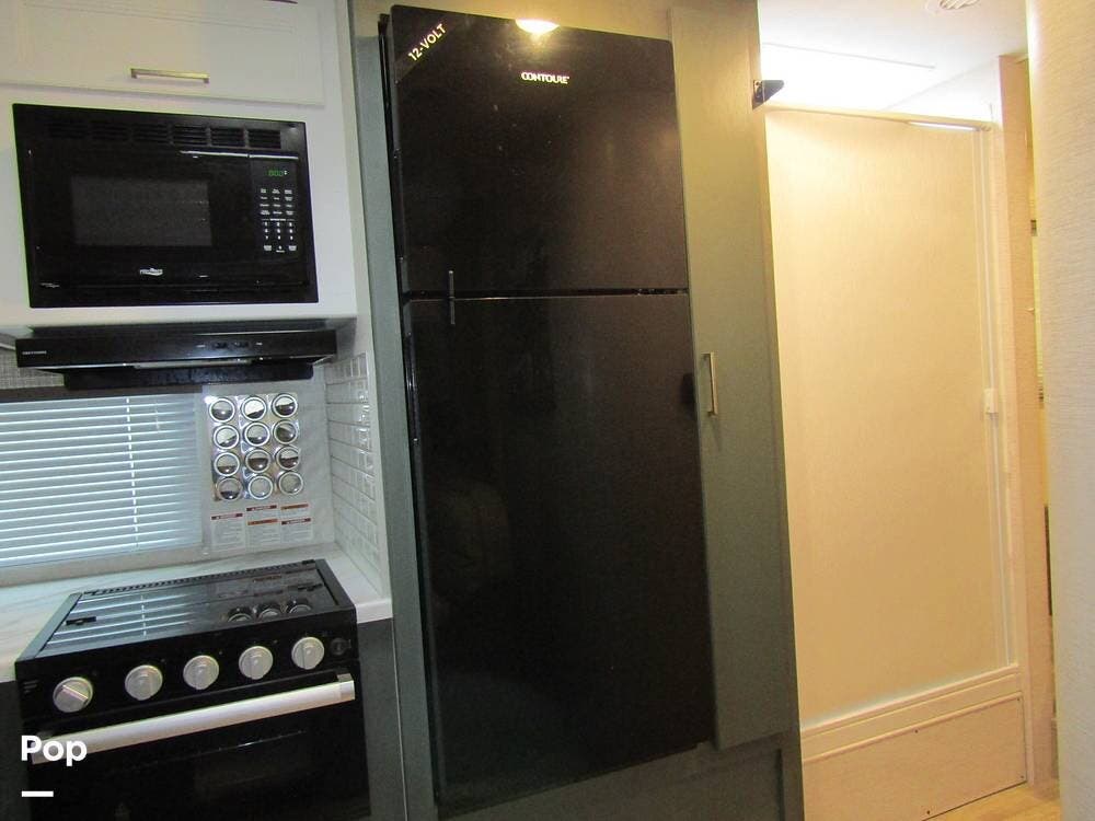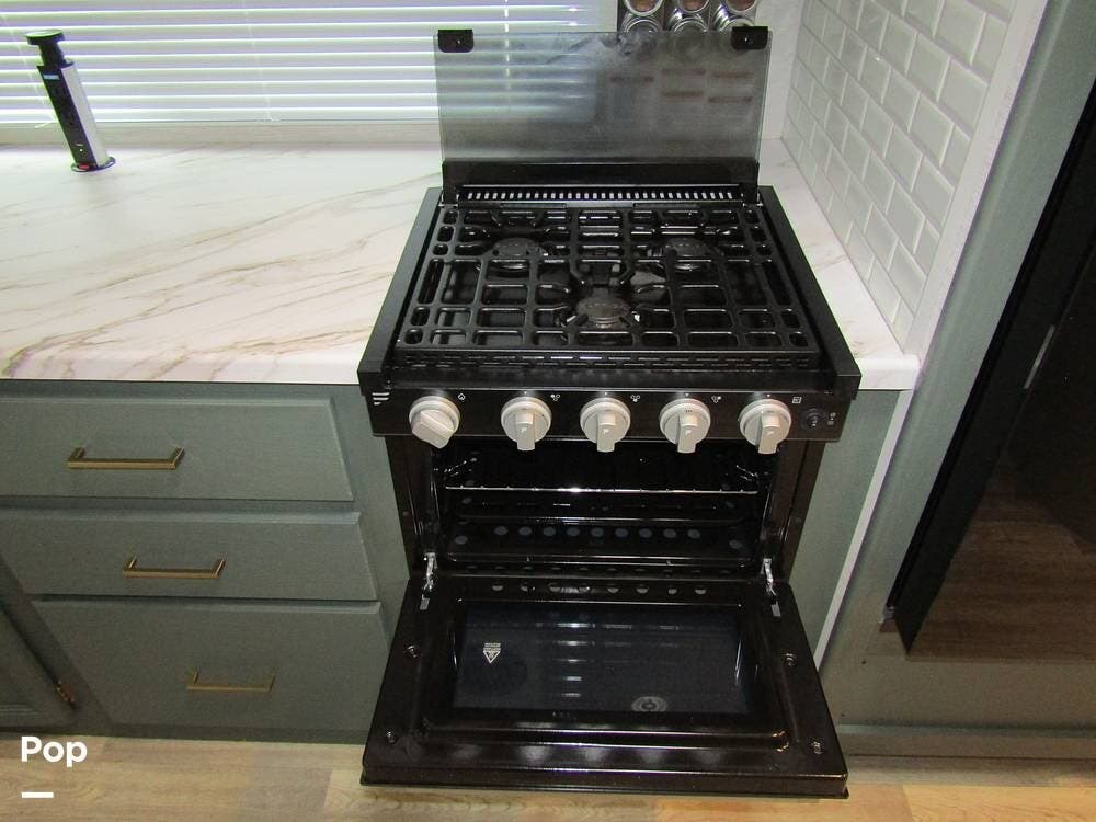 The kitchen features a farm-style sink, a microwave, a three-burner stove with a cooktop cover and oven, and a 12V refrigerator/freezer that can be set to operate with the AGS Generator.