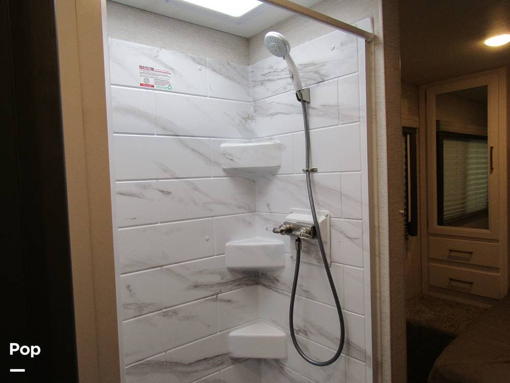 The spacious full-size bathroom has an on-demand hot water system, lots of storage, and a spacious shower that is independently accessible.
