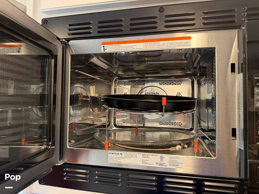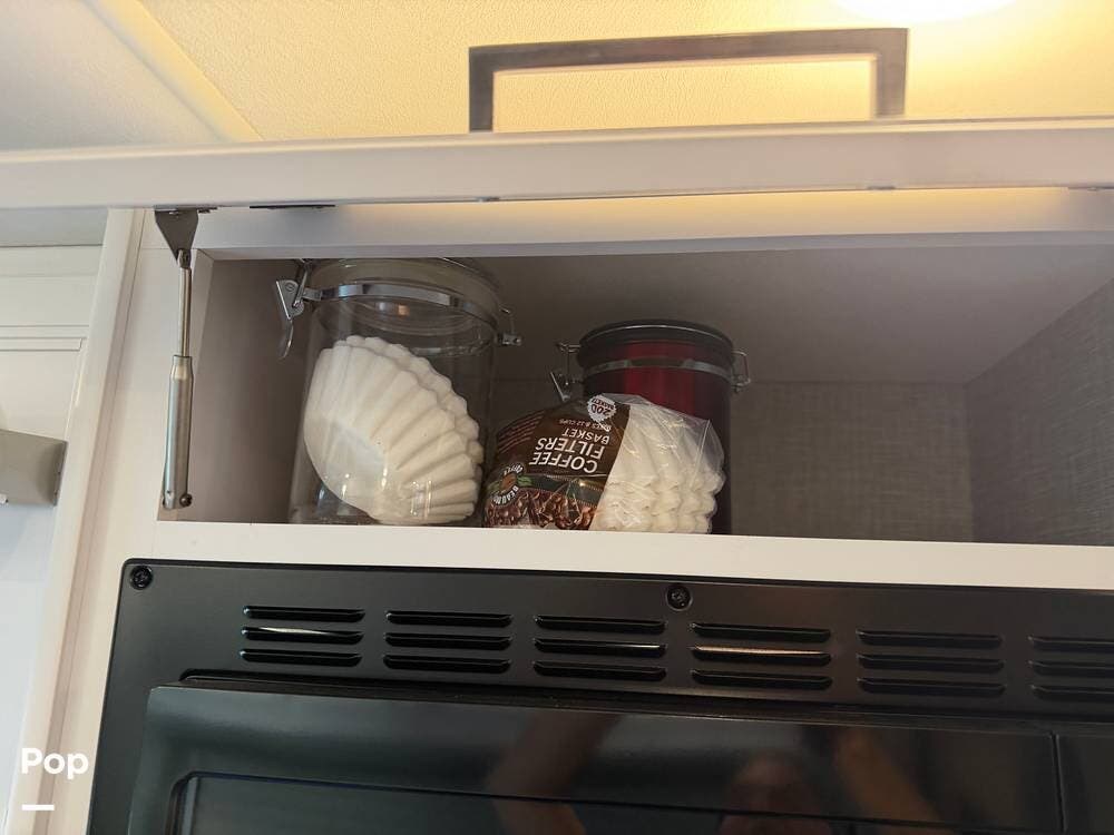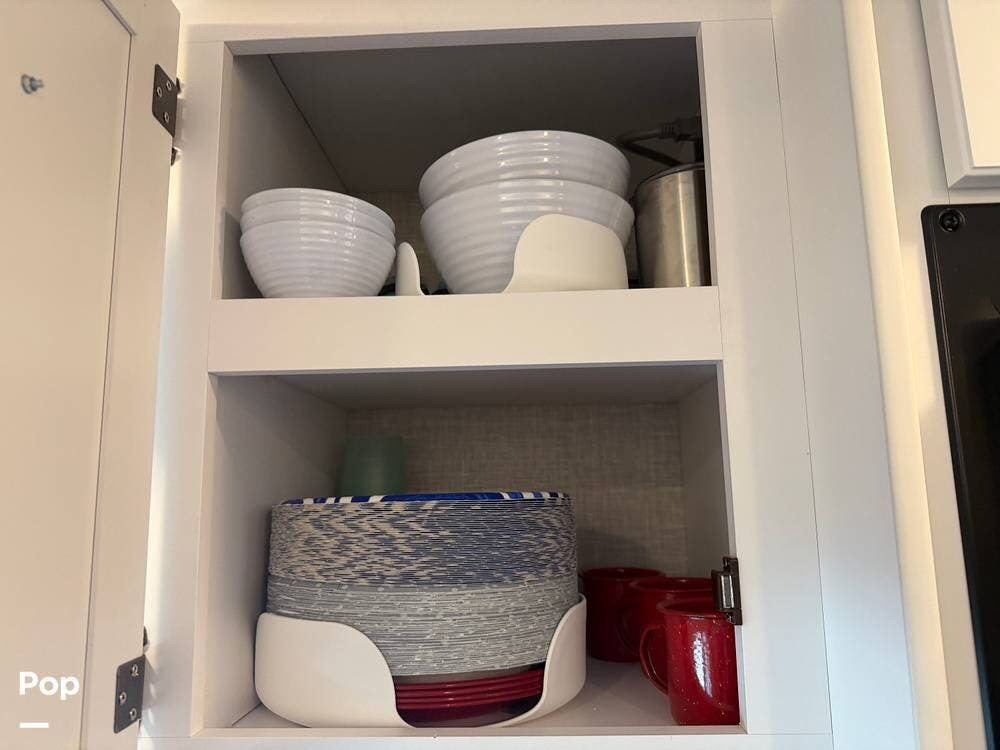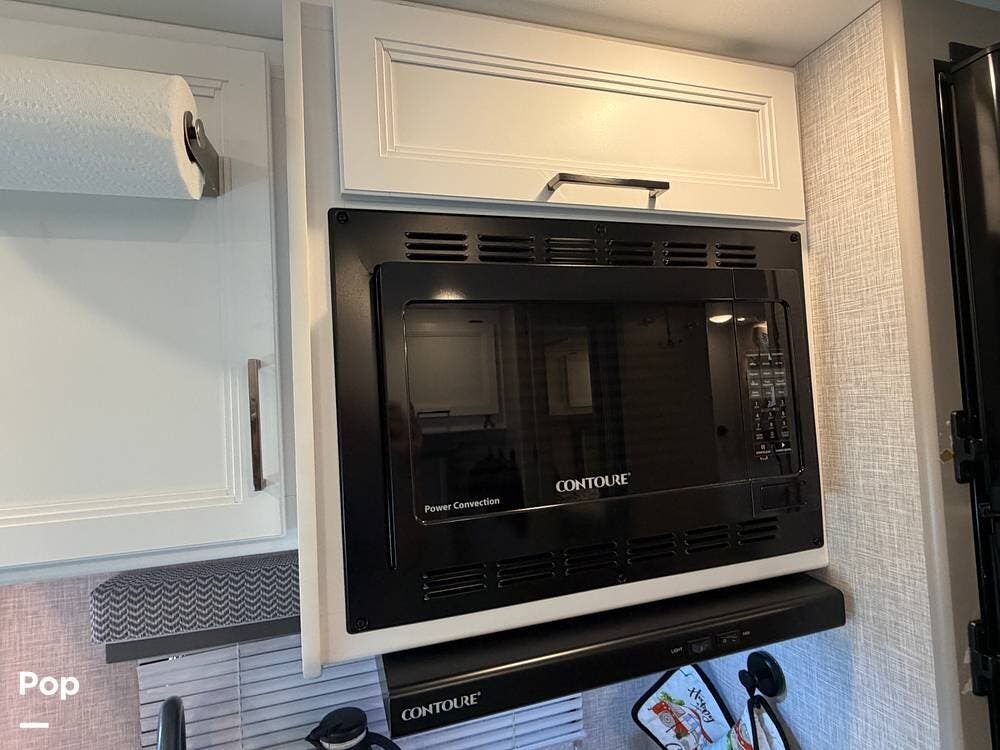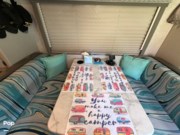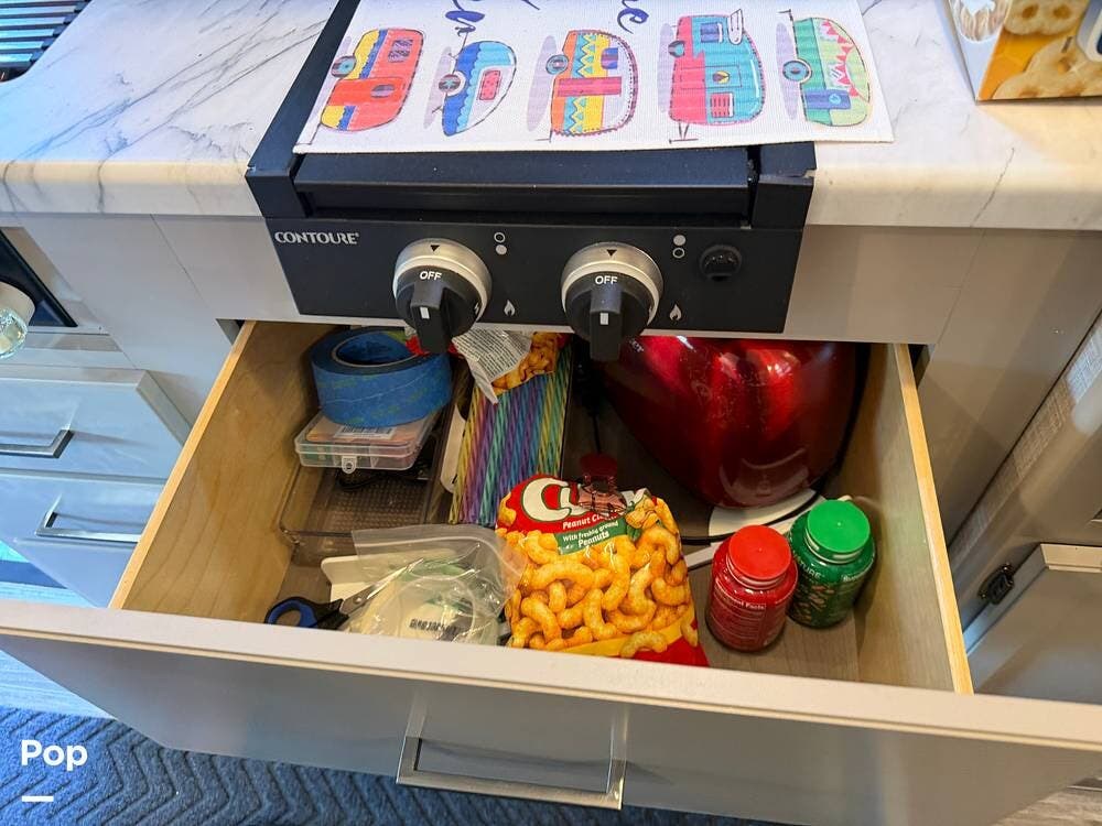 The Dream Dinette easily converts for guests, and the kitchen comes equipped with a convection microwave/air-fryer combo, two-burner cooktop, and great storage.