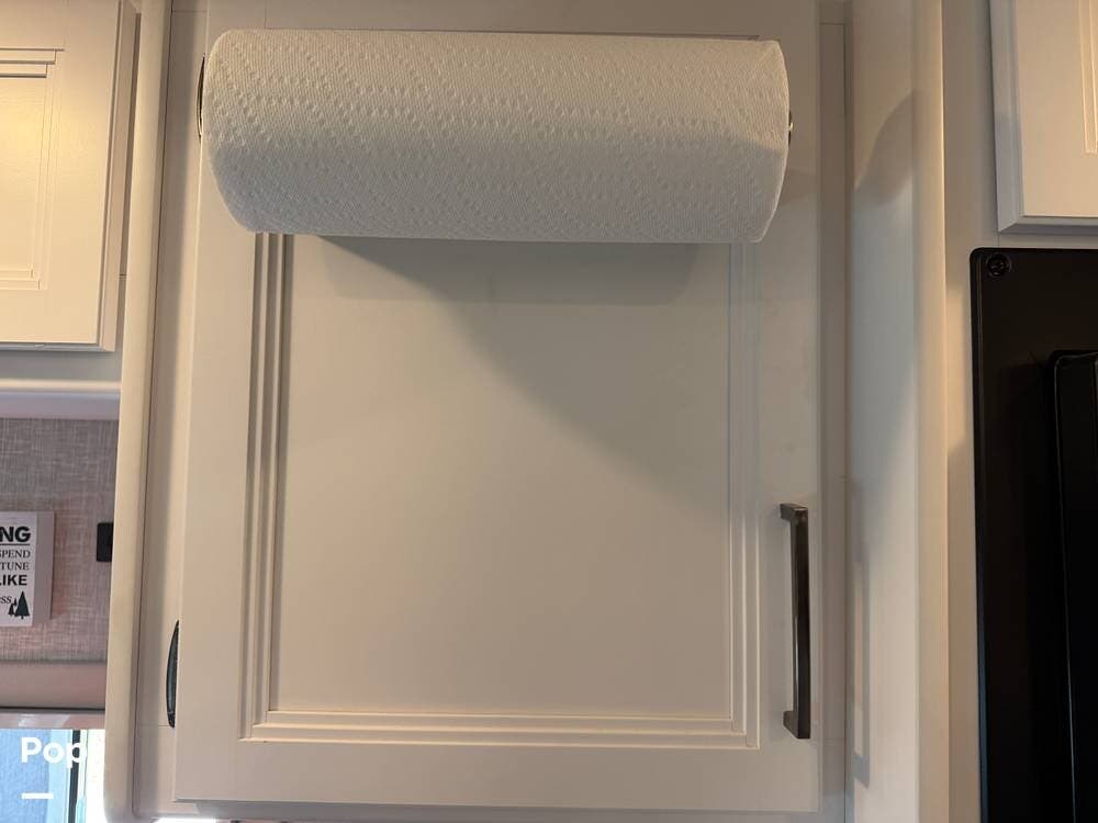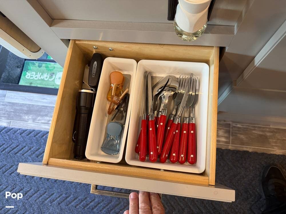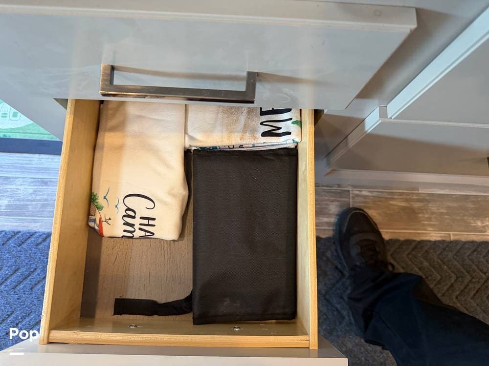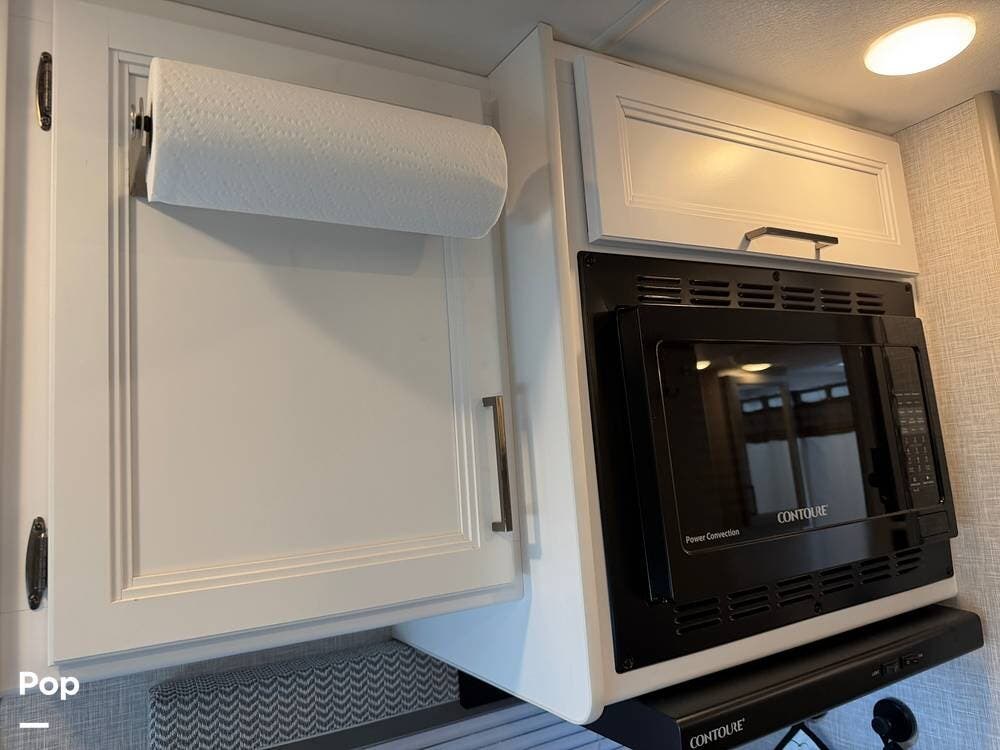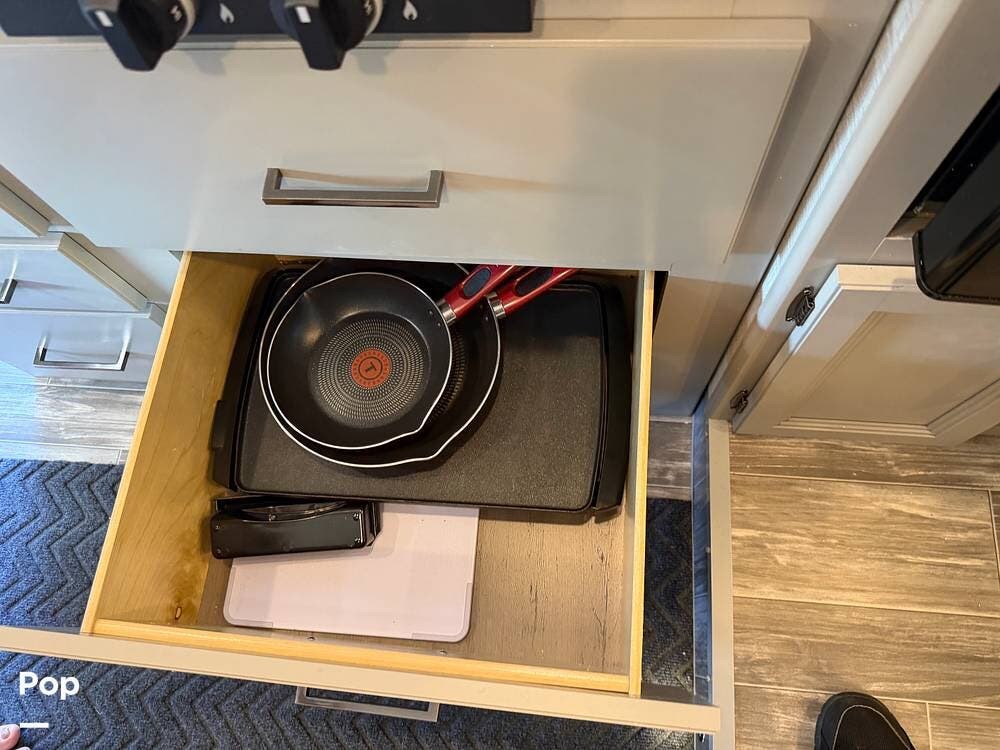 The Dream Dinette easily converts for guests, and the kitchen comes equipped with a convection microwave/air-fryer combo, two-burner cooktop, and great storage.