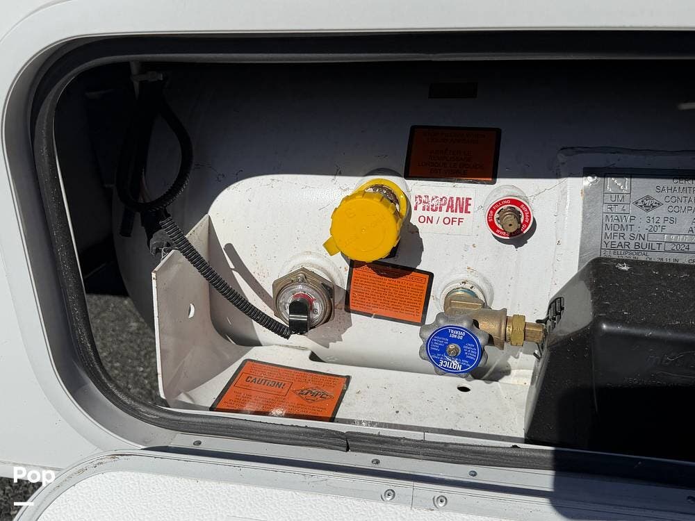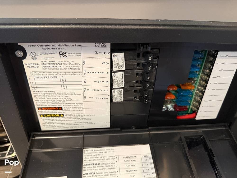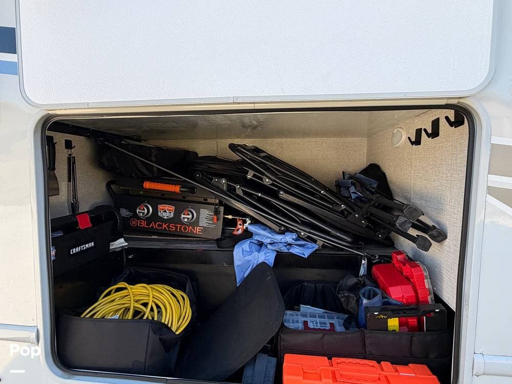 The exterior is built tough with a fiberglass front cap, aluminum framing, plenty of basement storage, and a 15' power awning with LED lighting for relaxing at camp.