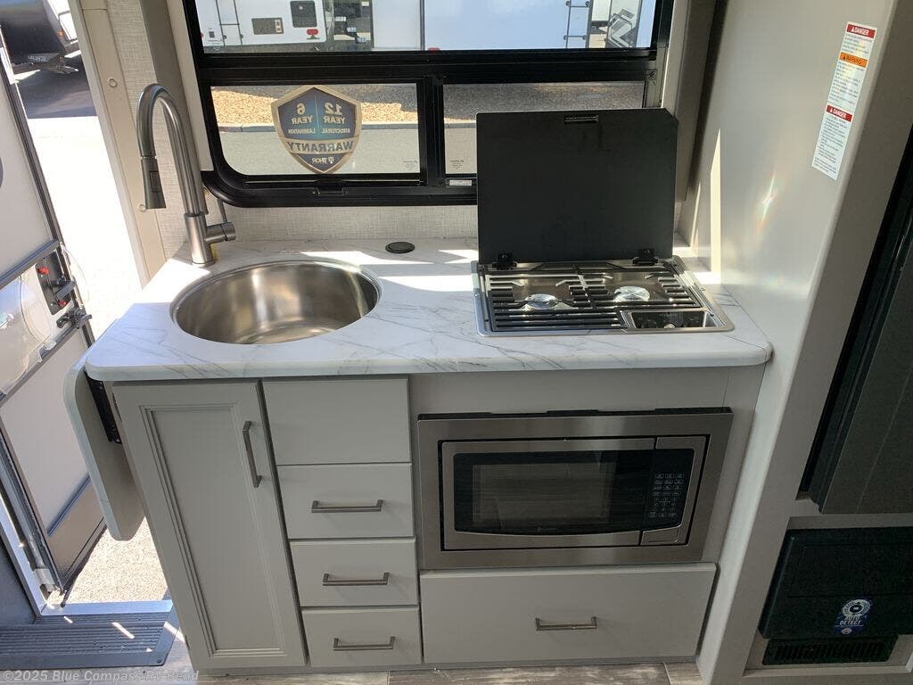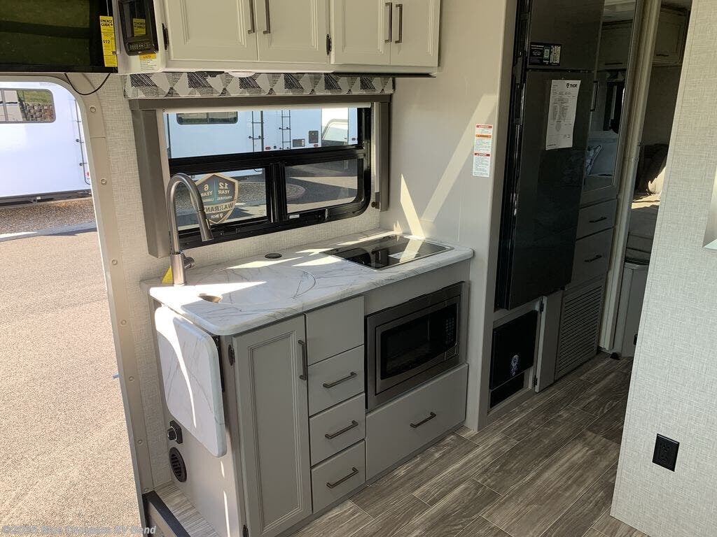 Since this coach features twin beds with a king bed conversion, you can travel with your friend or honey! Along with the versatile sleeping arrangements, you'll also enjoy the bedroom 32" LED Smart TV, and if you have any guests, they can sleep on the 66" sofa bed in the main living room. A full kitchen includes a two burner gas cooktop and convection microwave with an air fryer, along with a 12V DC double door refrigerator for food storage. There is a removable pedestal table in front of the sofa that will provide a place to dine together, or you can take your plate outdoors to relax under the power awning with LED lighting. The full bath with a 27" x 27" radius shower will let you freshen up each day, and the closet right across the hall will be perfect for clean clothes!