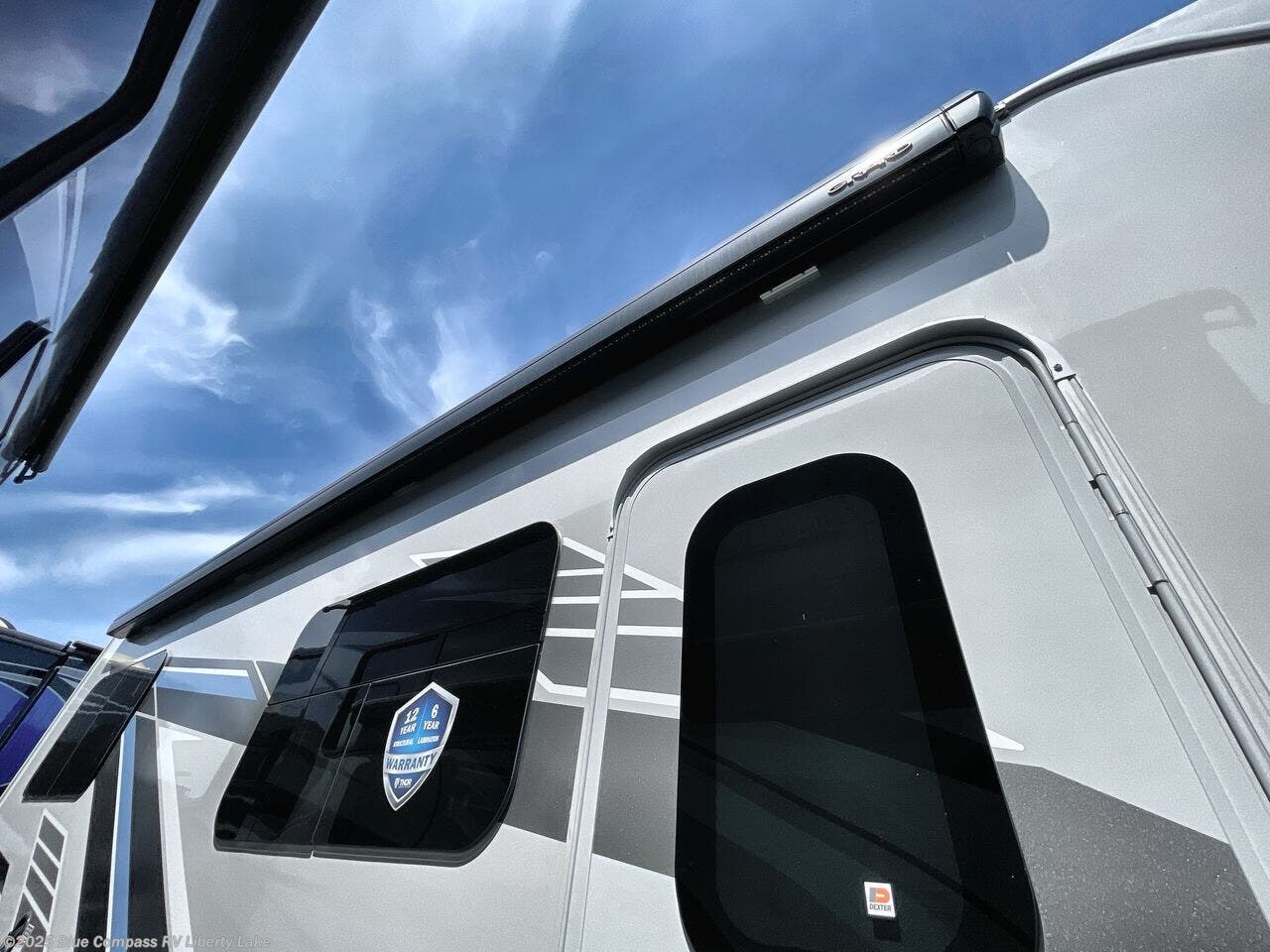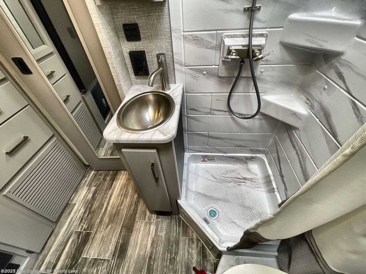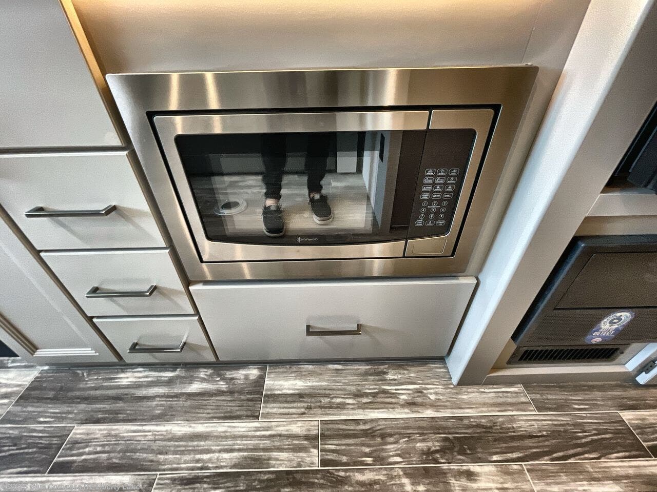 Since this coach features twin beds with a king bed conversion, you can travel with your friend or honey! Along with the versatile sleeping arrangements, you'll also enjoy the bedroom 32" LED Smart TV, and if you have any guests, they can sleep on the 66" sofa bed in the main living room. A full kitchen includes a two burner gas cooktop and convection microwave with an air fryer, along with a 12V DC double door refrigerator for food storage. There is a removable pedestal table in front of the sofa that will provide a place to dine together, or you can take your plate outdoors to relax under the power awning with LED lighting. The full bath with a 27" x 27" radius shower will let you freshen up each day, and the closet right across the hall will be perfect for clean clothes!