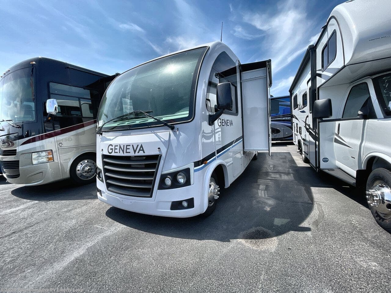 The Geneva Class A gas motorhome by Thor Motor Coach is easy to maneuver and even easier to love! There is a durable Ford E-Series chassis with a 7.3L V8 engine to power your trips both near and far. The durable construction includes a welded tubular steel floor, a one-piece fiberglass front cap, plus welded tubular aluminum roof and sidewall cage construction. And the driver is sure to appreciate the 10" touchscreen dash radio, back-up monitor, and reclining/swivel leatherette captain's chairs! Inside, you'll be met with residential vinyl flooring, pressed laminate countertops, a designer headboard and pillow shams, a shower skylight, and many more at-home comforts!