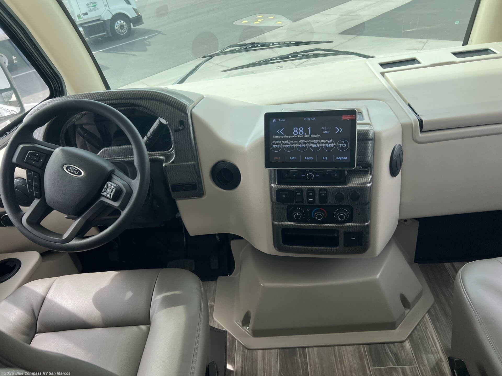 The Geneva Class A gas motorhome by Thor Motor Coach is easy to maneuver and even easier to love! There is a durable Ford E-Series chassis with a 7.3L V8 engine to power your trips both near and far. The durable construction includes a welded tubular steel floor, a one-piece fiberglass front cap, plus welded tubular aluminum roof and sidewall cage construction. And the driver is sure to appreciate the 10" touchscreen dash radio, back-up monitor, and reclining/swivel leatherette captain's chairs! Inside, you'll be met with residential vinyl flooring, pressed laminate countertops, a designer headboard and pillow shams, a shower skylight, and many more at-home comforts!