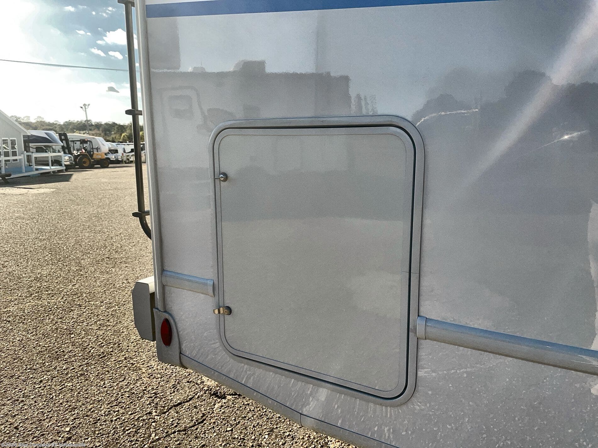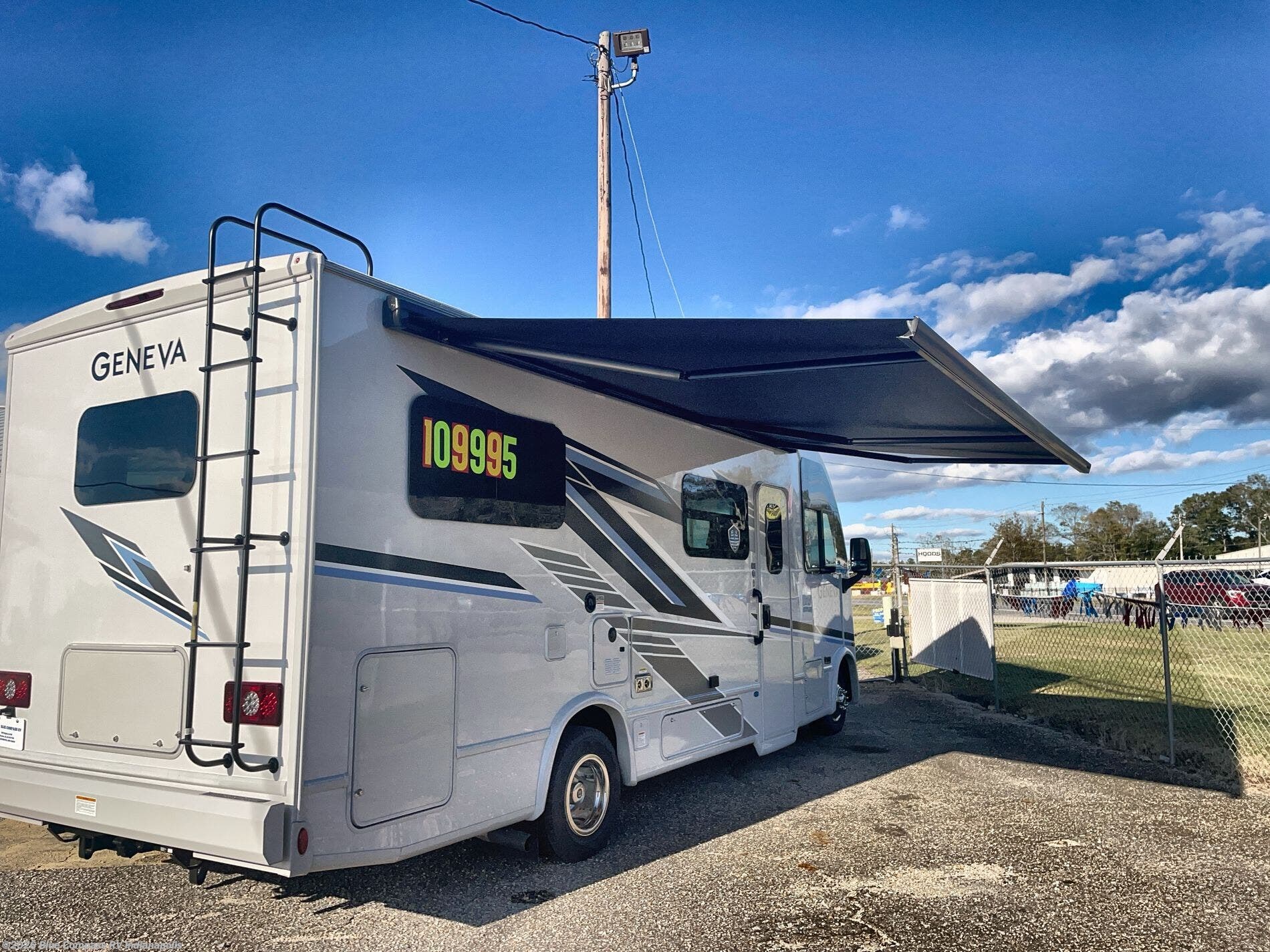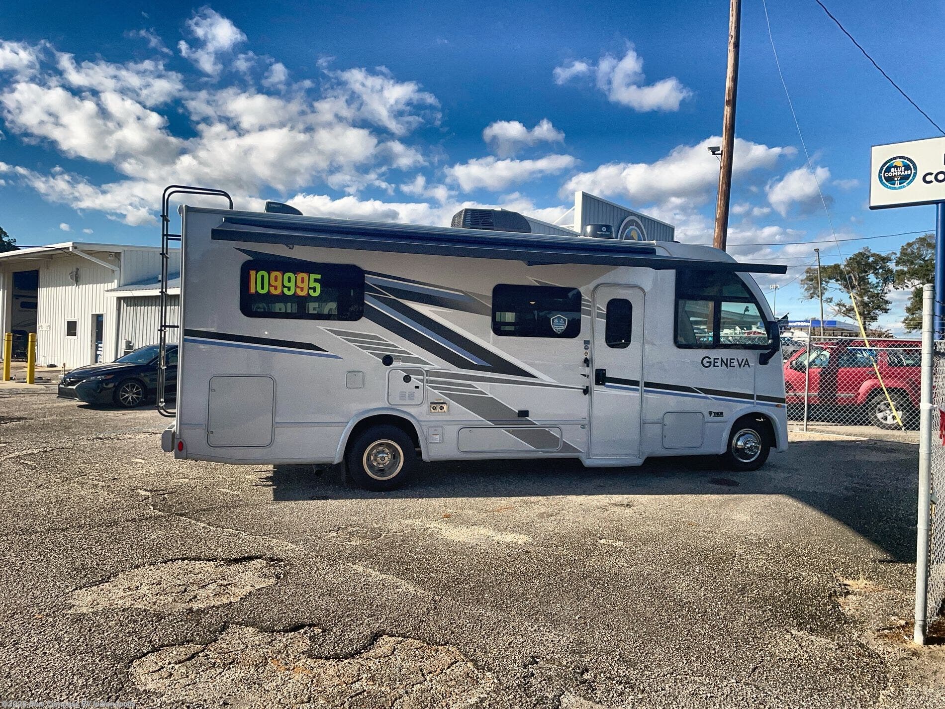 The Geneva Class A gas motorhome by Thor Motor Coach is easy to maneuver and even easier to love! There is a durable Ford E-Series chassis with a 7.3L V8 engine to power your trips both near and far. The durable construction includes a welded tubular steel floor, a one-piece fiberglass front cap, plus welded tubular aluminum roof and sidewall cage construction. And the driver is sure to appreciate the 10" touchscreen dash radio, back-up monitor, and reclining/swivel leatherette captain's chairs! Inside, you'll be met with residential vinyl flooring, pressed laminate countertops, a designer headboard and pillow shams, a shower skylight, and many more at-home comforts!