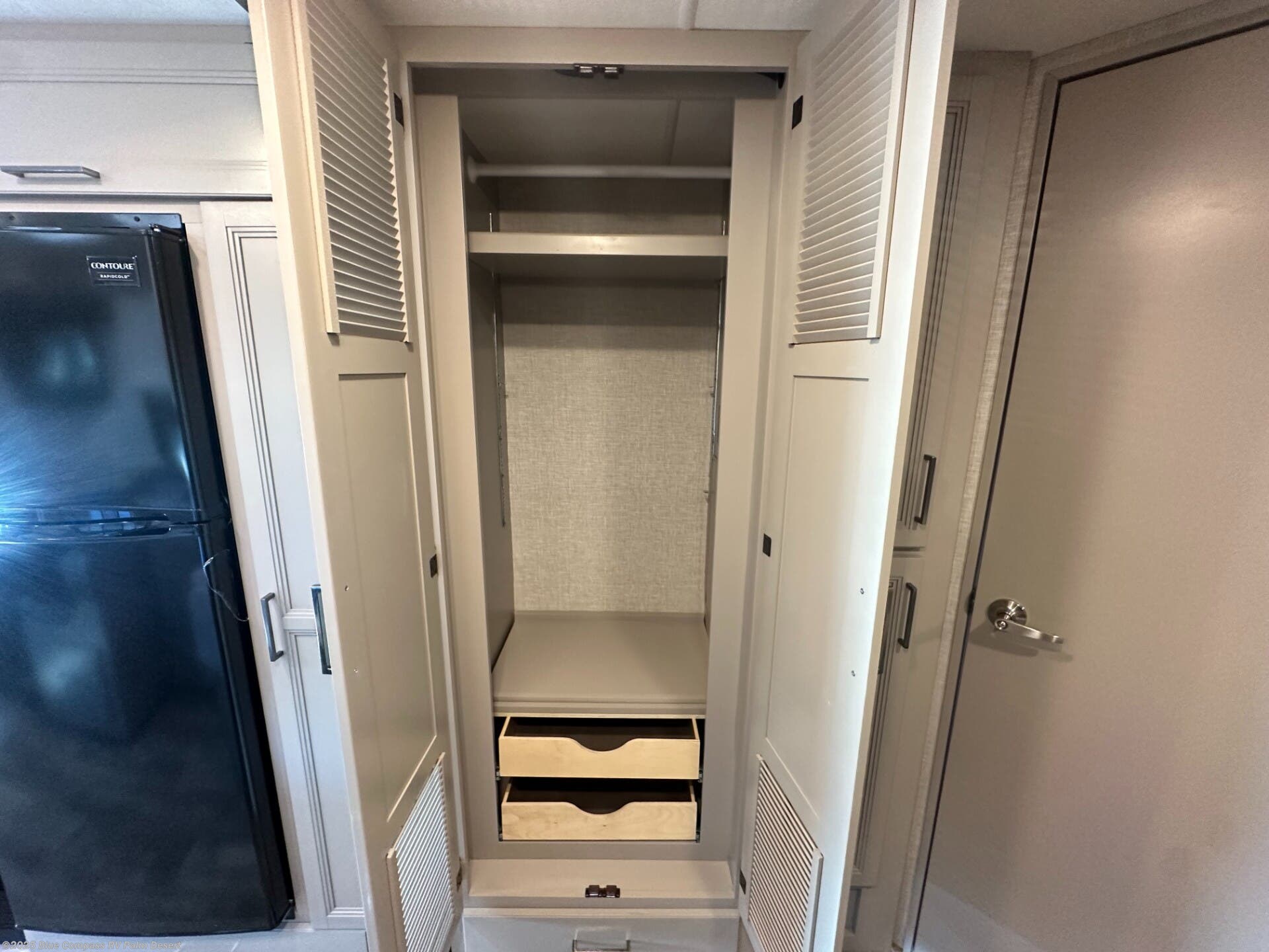 Enjoy a private bedroom with a king bed, large closet, and TV prep! The bathroom is also located in the rear corner for additional privacy. Abundant storage includes a linen closet plus an area prepped for a washer/dryer so you can do your laundry on the road. Relax on the theater seats while watching the Smart TV. You'll also appreciate the additional 52" x 96" sleeping area in the cab-over bunk so you can bring along guests. The kitchen is fully equipped with a three-burner cooktop, refrigerator, microwave, and flip-up countertop for extra prep space, and a roomy 70" dream dinette is the perfect place to enjoy your meals. Outside you will enjoy watching the exterior TV under the power awning.