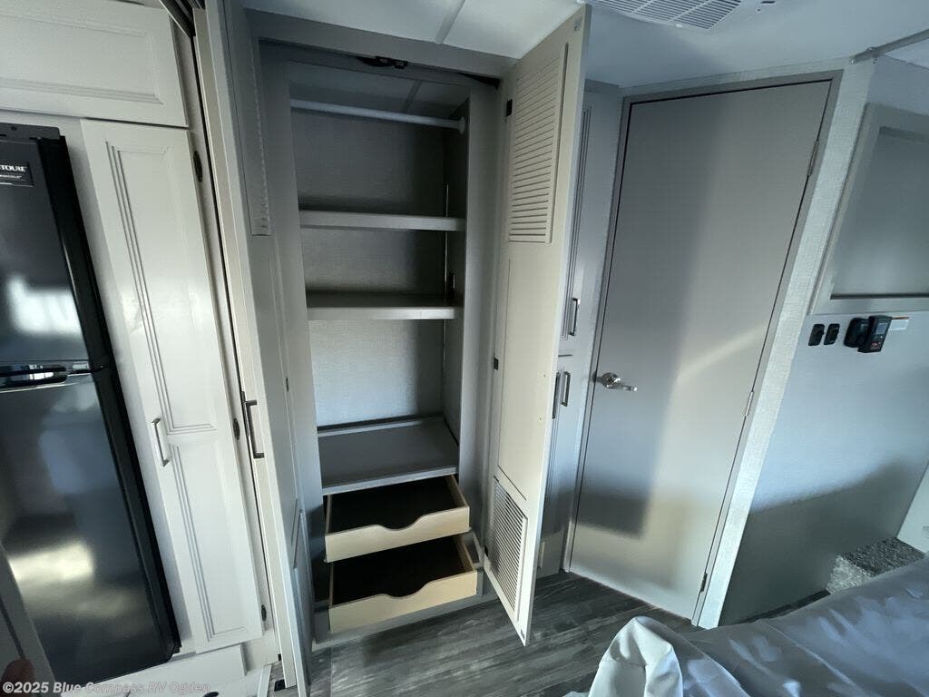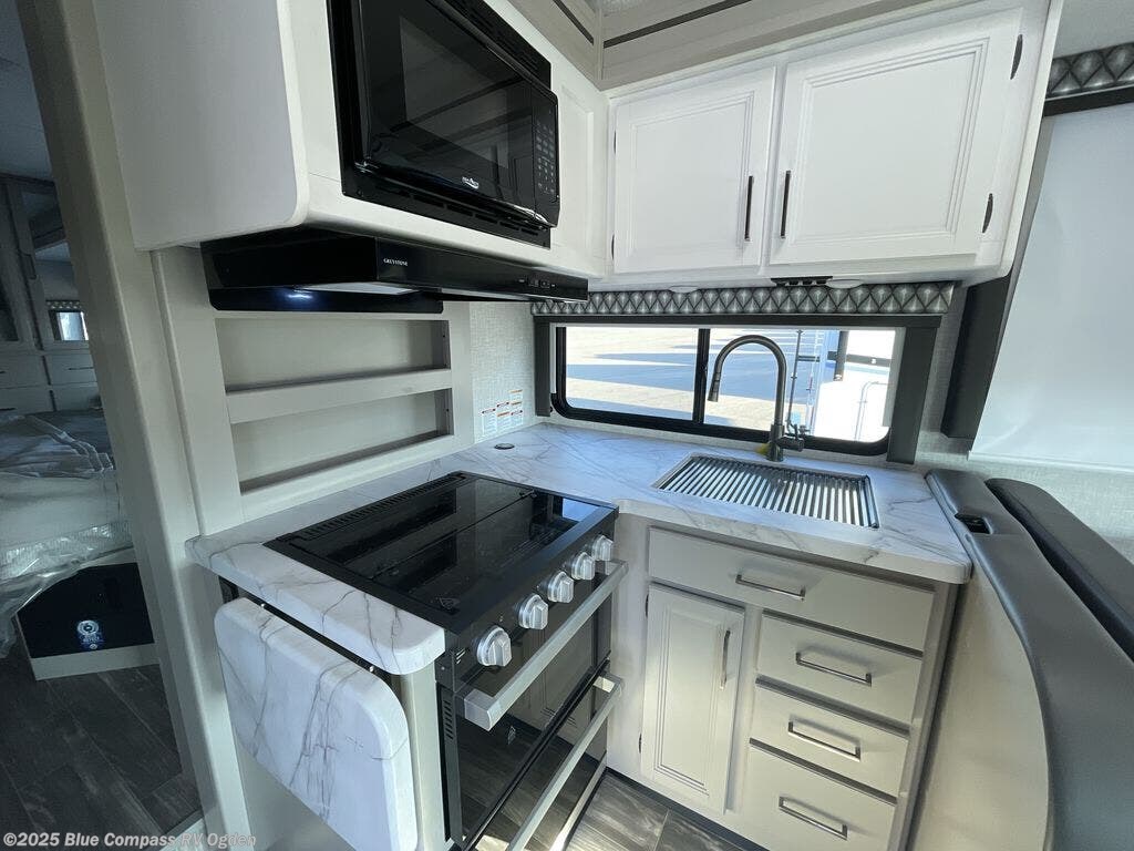 Enjoy a private bedroom with a king bed, large closet, and TV prep! The bathroom is also located in the rear corner for additional privacy. Abundant storage includes a linen closet plus an area prepped for a washer/dryer so you can do your laundry on the road. Relax on the theater seats while watching the Smart TV. You'll also appreciate the additional 52" x 96" sleeping area in the cab-over bunk so you can bring along guests. The kitchen is fully equipped with a three-burner cooktop, refrigerator, microwave, and flip-up countertop for extra prep space, and a roomy 70" dream dinette is the perfect place to enjoy your meals. Outside you will enjoy watching the exterior TV under the power awning.