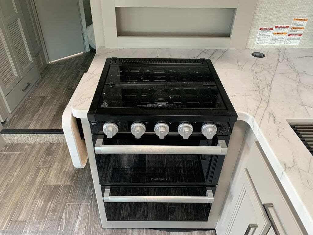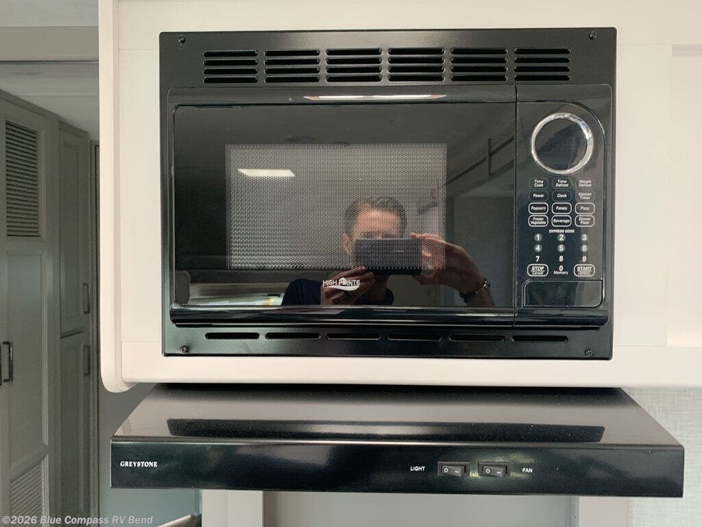 Enjoy a private bedroom with a king bed, large closet, and TV prep! The bathroom is also located in the rear corner for additional privacy. Abundant storage includes a linen closet plus an area prepped for a washer/dryer so you can do your laundry on the road. Relax on the theater seats while watching the Smart TV. You'll also appreciate the additional 52" x 96" sleeping area in the cab-over bunk so you can bring along guests. The kitchen is fully equipped with a three-burner cooktop, refrigerator, microwave, and flip-up countertop for extra prep space, and a roomy 70" dream dinette is the perfect place to enjoy your meals. Outside you will enjoy watching the exterior TV under the power awning.