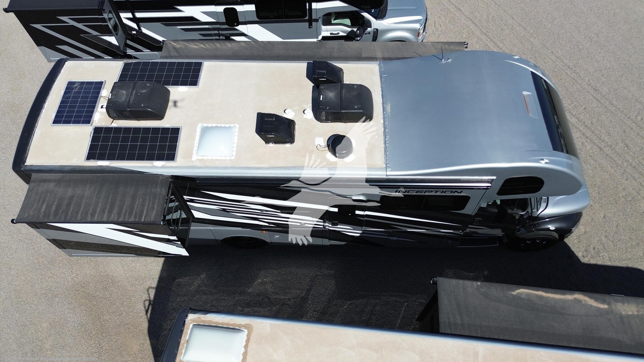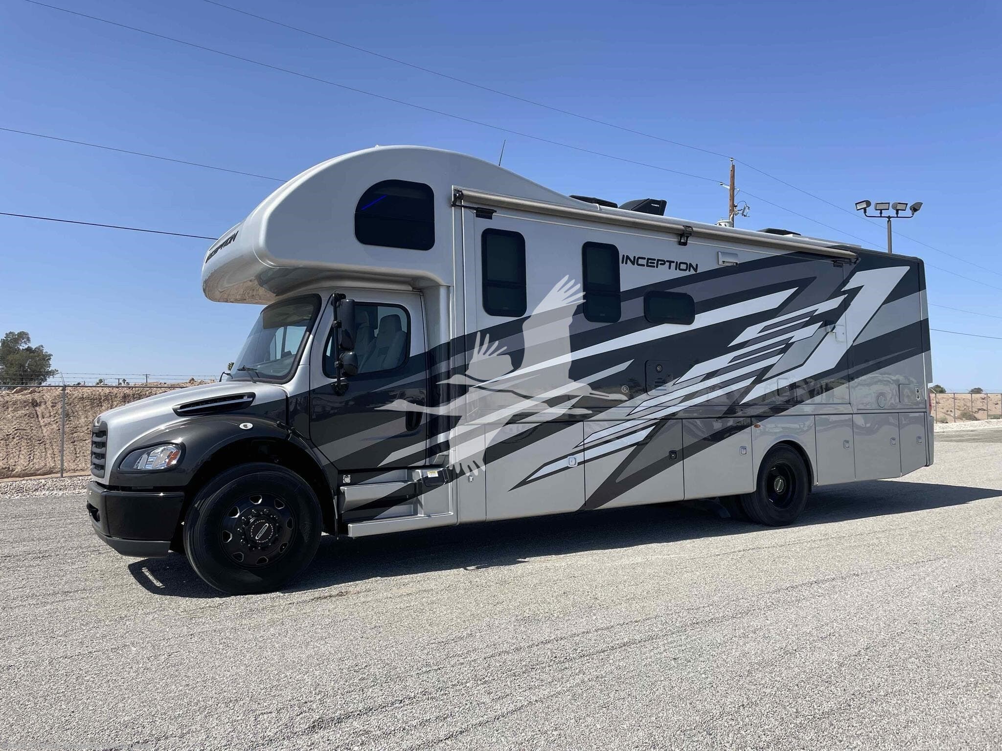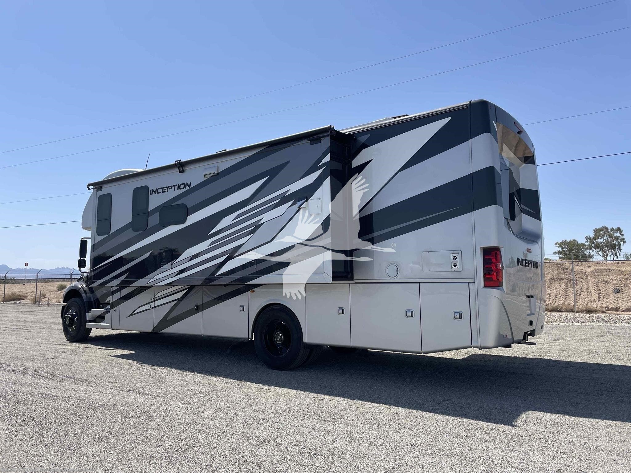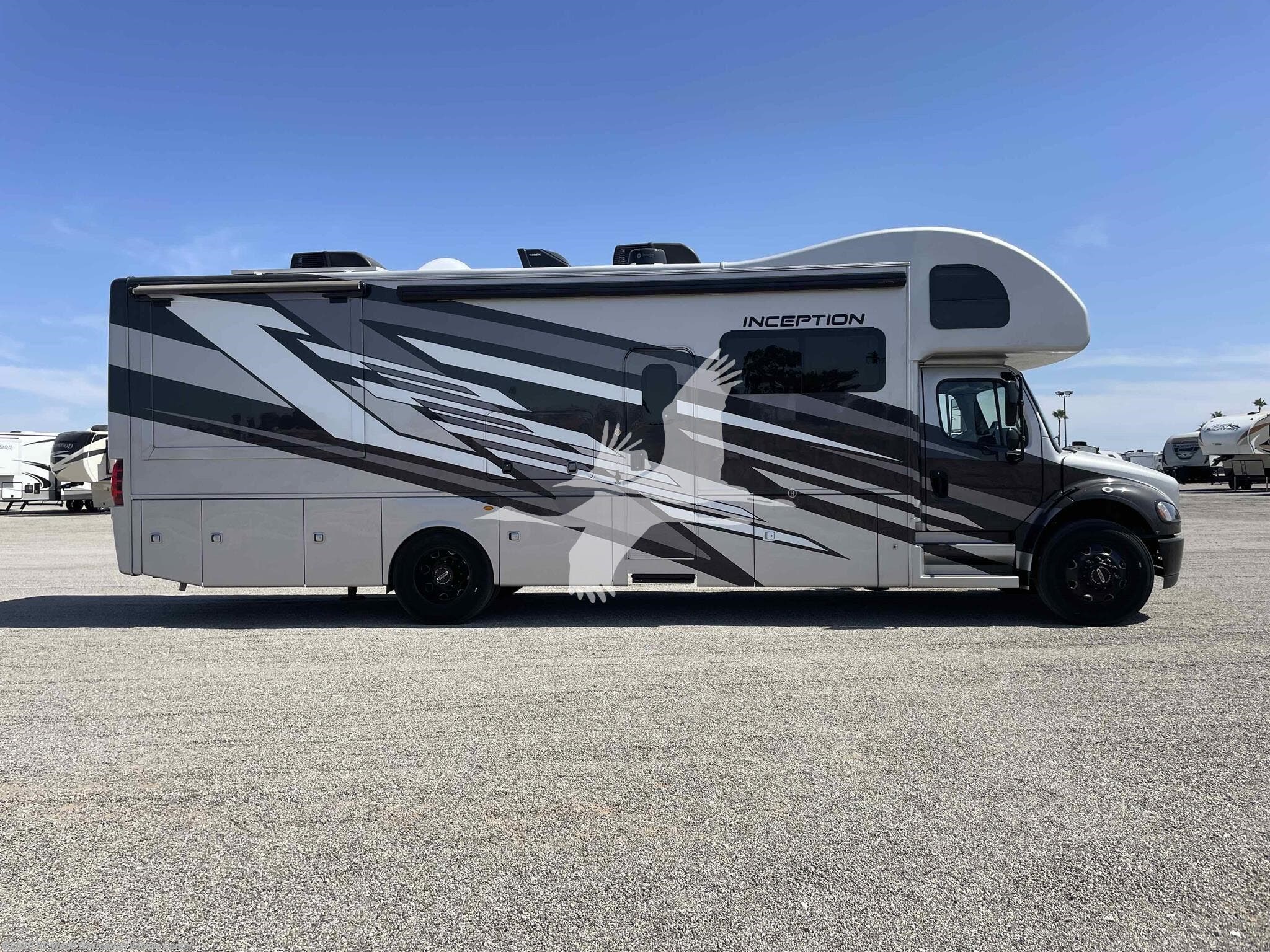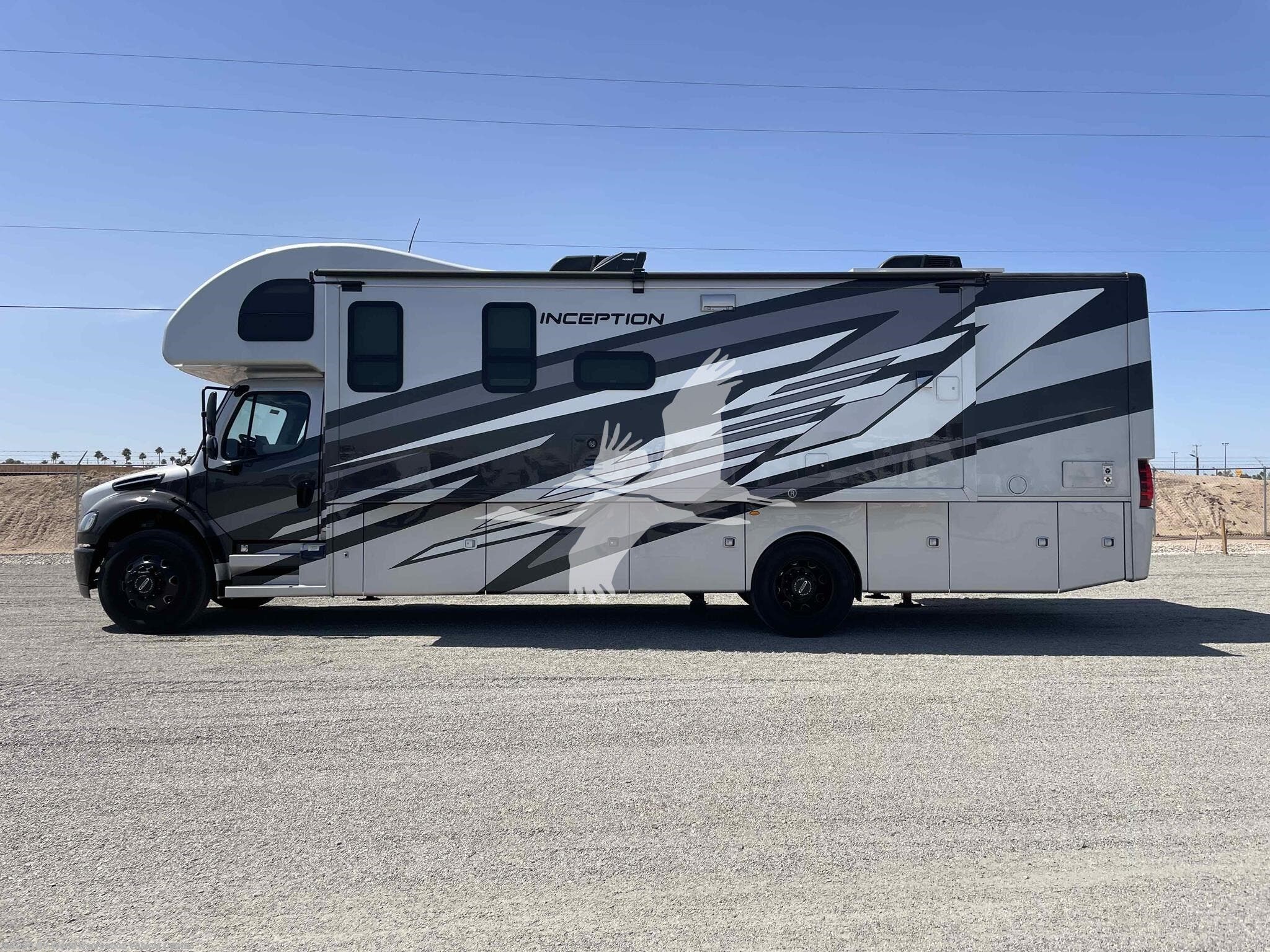 Stk#: TH18759. --------- ON SPECIAL- JUST REDUCED!!! --------- Inception is a traveler’s dream, seamlessly combining comfort and functionality. Its sleek, well-designed layouts make it the perfect choice for those seeking to embrace the RV lifestyle. From its versatile living spaces to its efficient storage solutions, this motorhome offers the freedom to explore the world while enjoying all the conveniences of home. Built on the Freightliner® S2RV chassis with an Atlas™ Foundation, Inception powers your adventures thanks to the Cummins 6.7-liter ISB-XT engine with 360 horsepower and 800 lb-ft torque. Enjoy a smooth ride with the air-ride adjustable driver and passenger captain’s chairs. Plus, make road trips easier with the help of convenient features like cruise control, heated/remote exterior mirrors, and a side-view camera system. The Stealth Black-Out Package is a game-changer for those who want a sleek, rugged ride. This standard exterior includes blacked-out wheels, bumper, grille, air intake, logos, and exterior mirrors to elevate the motorhome's appearance. There’s also an optional Chrome Chassis Accents Package available for those who prefer a more classic look. With these designs, you can make a stylish statement on the road or at any campsite. The 34XG offers a spacious living area with theater seating and 72" Dream Dinette booth, with a 42" LED TV. The front driver and passenger seats can swivel for extra seating! The cab also features a cab-over bunk for sleeping arrangements in addition to the dinette booth. The kitchen is equipped with a residential refrigerator, an induction cooktop, a convection microwave, and a pantry. The master bedroom has a king-size Tilt-A-View inclining bed, a wardrobe, stackable washer and dryer units, and a 32-inch LED TV. The Master bathroom features a large one-piece-molded shower, a porcelain toilet, and a vanity with plenty of cabinet space for linens, the other half-bath is perfect for guests. Other features include an Onan 8.0-KW Quiet Diesel generator, a hydraulic auto-leveling system, a 400-watt solar charging system, 1800-watt inverter, a tankless water heater, dual 15,000-BTU air conditioners with a heat pumps, exterior 40" LED TV, and much more...