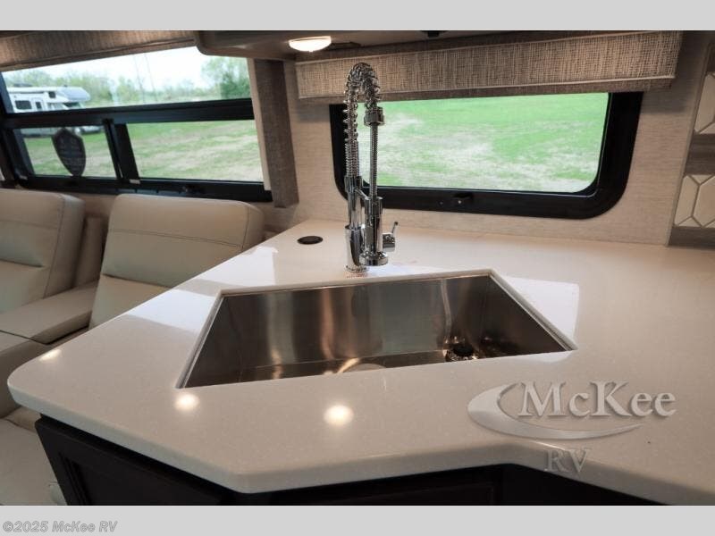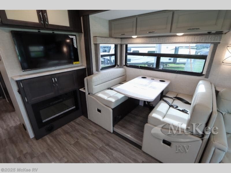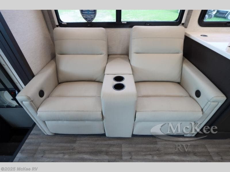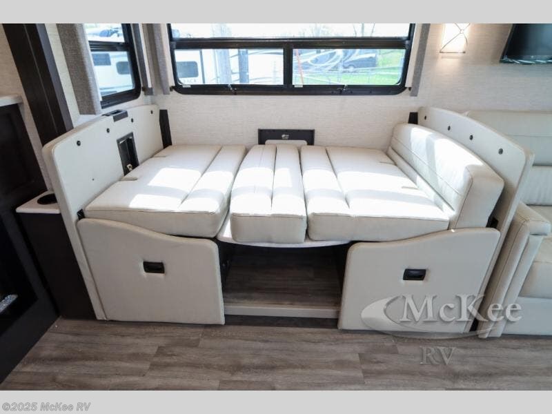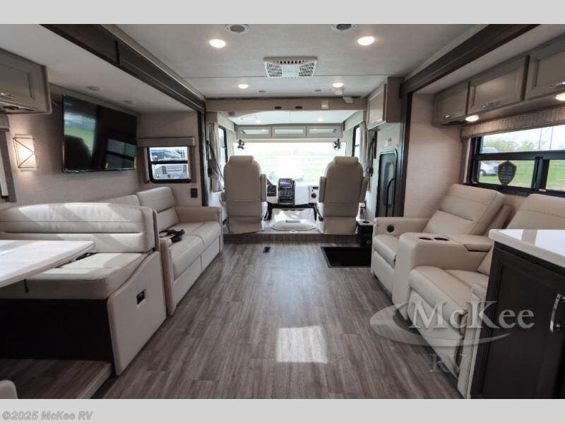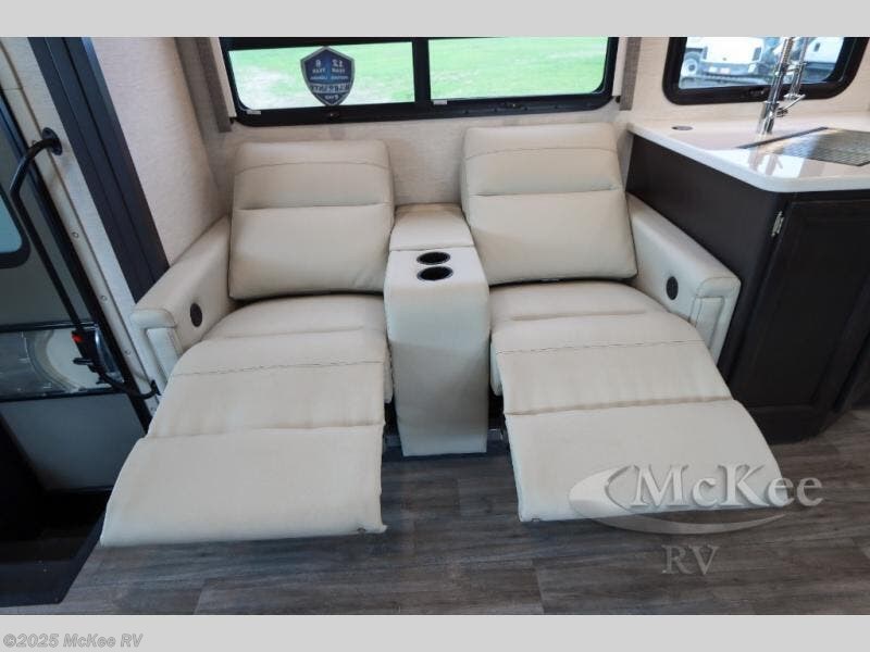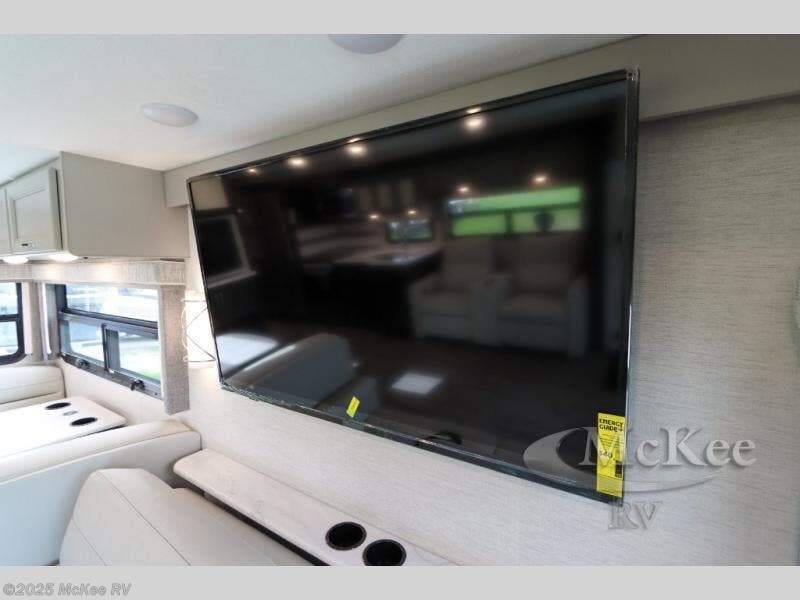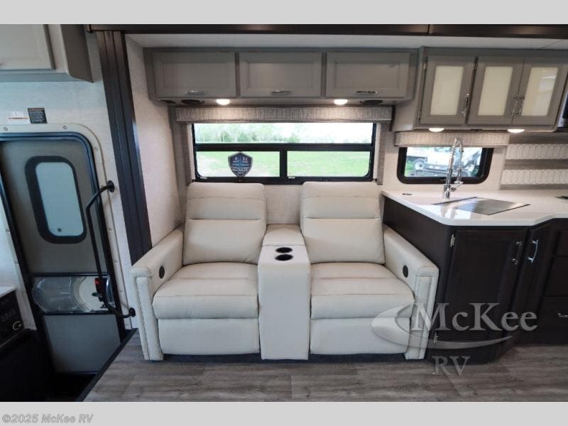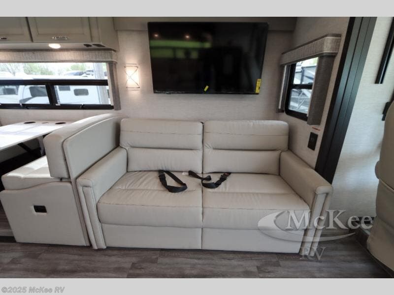 This spacious Class A motorhome has room to sleep eight! Enjoy the privacy of the rear king bedroom which has a spacious closet and a 32" LED Smart TV. Extra guests can utilize the Dream Dinette, the sofa bed, or the drop-down overhead bunk which has a Cotton Cloud mattress for comfort. As if that's not enough, there's a pair of leatherette theater seats with footrests so you can kick back and watch either the 39" or 50" LED Smart TV in the living room. You'll also find another TV outside. A full bath with 30" x 36" shower is conveniently located in the center so everyone has access, and the glass shower door and skylight make it feel roomy. The kitchen features a three-burner gas cooktop and oven, refrigerator, and stainless steel convection microwave. You will also appreciate the closet with stackable washer and dryer prep if you want to add those appliances!