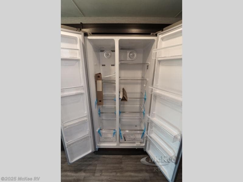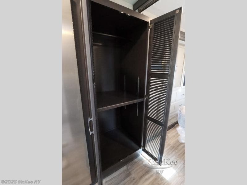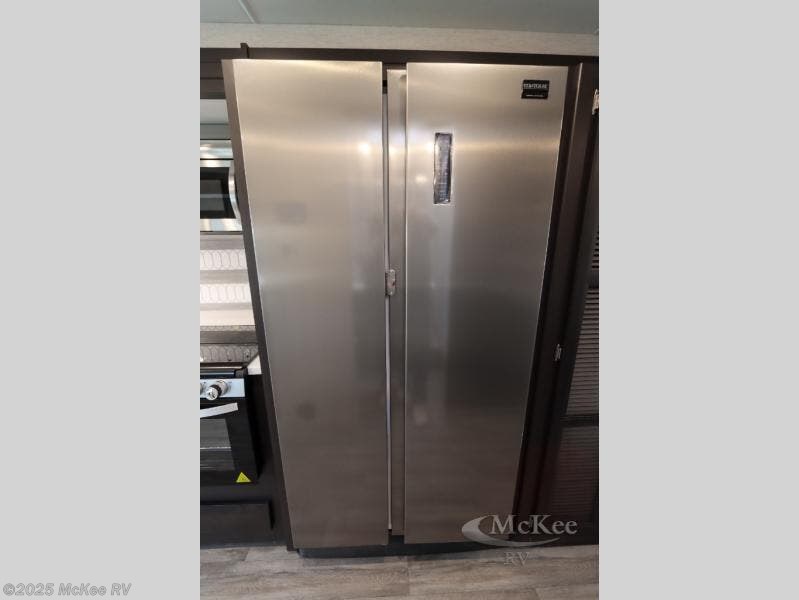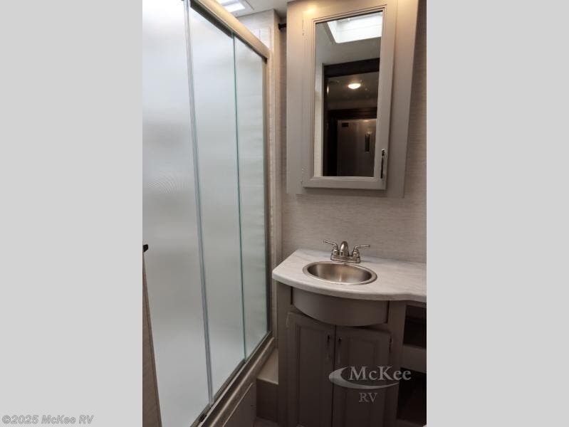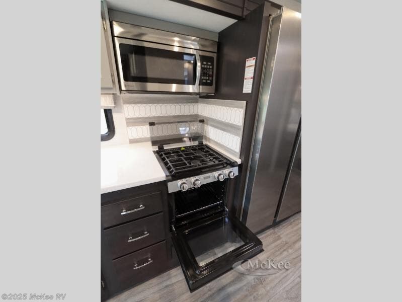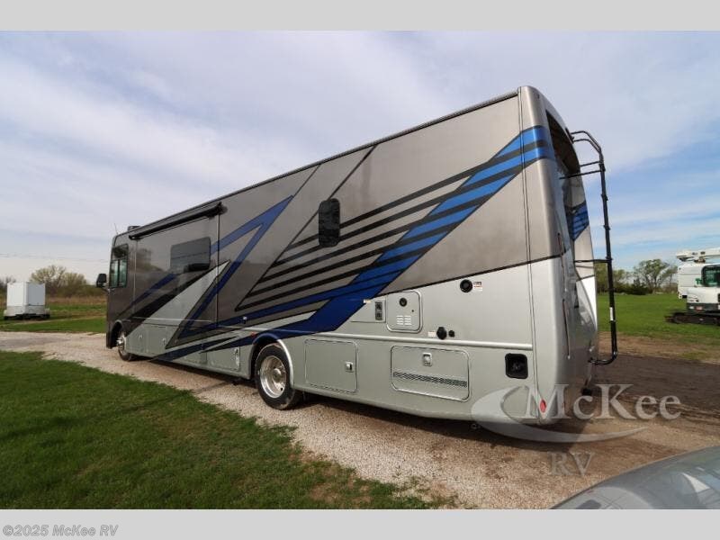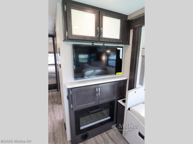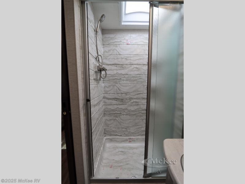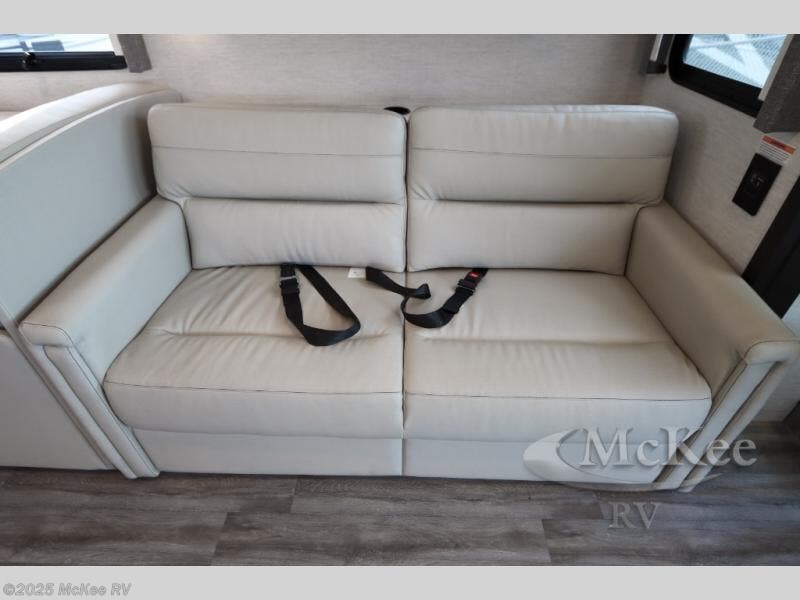 This spacious Class A motorhome has room to sleep eight! Enjoy the privacy of the rear king bedroom which has a spacious closet and a 32" LED Smart TV. Extra guests can utilize the Dream Dinette, the sofa bed, or the drop-down overhead bunk which has a Cotton Cloud mattress for comfort. As if that's not enough, there's a pair of leatherette theater seats with footrests so you can kick back and watch either the 39" or 50" LED Smart TV in the living room. You'll also find another TV outside. A full bath with 30" x 36" shower is conveniently located in the center so everyone has access, and the glass shower door and skylight make it feel roomy. The kitchen features a three-burner gas cooktop and oven, refrigerator, and stainless steel convection microwave. You will also appreciate the closet with stackable washer and dryer prep if you want to add those appliances!