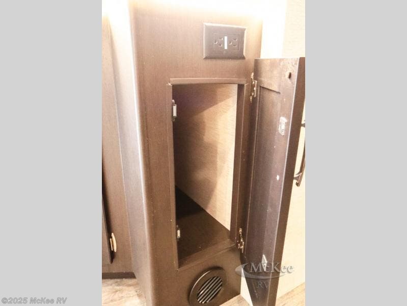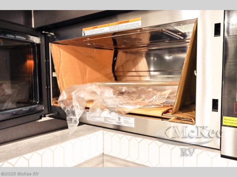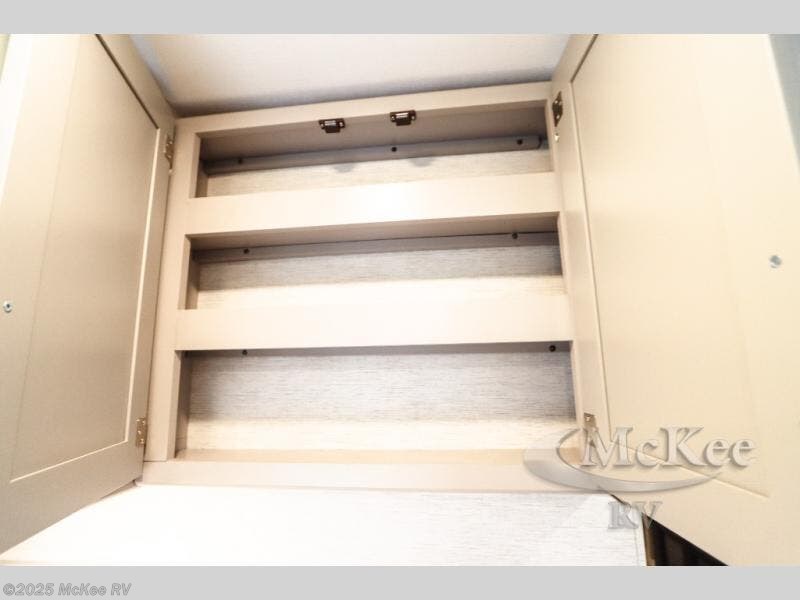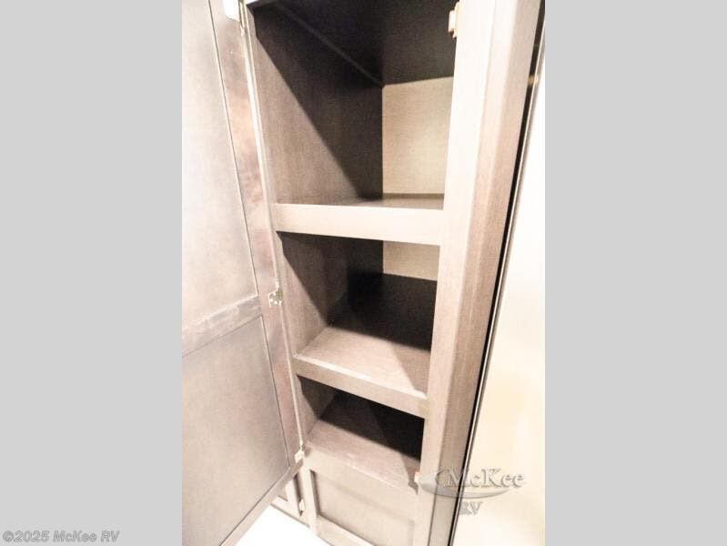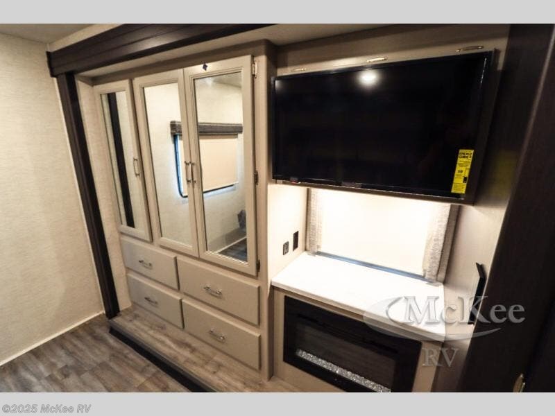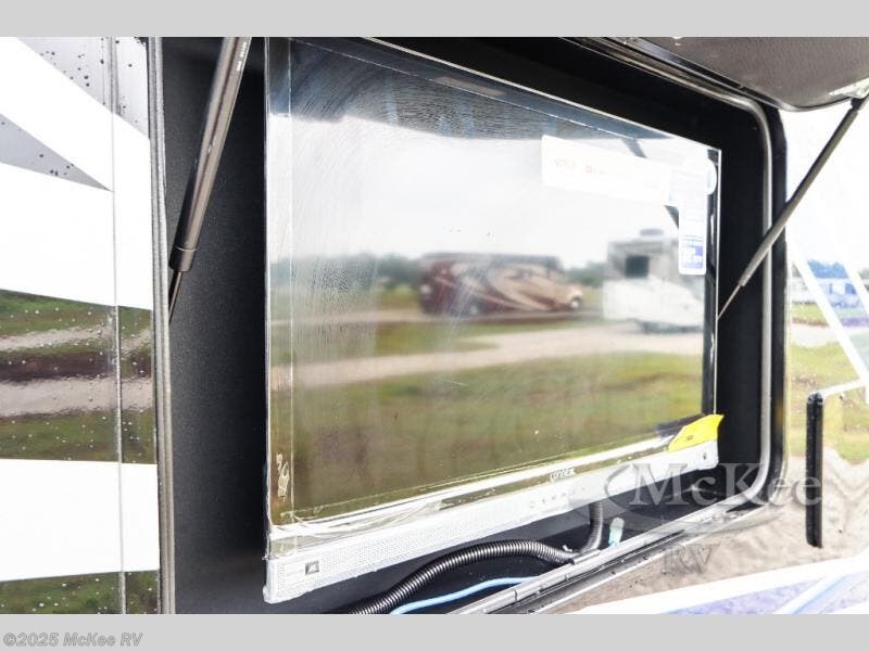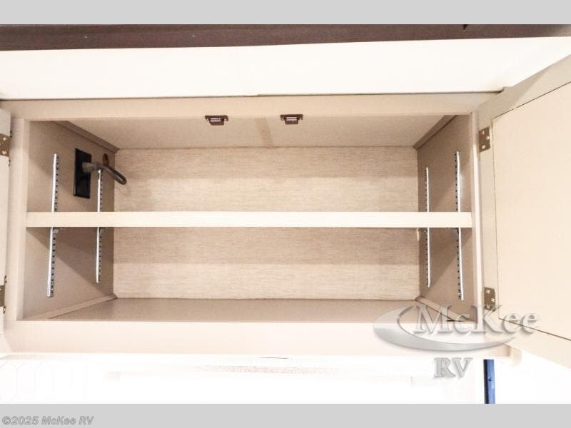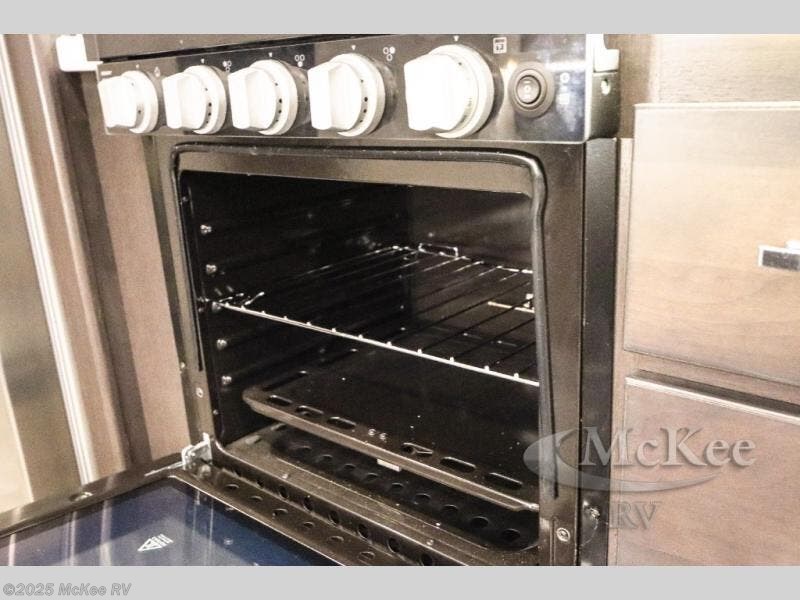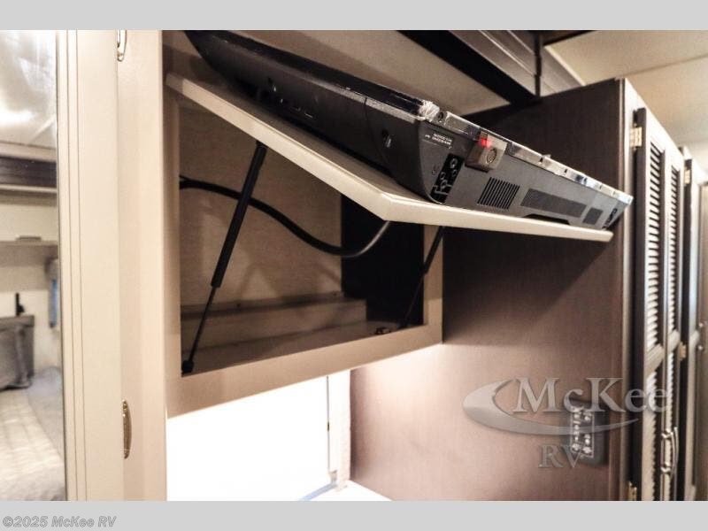 Enjoy added space and comfort in this coach with a full-wall slide out plus a second slide out in the rear bedroom. You will sleep soundly each night on the king bed, and you can easily grab a clean clothes from the closet and head to the full bath close by. Your guests can sleep on the Dream Dinette or on the drop-down overhead bunk with a 48" x 74" sleeping area. Once everyone is clean up and ready for the day, you can prepare breakfast on the three burner gas cooktop or in the 30" stainless steel over-the-range convection microwave. There is also a residential refrigerator and a pantry to store food for your trip. You will also enjoy spending time outdoors with a power awning with LED lights and an exterior 32" Smart TV with a Bluetooth built-in soundbar and radio!