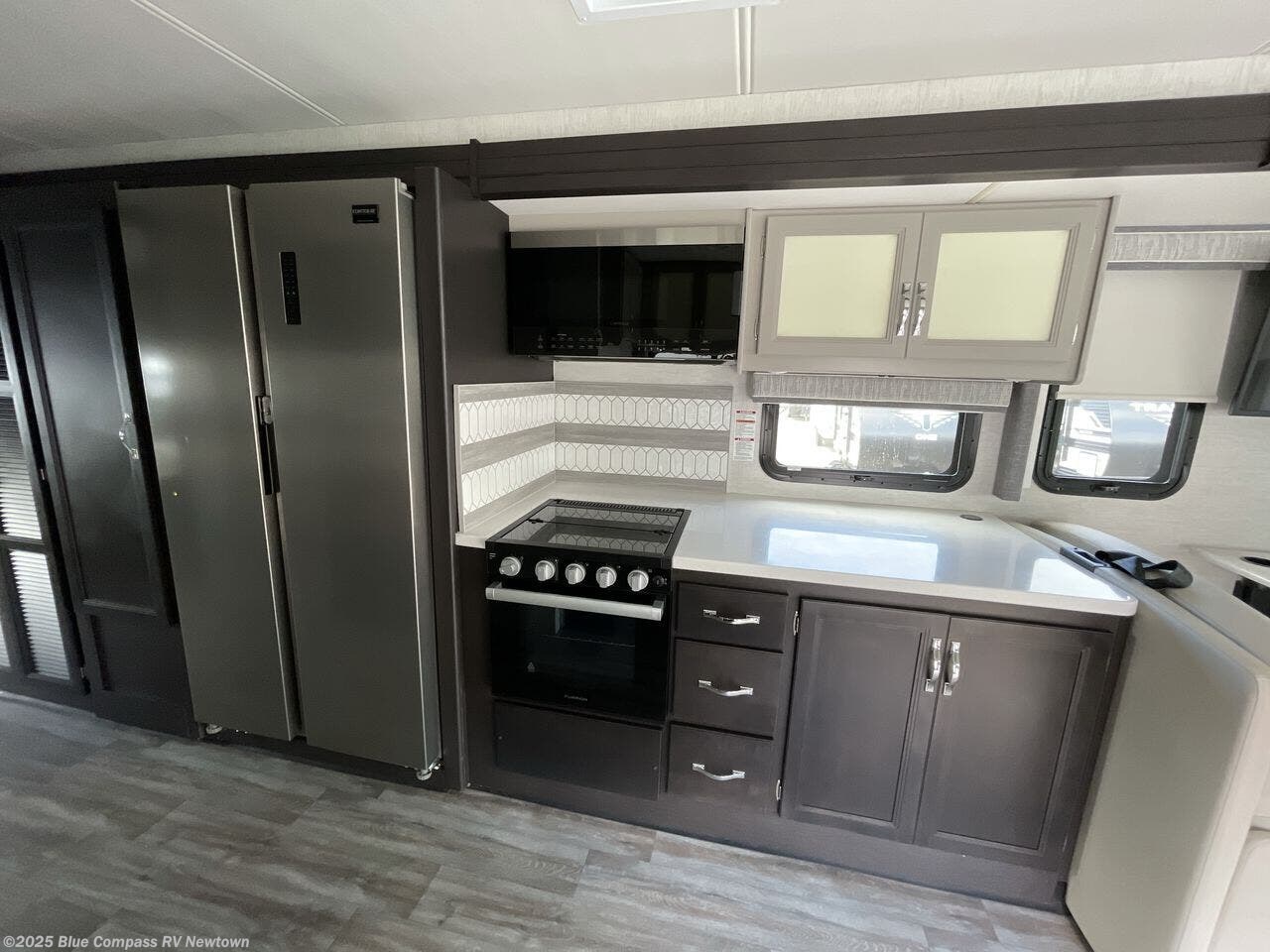 Enjoy added space and comfort in this coach with a full-wall slide out plus a second slide out in the rear bedroom. You will sleep soundly each night on the king bed, and you can easily grab a clean clothes from the closet and head to the full bath close by. Your guests can sleep on the Dream Dinette or on the drop-down overhead bunk with a 48" x 74" sleeping area. Once everyone is clean up and ready for the day, you can prepare breakfast on the three burner gas cooktop or in the 30" stainless steel over-the-range convection microwave. There is also a residential refrigerator and a pantry to store food for your trip. You will also enjoy spending time outdoors with a power awning with LED lights and an exterior 32" Smart TV with a Bluetooth built-in soundbar and radio!