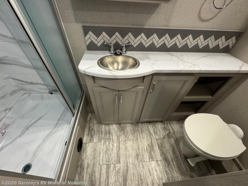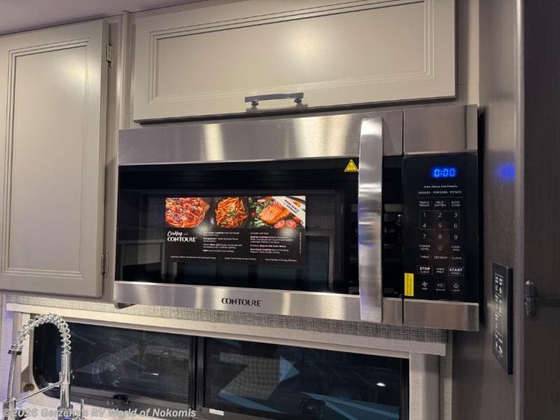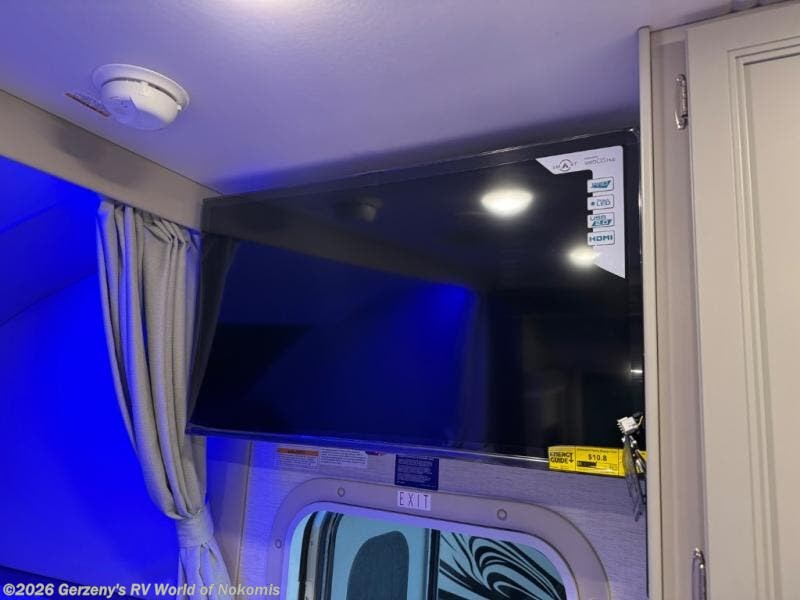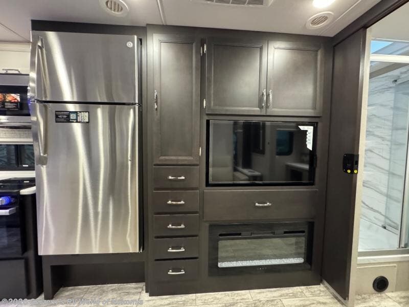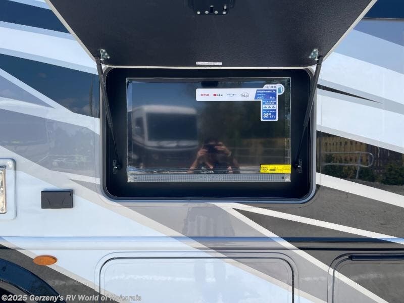 Relax in the full rear bathroom, featuring a spacious 30” x 36” shower. The living area boasts a versatile sofa with a murphy bed, perfect for guests or extra sleeping space. Cozy up by the fireplace, enjoy your favorite shows on the TV, and organize your stuff in the ample shelving and storage. The closet also provides additional space for your belongings. The kitchen is a culinary dream, equipped with a pantry, drawers, fridge, three-burner cooktop, and a microwave. Gather with family and friends at the 70” dream dinette, perfect for meals and game nights. Additional sleeping space is available in the front bunk over the cab, and when you're ready to take the party outside, enjoy your favorite shows on the exterior TV.