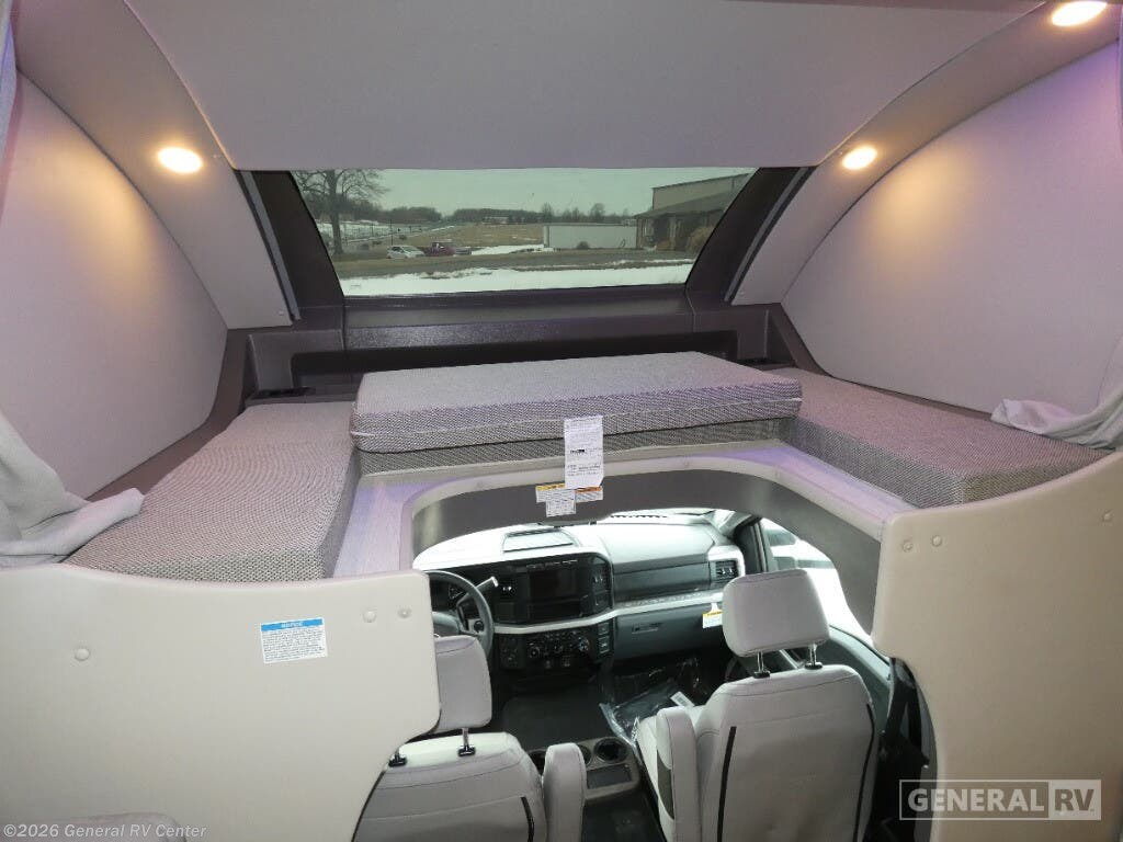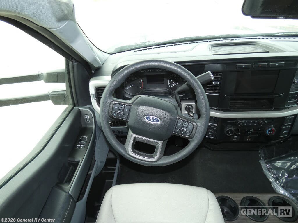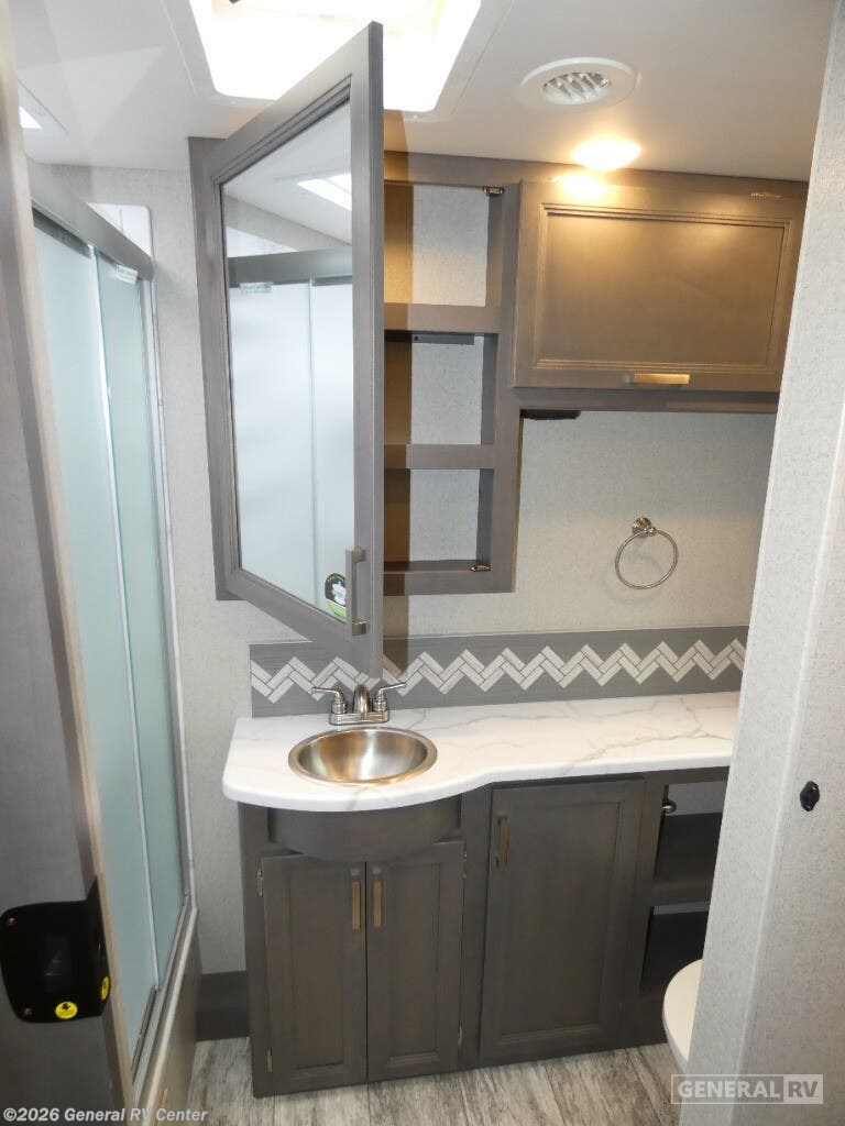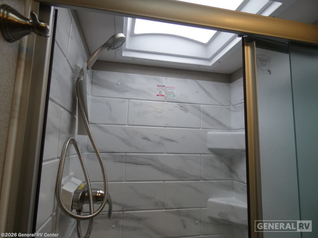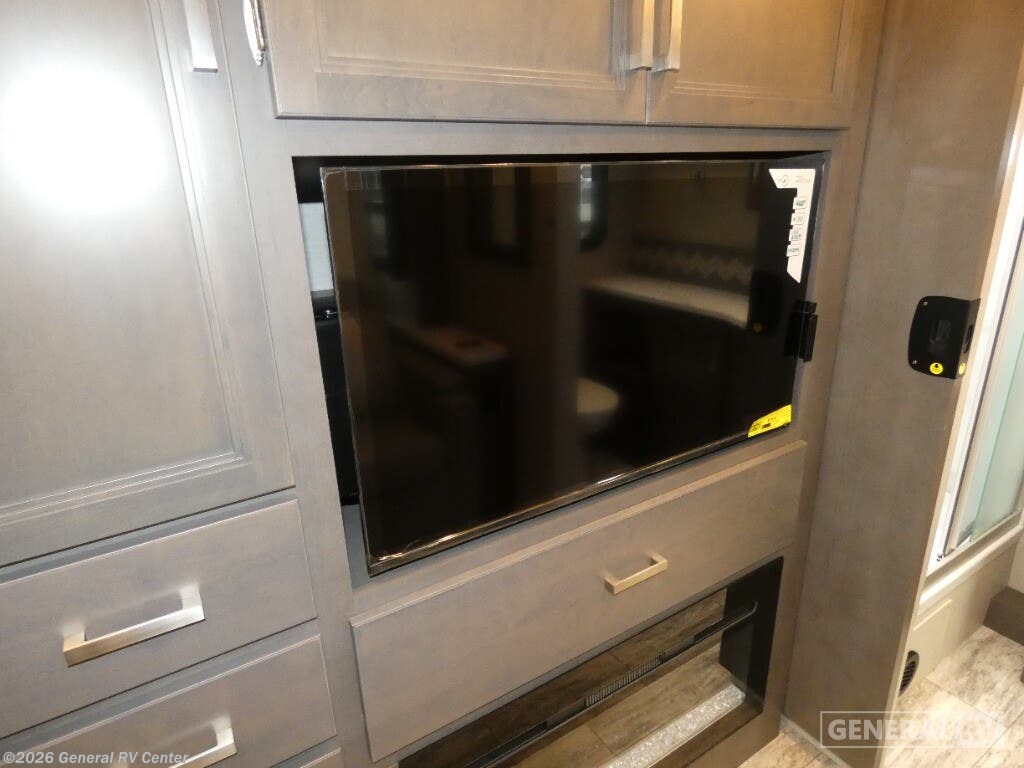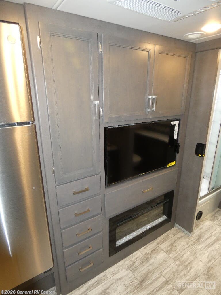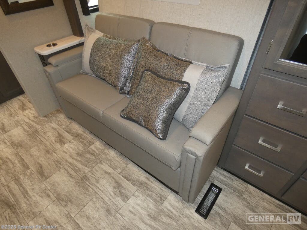 Thor Motor Coach Magnitude GRAND Super C diesel motorhome S29 highlights: Sofa with Murphy Bed Bunk Over Cab Fireplace Rear Bathroom Relax in the full rear bathroom, featuring a spacious 30” x 36” shower. The living area boasts a versatile sofa with a murphy bed, perfect for guests or extra sleeping space. Cozy up by the fireplace, enjoy your favorite shows on the TV, and organize your stuff in the ample shelving and storage. The closet also provides additional space for your belongings. The kitchen is a culinary dream, equipped with a pantry, drawers, fridge, three-burner cooktop, and a microwave. Gather with family and friends at the 70” dream dinette, perfect for meals and game nights. Additional sleeping space is available in the front bunk over the cab, and when you're ready to take the party outside, enjoy your favorite shows on the exterior TV. The Magnitude GRAND Super C diesel motorhomes by Thor Motor Coach are built to last, featuring Vacu-bond laminated roofs and floors with block foam insulation for unparalleled durability and climate control which ensures a comfortable and quiet living space. Stay connected and entertained on the go with the innovative sync-enhanced voice recognition communication and entertainment system. With just the sound of your voice, you can control everything from navigation to music playlists. Setting up camp has never been easier, thanks to our automatic leveling jacks with a touchpad, simply press a button and let the system do the work for you. Inside, you'll enjoy incredible interior features like a spacious 84” interior ceiling height, perfect for comfortable living, solid countertops, designer headboard, bedspread, and pillow shams. Plus you can beat the heat with the dual 13,500 BTU roof air conditioners, providing superior cooling power to keep you comfortable in even the warmest climates. Explore our motorhome collection today and discover a new standard of luxury and adventure.