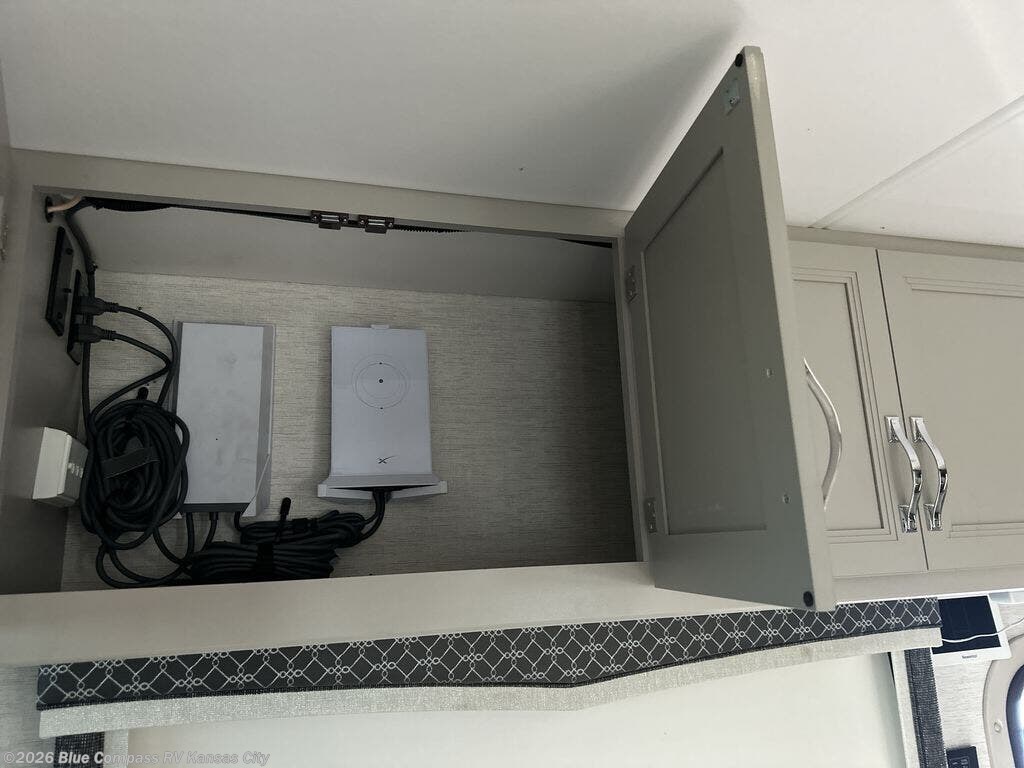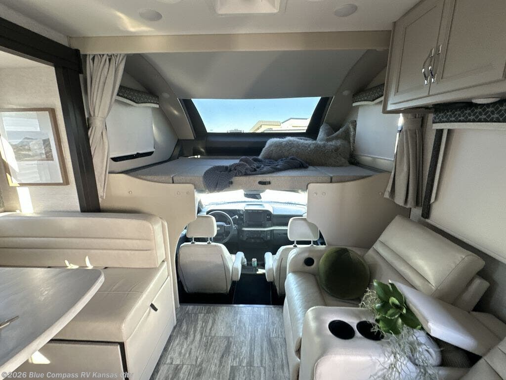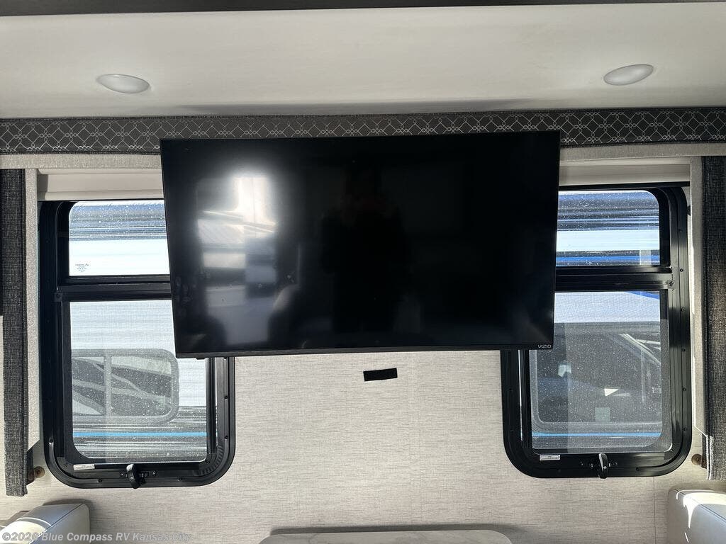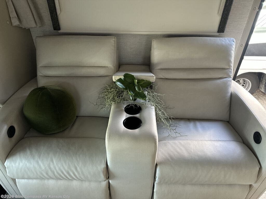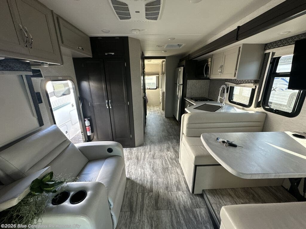 Escape to luxury with this incredible motorhome! The rear bedroom is a serene retreat, featuring a plush queen bed, spacious closet, dresser, and 32” Smart TV. A convenient full bathroom with a pantry and broom closet completes the space, perfect for freshening up on the go. The kitchen is a culinary haven, equipped with a residential refrigerator, three-burner cooktop, microwave, and 70” dream dinette where you can comfortably eat delicious meals. Relax in the 68” theater seating area, complete with 40” Smart TV, perfect for family movie nights or game days. Additional sleeping space is available in the bunk over cab, ensuring everyone has a comfortable place to rest. Create entertaining moments outside with the 32” exterior smart TV under the shade of the 14’ awning perfect for outdoor fun.