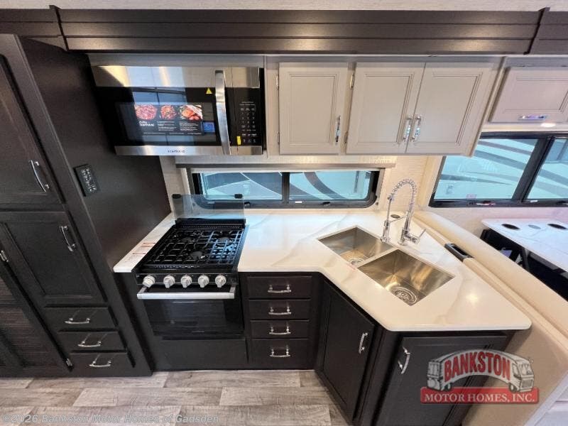 Full-time RVer's or weekend warriors will love this coach that can sleep four to five people each night. There is a large slide out in the main living area to provide your crew with plenty of space. The chef of your group can prepare dinner on the three burner gas range or in the stainless steel microwave, and you'll appreciate having a large pantry to store non-perishables. After dinner is cleaned up, you can play games at the Dream Dinette, or relax on the theater seating that has a great view of the 40" Smart TV in the cab-over bunk. If you're needing more sleeping space, just add the optional sofa in place of the theater seating. A full bath on board lets you clean up each day and the queen bed in the rear bedroom will provide a great night's rest!