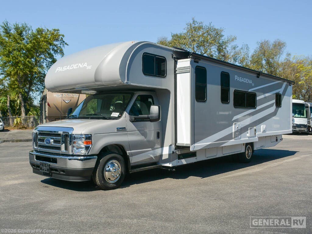 **Thor Motor Coach Pasadena SE Class C gas motorhome SE31 highlights: - Full-Wall Slide - RV Queen Bed - Cab-Over Bunk - Dream Dinette You'll love the amount of space in this coach with a full-wall slide! You can relax on the theater seating after traveling all day, then make dinner on the three burner gas cooktop. The Dream dinette provides a place to dine together, or you can take your plate outdoors to eat under the 16' power awning. The mid-coach full bath is right across from the closet and pantry so you can easily get dressed each day, and the rear private bedroom with an RV queen bed is sure to make you feel at home. With any Pasadena SE Class C gas motorhome by Thor Motor Coach, you will find convenient amenities, a modern interior, and a reliable Ford E-Series chassis. There is a one-piece fiberglass front cap, and premium one-piece roofing for added strength. Residential vinyl flooring will be easy to keep clean, and you'll love the LED lighting, pressed laminate countertops throughout, and full-extensions ball-bearing drawer guides. These motorhomes also include a 4.0 kW gas generator and a 30-amp shoreline power cord to keep you going, along with a tankless water heater to ensure your comfort!