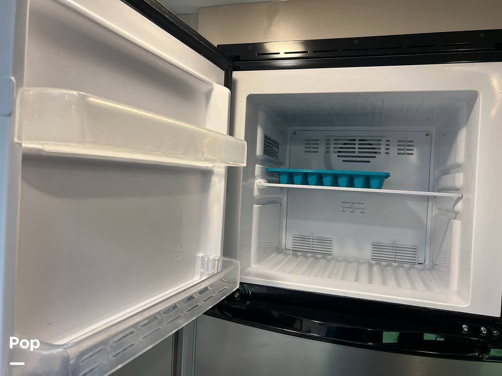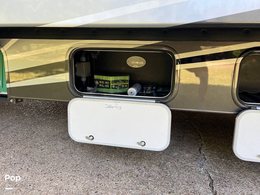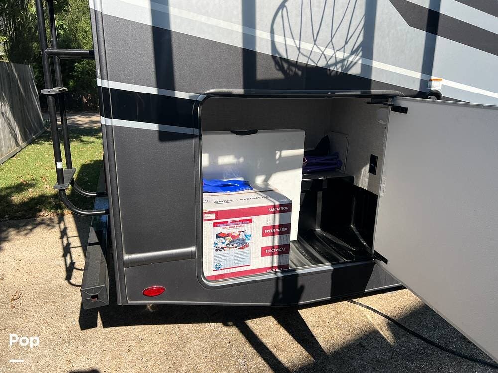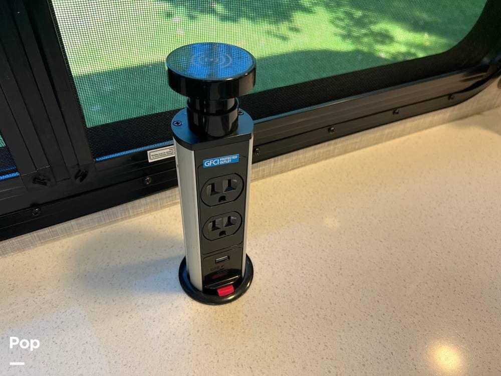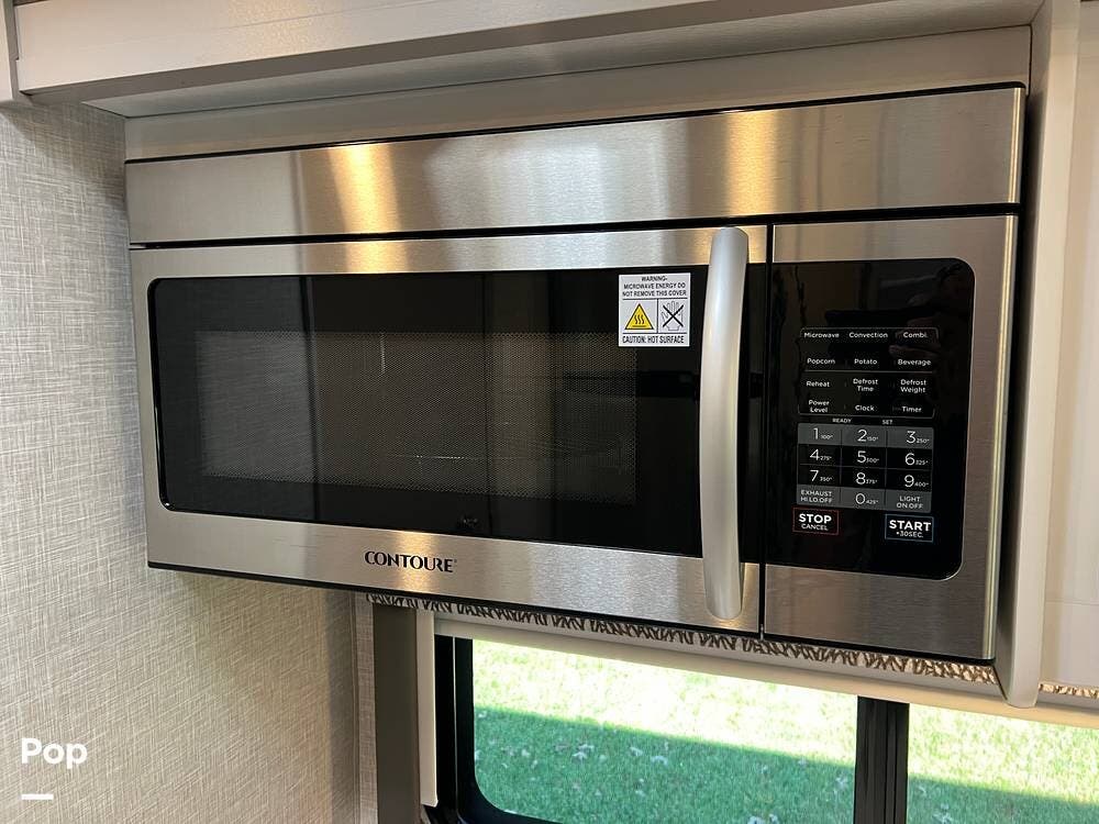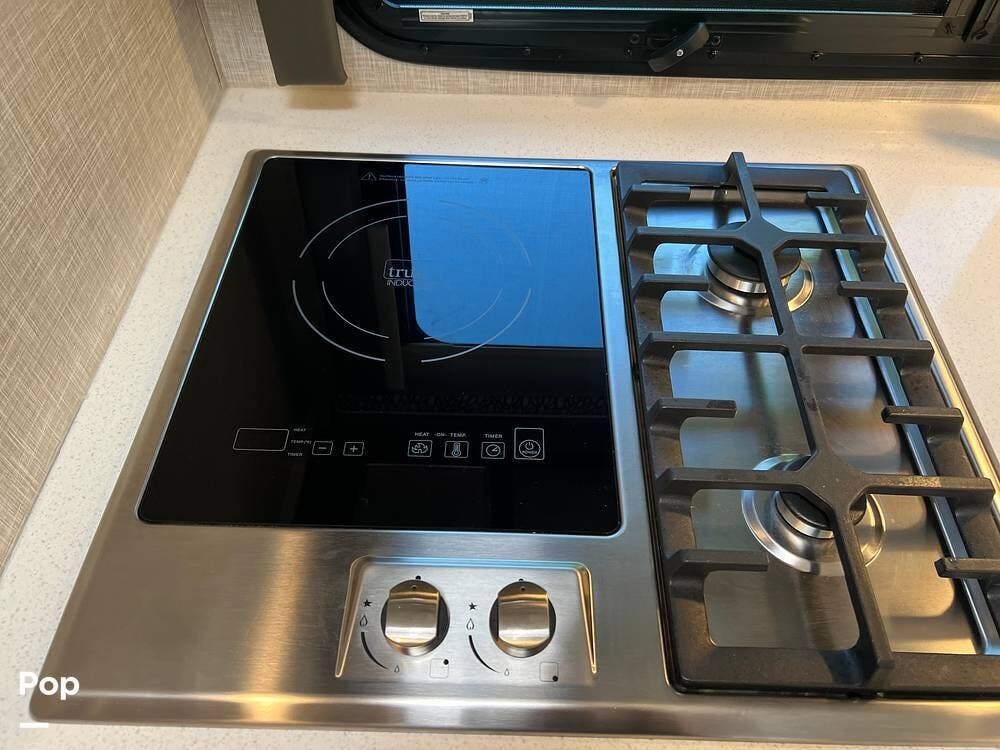 The kitchen comes equipped with a convection microwave, 2-burner gas and induction cooktop, and a 12-volt refrigerator. Relax in the theater seating or dinette while watching one of three TVs -- including an exterior entertainment setup for evenings under the power awning.