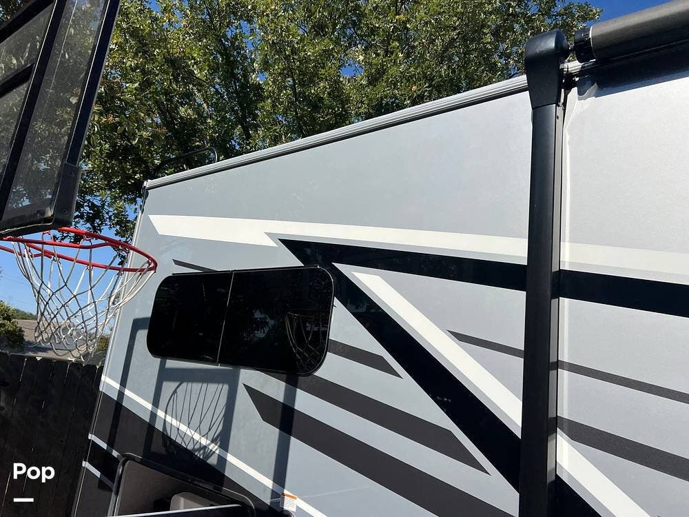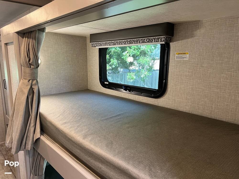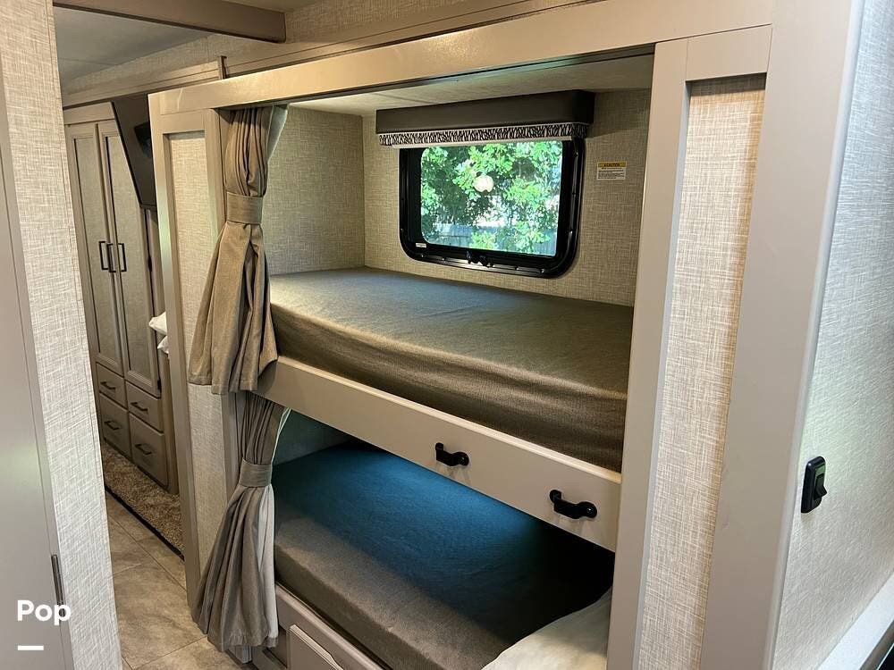 Inside, enjoy a spacious full-wall slide, sleeping for up to ten, and a modern interior with residential touches. The private rear bedroom features a queen bed, smart TV, and direct access to the full bath. Mid-coach bunks and a cab-over bunk make it perfect for families or guests.