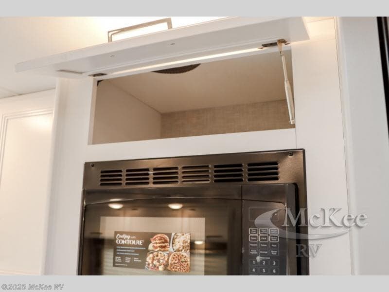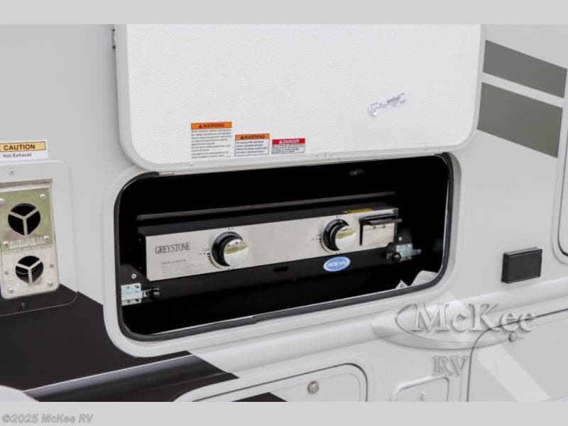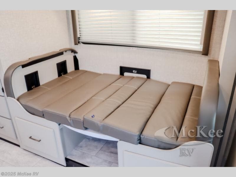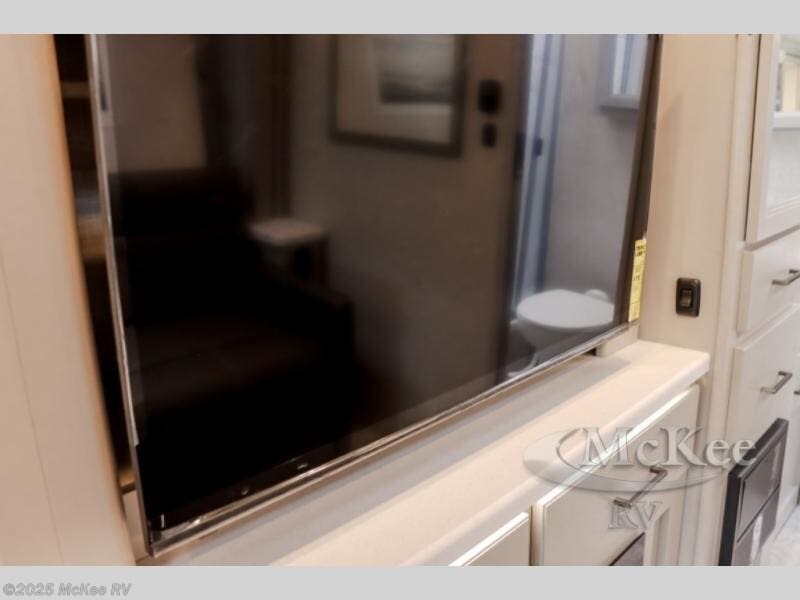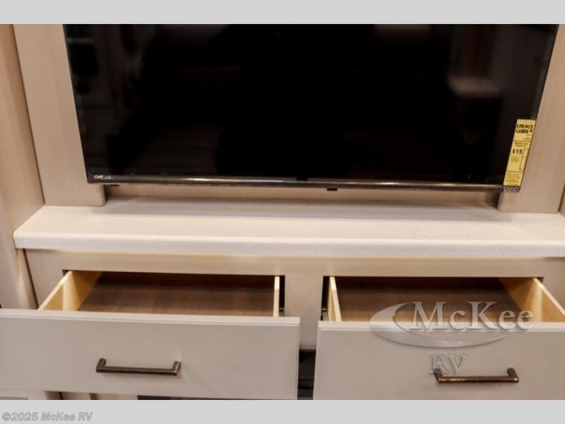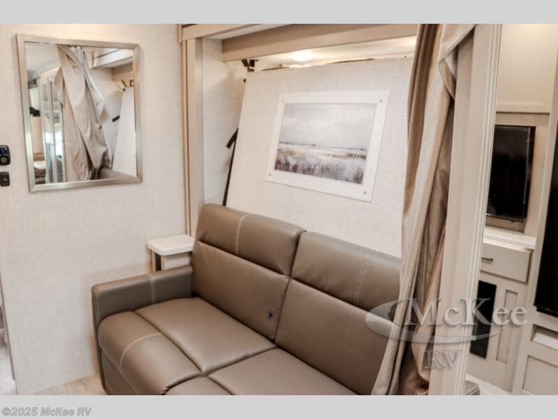 One step inside this coach and you'll be sold! The full-wall slide opens up your whole living space so it feels more open. You'll find the Dream Dinette, sofa with a Murphy bed, and two closets here for added convenience. There is even a fireplace to make it feel a little more like home and a privacy curtain around the bed if you have guests sleeping on the cab-over bunk or dinette! A three burner cooktop and microwave oven will allow you to make meals each day, and the 12V refrigerator can hold all your perishables. And don't over look the full rear bath with a foot flush toilet, shower skylight, and bath linen closet for clean towels. This model also includes an optional exterior TV and an optional exterior griddle if you want to cook breakfast outdoors!