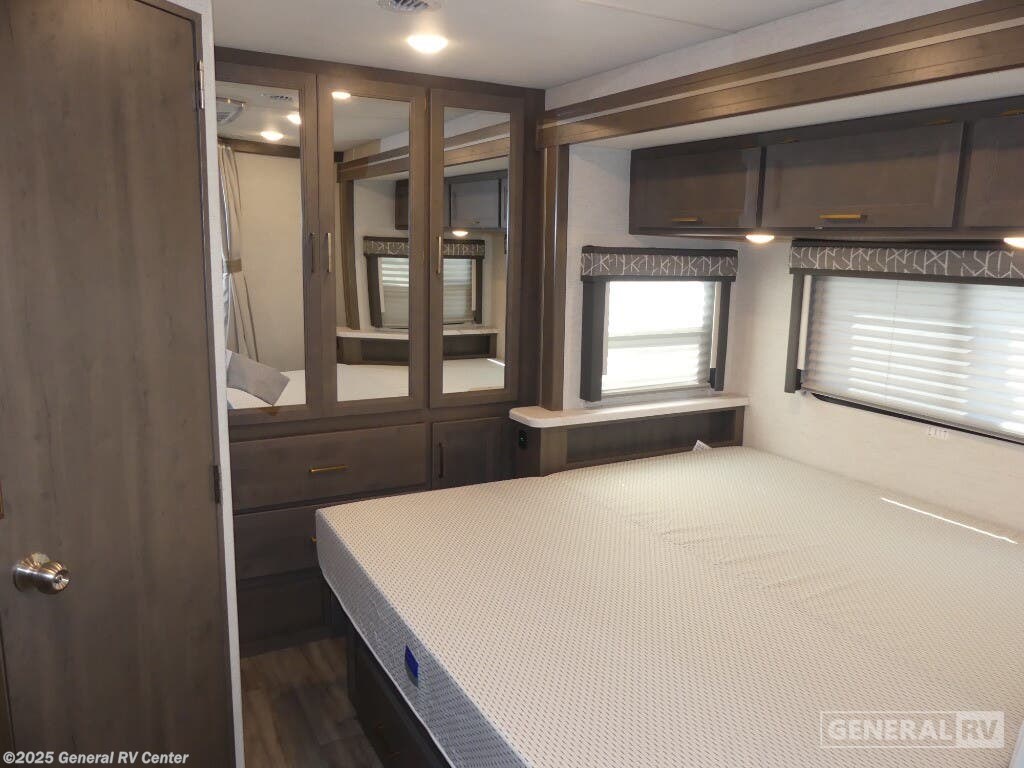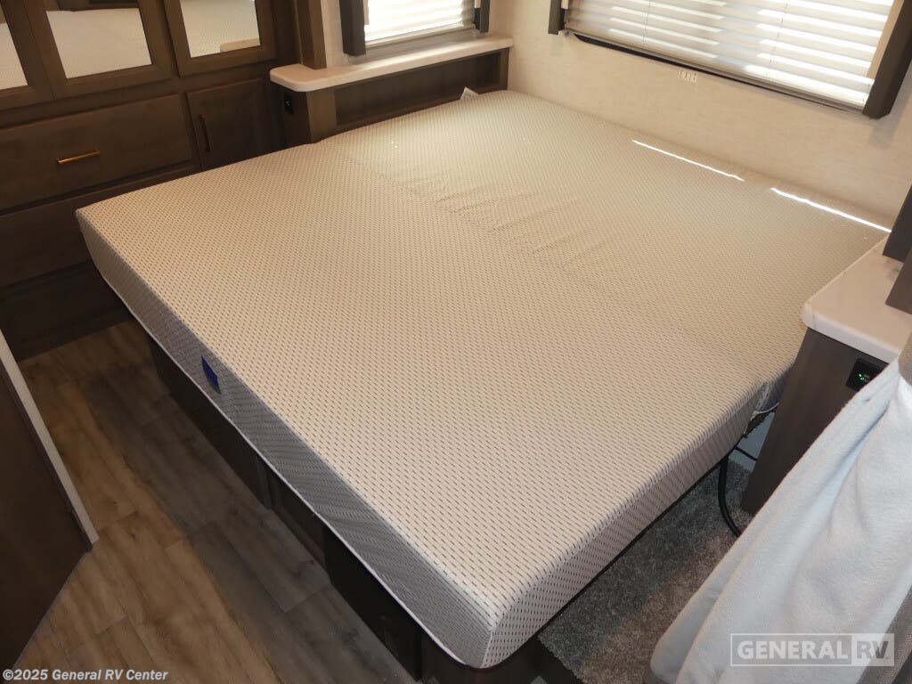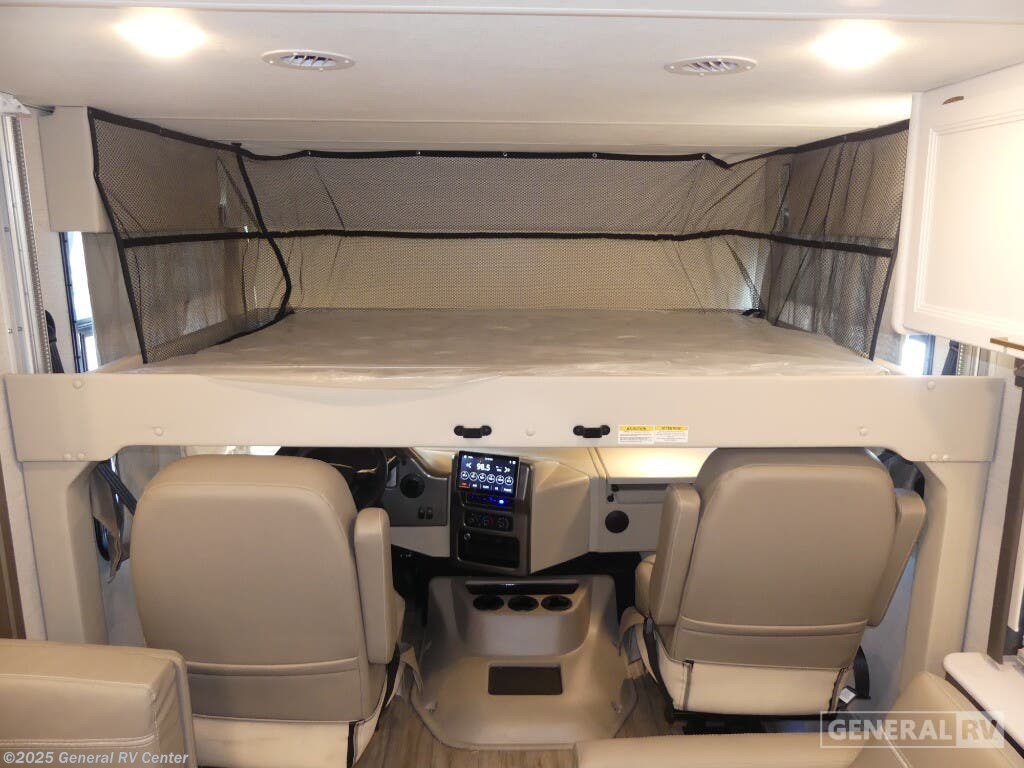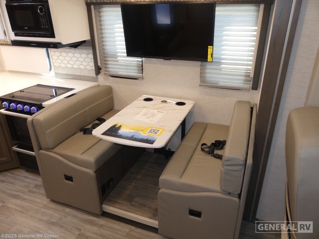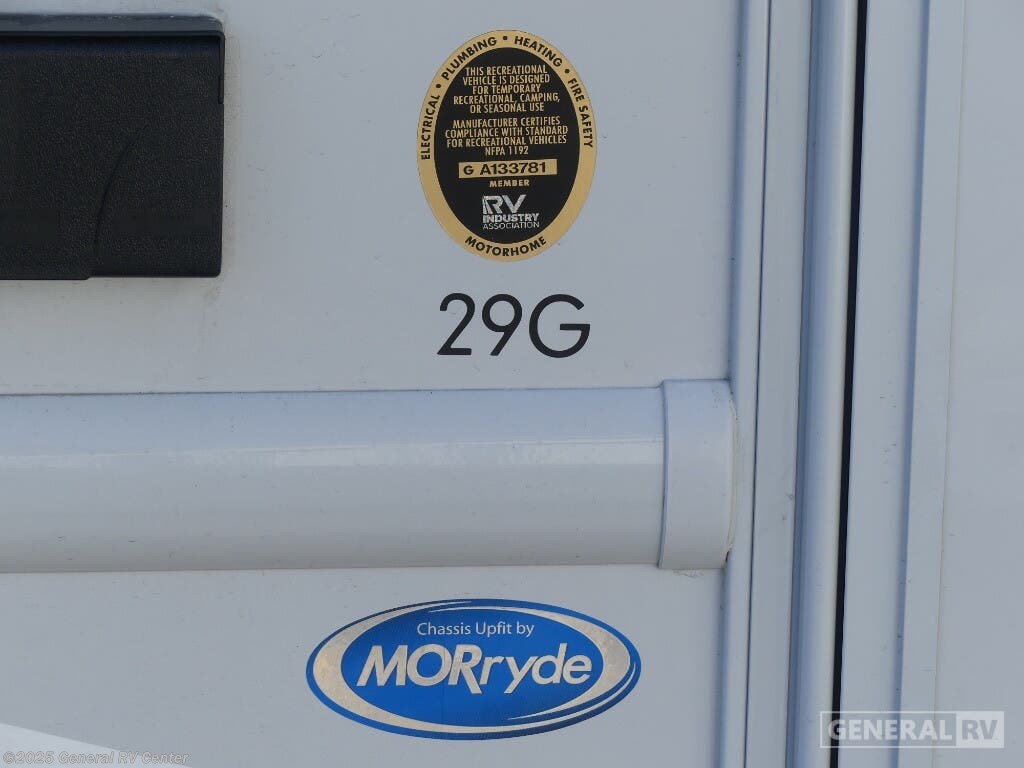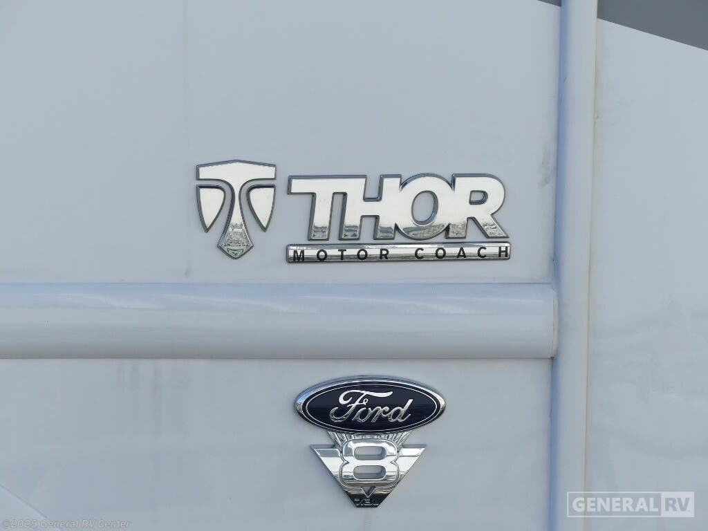 Experience the perfect blend of comfort and adventure with the 2025 Thor Motor Coach Resonate 29G. This RV is designed to accommodate up to eight guests, making it an ideal choice for family getaways or trips with friends. The spacious interior boasts a luxurious king bed, complemented by two convertible sleeping areas. With its center kitchen, you can enjoy culinary adventures on the road, utilizing the three-burner cooktop and mid-size refrigerator that runs on both electric and propane. The front living area is a cozy retreat, featuring a 68" jack-knife sofa and a dream dinette, perfect for relaxing or dining. The Resonate 29G is thoughtfully designed with convenience in mind. The rear bath offers privacy and functionality, while the 19 ft. powered retractable awning extends your living space to the great outdoors. Built on a robust Ford F53 chassis, this RV delivers 335 horsepower and 468 lb-ft of torque, ensuring a smooth and powerful ride. With a fresh water capacity of 50 gallons, you can enjoy extended adventures without worrying about resupply. Whether you're lounging inside or enjoying the exterior 32" TV, the Resonate 29G promises a delightful travel experience. For more details and to see this model in person, visit your nearest General RV dealership.