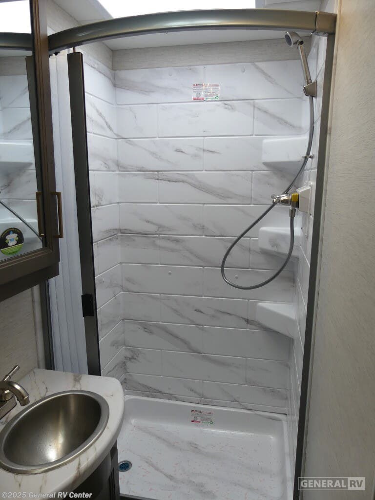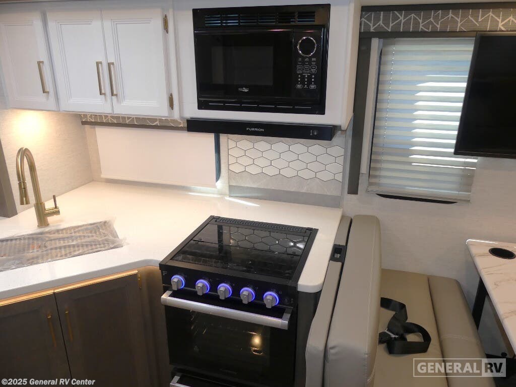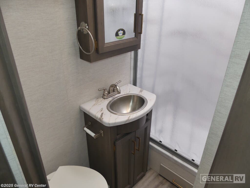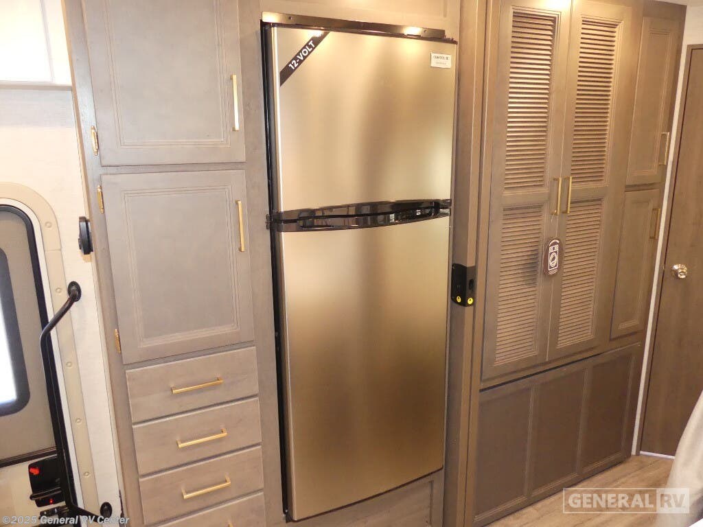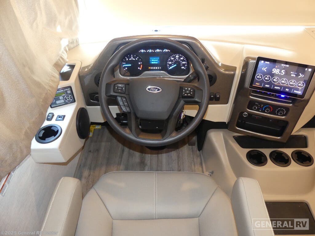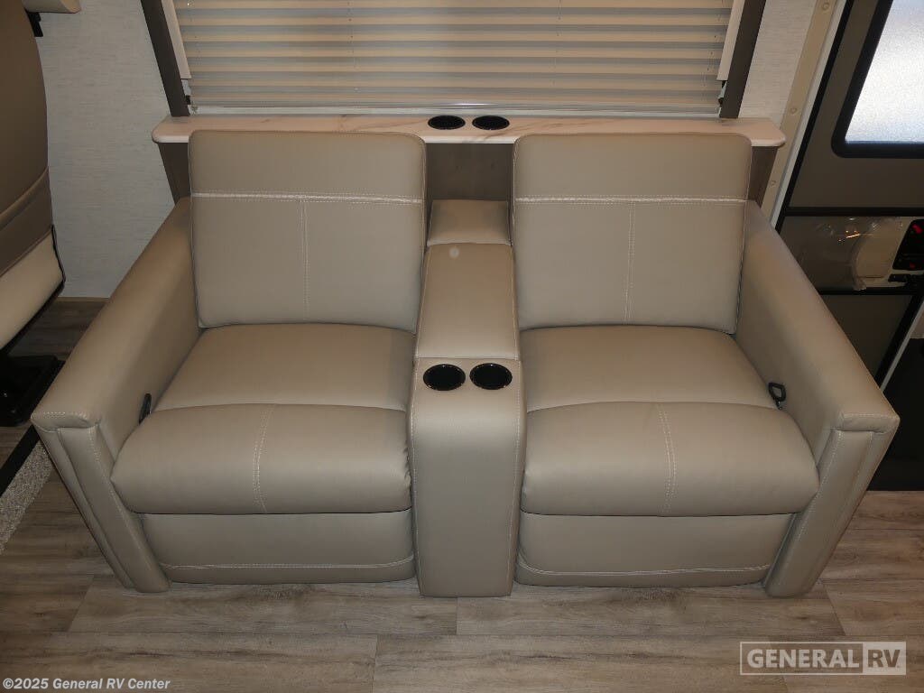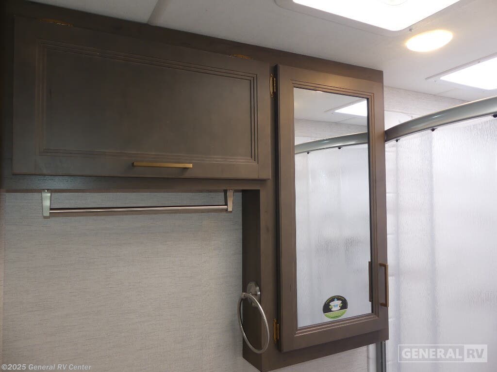 Experience the perfect blend of comfort and adventure with the 2025 Thor Motor Coach Resonate 29G. This RV is designed to accommodate up to eight guests, making it an ideal choice for family getaways or trips with friends. The spacious interior boasts a luxurious king bed, complemented by two convertible sleeping areas. With its center kitchen, you can enjoy culinary adventures on the road, utilizing the three-burner cooktop and mid-size refrigerator that runs on both electric and propane. The front living area is a cozy retreat, featuring a 68" jack-knife sofa and a dream dinette, perfect for relaxing or dining. The Resonate 29G is thoughtfully designed with convenience in mind. The rear bath offers privacy and functionality, while the 19 ft. powered retractable awning extends your living space to the great outdoors. Built on a robust Ford F53 chassis, this RV delivers 335 horsepower and 468 lb-ft of torque, ensuring a smooth and powerful ride. With a fresh water capacity of 50 gallons, you can enjoy extended adventures without worrying about resupply. Whether you're lounging inside or enjoying the exterior 32" TV, the Resonate 29G promises a delightful travel experience. For more details and to see this model in person, visit your nearest General RV dealership.