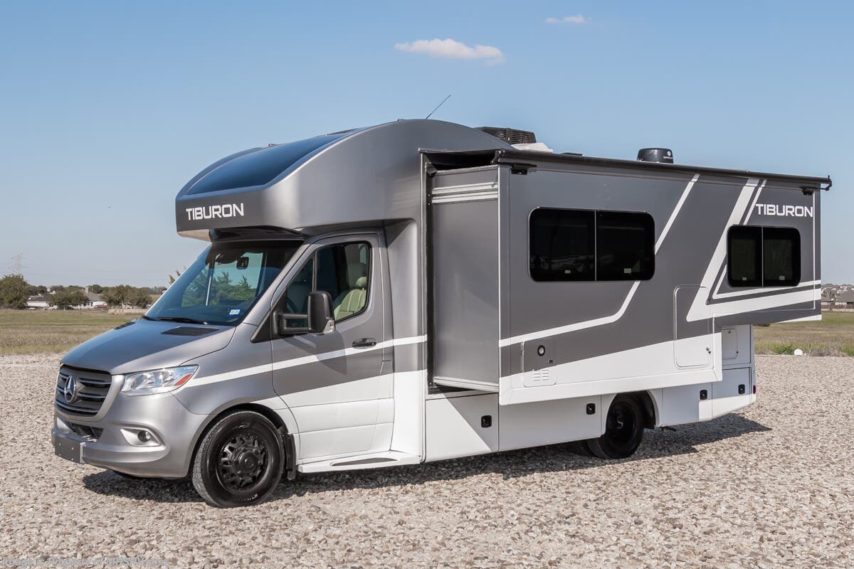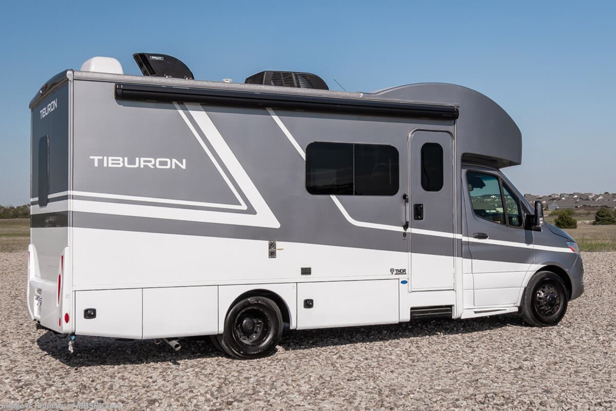 Used Thor Motor Coach RV for sale – 2025 Thor Tiburon 24TT is approximately 24’ 9” in length with 7,387 Miles, 1 slide and features aluminum wheels, Lippert hydraulic jacks, full body paint, Onan 3.2KW diesel generator, Mercedes-Benz chassis, Mercedes-Benz diesel engine, tilt/telescoping steering wheel, smart wheel, driver door, power windows, cruise control, water manifold, Led running lights, exterior shower, solar, inverter, 7 foot ceiling, convection microwave, overhead loft and much more. For additional details on this unit and our entire inventory including brochures, window sticker, videos, photos, reviews & testimonials as well as additional information about Motor Home Specialist and our manufacturers please visit us at or call 800-335-6054 for our Texas location or 334-288-0331 for our Alabama location. At Motor Home Specialist, we DO NOT charge any prep or orientation fees like you will find at other dealerships. Read Thousands upon Thousands of 5-Star Reviews at and See What They Had to Say About Their Experience at Motor Home Specialist.