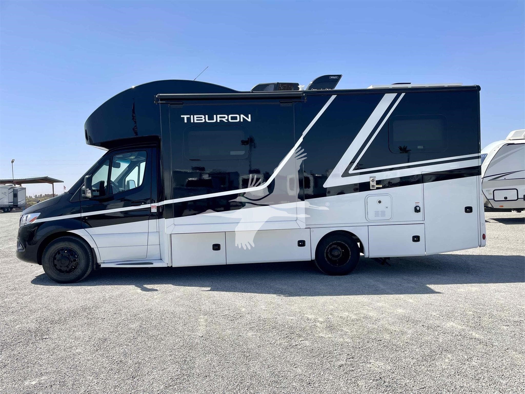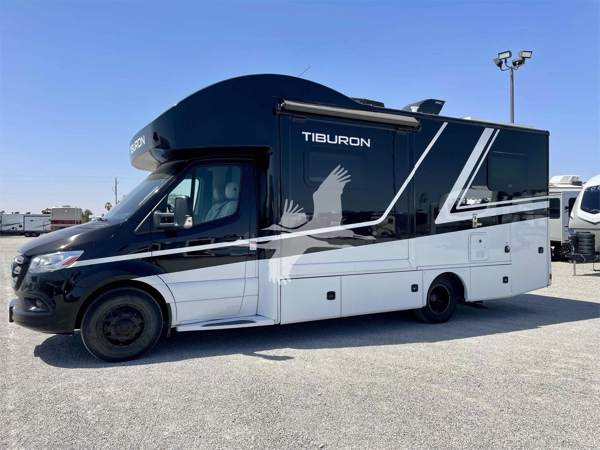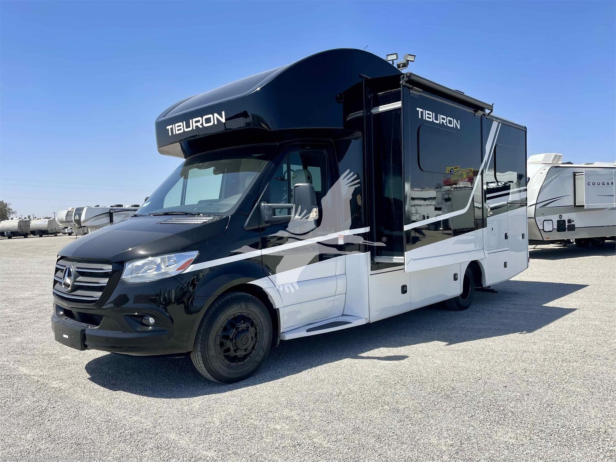 STOCK#: TH18577. ---------- ON SPECIAL & JUST REDUCED!!! ------------ Tiburon combines style and functionality to provide a Class C motorhome that caters to your family’s needs. Its versatile and comfortable living space makes it perfect for short getaways and extended vacations. This Mercedes-Benz® sprinter enhances your adventures and creates lasting memories with your loved ones. The 24XL is 25' 8" in overall length so it's easy to drive and navigate even in city traffic. The 24XL features a 2 slide-outs that create more living area and a walk-around rear bed, and the unique Blackbird Full Body Paint Key Features include Mercedes-Benz Sprinter Chassis, Rotocast Storage Compartments with Side-Hinged Doors, 10" Touchscreen Dash Radio with CD/DVD Player, Bluetooth®, Navigation, & Back-Up Monitor, Heated/Remote Exterior Side Mirrors, Leatherette Furniture, 2-Burner Gas Cooktop & Convection Microwave Oven, Tankless Water Heater, Whole Coach Water Filter System. Other features include Interior Solid Surface Kitchen Countertop with Undermount Sink, Charging Station in Living Area, Lighted Step Well, 200-watt Solar Charging System with Power Controller and 1000-watt Inverter, Auto Leveling Jacks w/Touch Pad Controls, 3.2 Onan Diesel Generator, and more. CARGO CARRYING CAPACITY: 2284 lbs