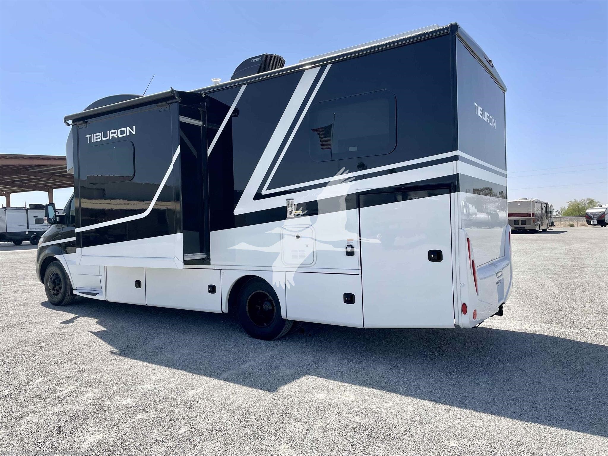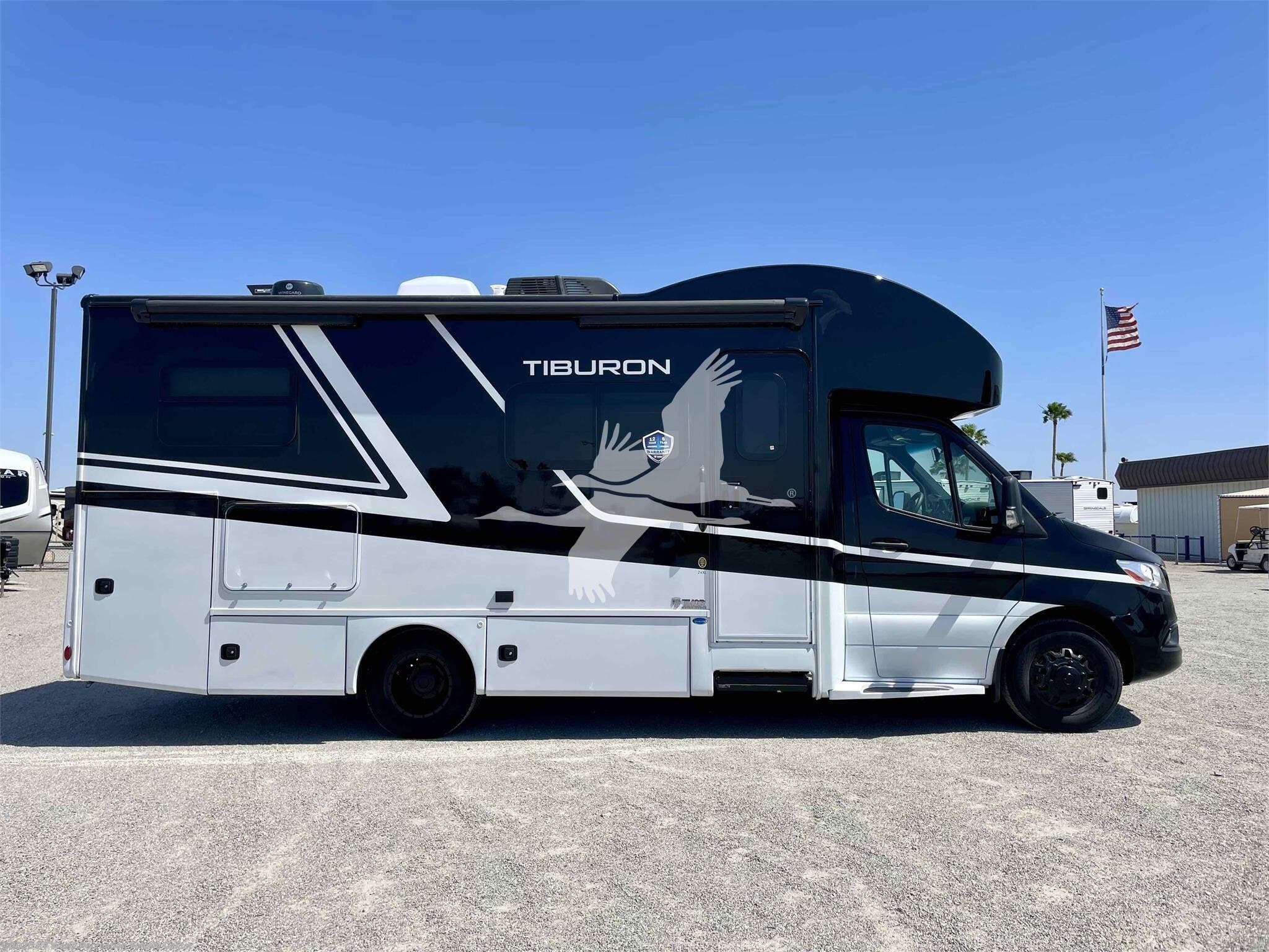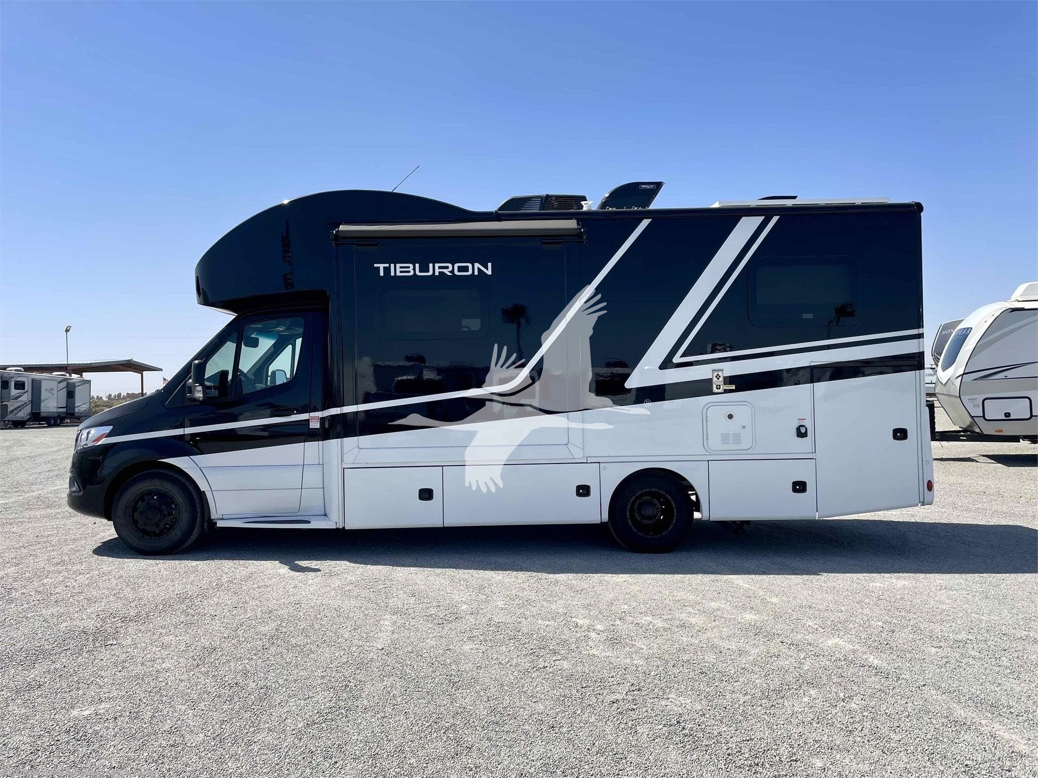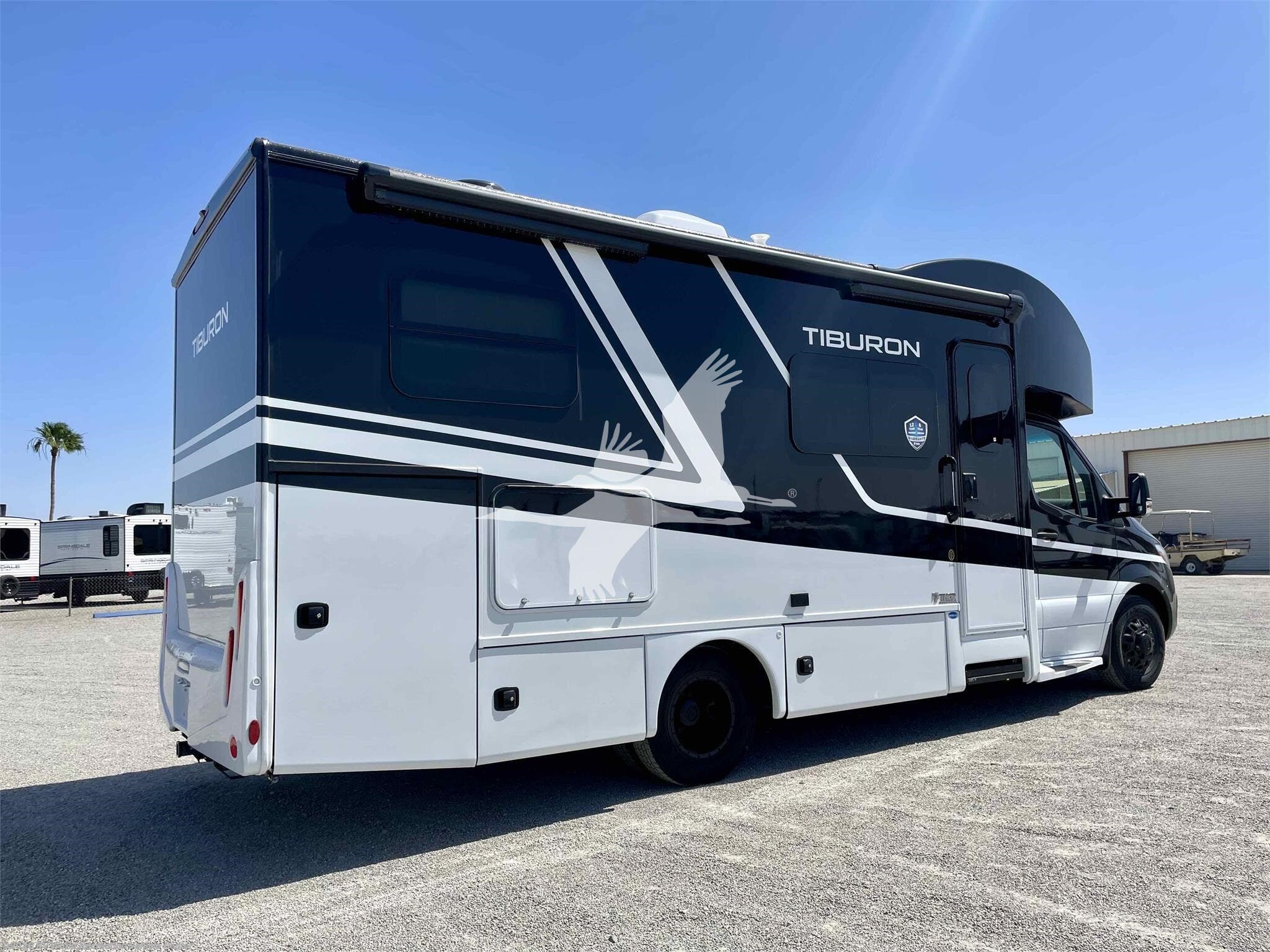 STOCK#: TH18577. ---------- ON SPECIAL & JUST REDUCED!!! ------------ Tiburon combines style and functionality to provide a Class C motorhome that caters to your family’s needs. Its versatile and comfortable living space makes it perfect for short getaways and extended vacations. This Mercedes-Benz® sprinter enhances your adventures and creates lasting memories with your loved ones. The 24XL is 25' 8" in overall length so it's easy to drive and navigate even in city traffic. The 24XL features a 2 slide-outs that create more living area and a walk-around rear bed, and the unique Blackbird Full Body Paint Key Features include Mercedes-Benz Sprinter Chassis, Rotocast Storage Compartments with Side-Hinged Doors, 10" Touchscreen Dash Radio with CD/DVD Player, Bluetooth®, Navigation, & Back-Up Monitor, Heated/Remote Exterior Side Mirrors, Leatherette Furniture, 2-Burner Gas Cooktop & Convection Microwave Oven, Tankless Water Heater, Whole Coach Water Filter System. Other features include Interior Solid Surface Kitchen Countertop with Undermount Sink, Charging Station in Living Area, Lighted Step Well, 200-watt Solar Charging System with Power Controller and 1000-watt Inverter, Auto Leveling Jacks w/Touch Pad Controls, 3.2 Onan Diesel Generator, and more. CARGO CARRYING CAPACITY: 2284 lbs