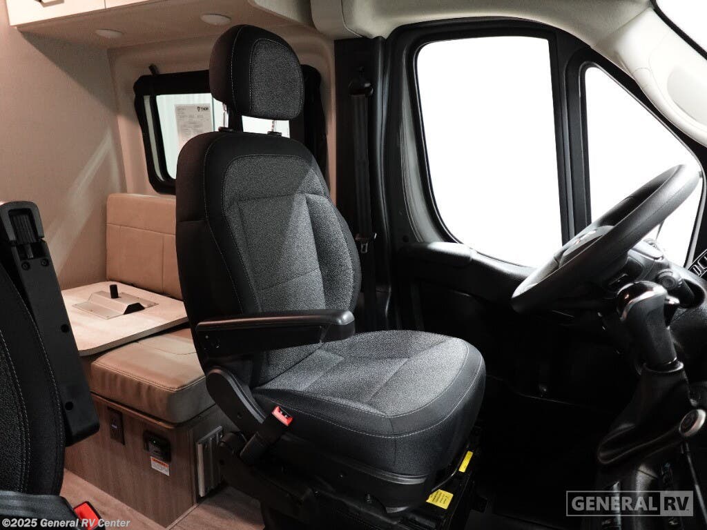 Step into the 2025 Thor Motor Coach Twist 2JB, where compact design meets versatile functionality. This RV is perfect for adventurers who crave both comfort and mobility. With a sleek 21-foot length, it's built on a robust ProMaster 3500 chassis, powered by a Pentastar VVT V6 engine. The interior layout is intelligently crafted to maximize space. The center kitchen is equipped with a two-burner cooktop and compact electric refrigerator, making meal prep a breeze. The rear living area features a cozy sofa bed system that converts into a 74" x 71" sleeping area, providing restful nights under the stars. The Twist 2JB is designed for convenience. It includes a center bath with a shower curtain and essential storage options. Swivel chairs in the front create a dynamic living space, allowing you to adapt the area to your needs. With a fresh water capacity of 25 gallons and a gray water capacity of 20 gallons, you're equipped for extended journeys. Whether you're exploring national parks or enjoying a weekend getaway, the Twist 2JB offers the perfect balance of style and practicality. For more details, visit your nearest General RV dealership.