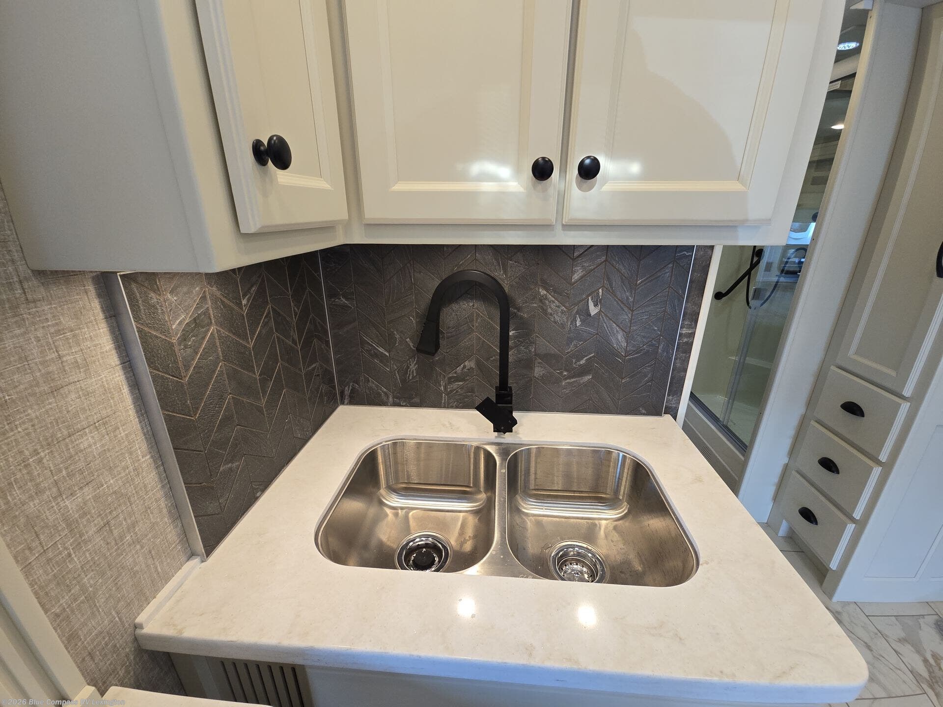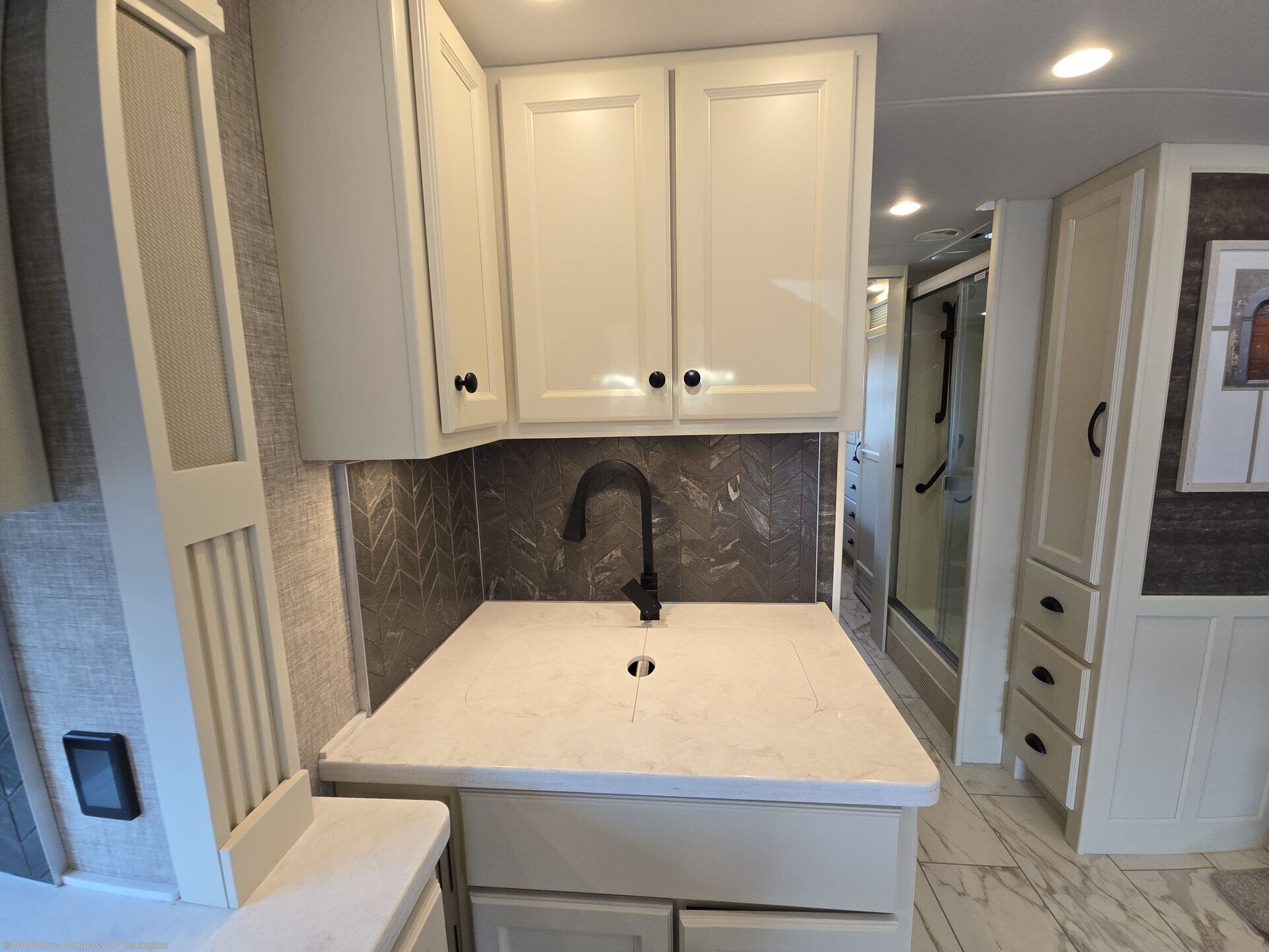 Head across the country in this luxury coach for nine! The dual opposing slides in the main living area will provide you with tons of space to stretch out once you park, and you'll find seating space on the two sofa beds and the booth dinette. The chef can whip up a hearty meal on the three burner cooktop with a convection microwave with an air fryer, and the Expand-An-Island will come in handy when they need extra counter space. The private toilet and sink are right across from the shower so two people can freshen up at once, and you'll love having the rear bedroom all to yourselves. Here, you'll find a king bed slide out that can be optioned out for a queen, a large wardrobe with a bank of drawers, plus an optional washer and dryer if you choose to add. The interior is inviting, but you will also love spending time outdoors under the power awning with LED lights as well and an optional exterior TV.
