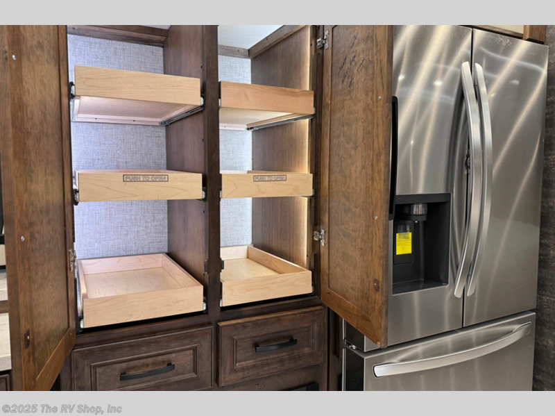 The Journey just got sweeter in this triple slide out coach that can sleep four each night. You are sure to get a great night's rest on the slide out king bed with dual nightstands, and there is a 50" bedroom TV. Your guests can sleep on the sofa bed in the main living area, and everyone can take turns cleaning up in the full rear bath before breakfast. You'll find a large closet, an optional stacked washer and dryer, plus dual bath sinks so you both can brush at the same time. The kitchen is packed with everything you need to prepare a hearty breakfast, including a two burner induction cooktop, a convection microwave, and a 22 cu. ft. stainless steel residential refrigerator with French doors and a bottom freezer to stock up!