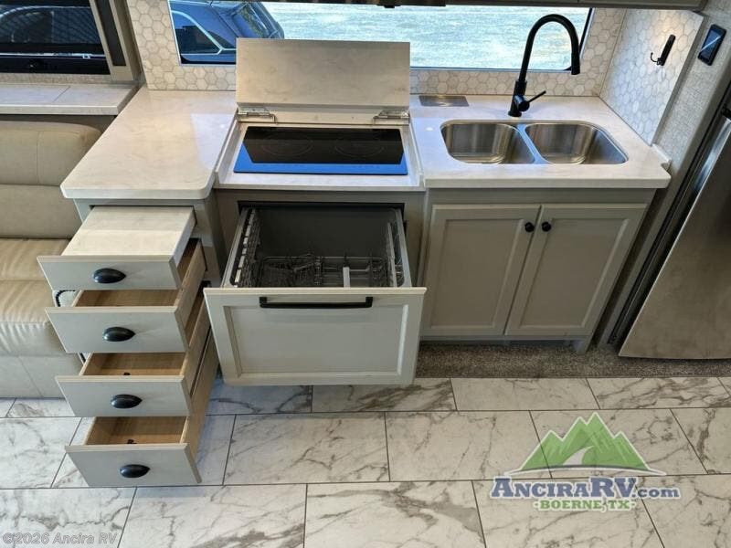 If luxury is what you want, luxury is what you'll get with this Allegro RED Class A diesel motorhome! Glamorous furnishings and high-class style are included all throughout this coach. One of the best features is going to be the master suite. This space has a private bedroom connected to its own private bathroom. The king bed slide sits across from the full-wall slide, so there is plenty of space to change your clothes and just relax. There is a TV next to the wardrobe and across from the bed for easy viewing at night, and the bathroom has a place for the optional washer/dryer to be added. Out in the main living area, the rest of your traveling companions can use the half bathroom to clean up, and there is plenty of seating for everyone to lounge on with the booth dinette sleeper and two sofas. If you would like to have more sleeping space, you can add the optional drop-down bunk above the cab.