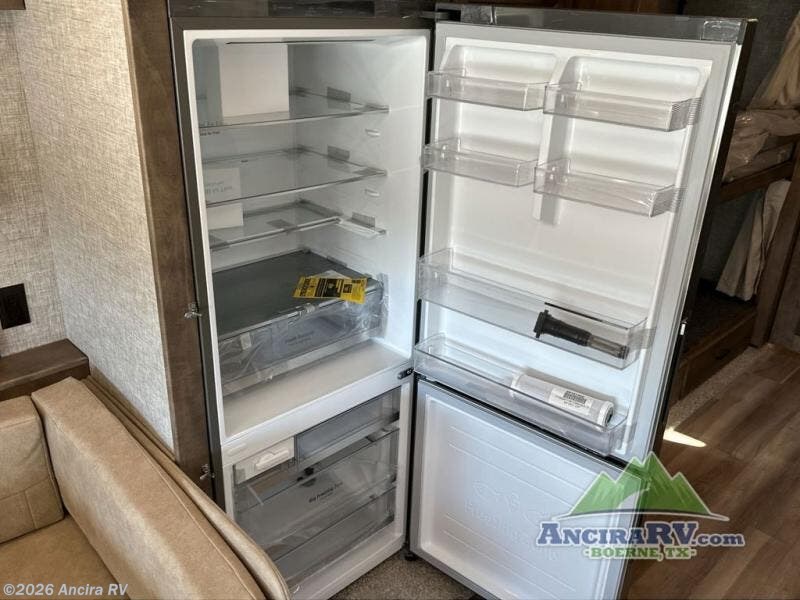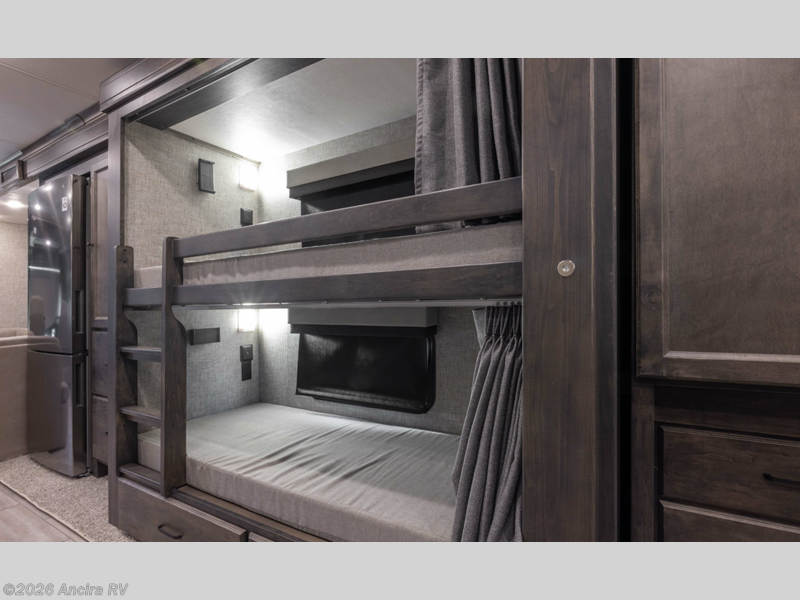 A full-wall slide plus two additional slides provides ample room to stretch out in this coach! It will be so easy to travel with a larger group since there is a full rear bath, bunk beds, plus a second full bath right across the bunks for convenience! You will surely appreciate the master bedroom with dual bedroom wardrobes and nightstands, a king bed slide out, and quick entrance into the rear bath. In the morning, you can prepare breakfast for everyone on the three burner cooktop or in the 1.5 cu. ft. Smart convection microwave, and the perishables can go back in the 18 cu. ft. residential refrigerator when you're done. Your crew can also make themselves comfortable on the air coil sofa and booth dinette sleeper, and these areas can double as sleeping space as well. If you need more sleeping space, you might want to add the optional drop-down front bunk!