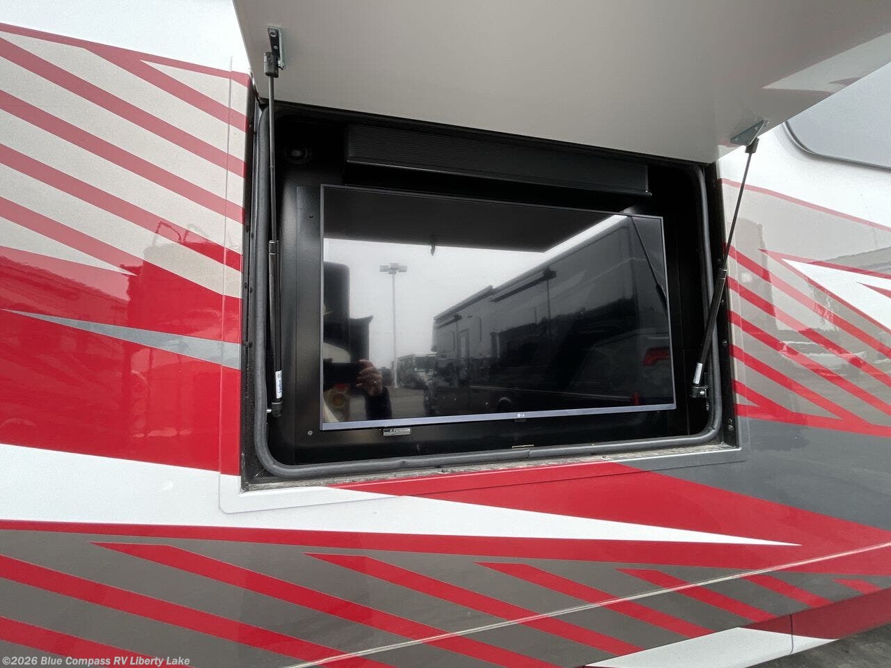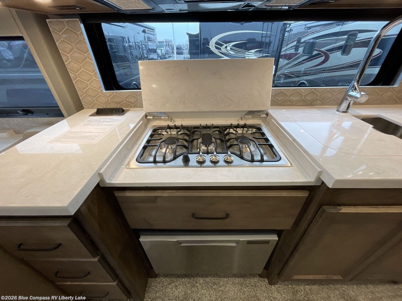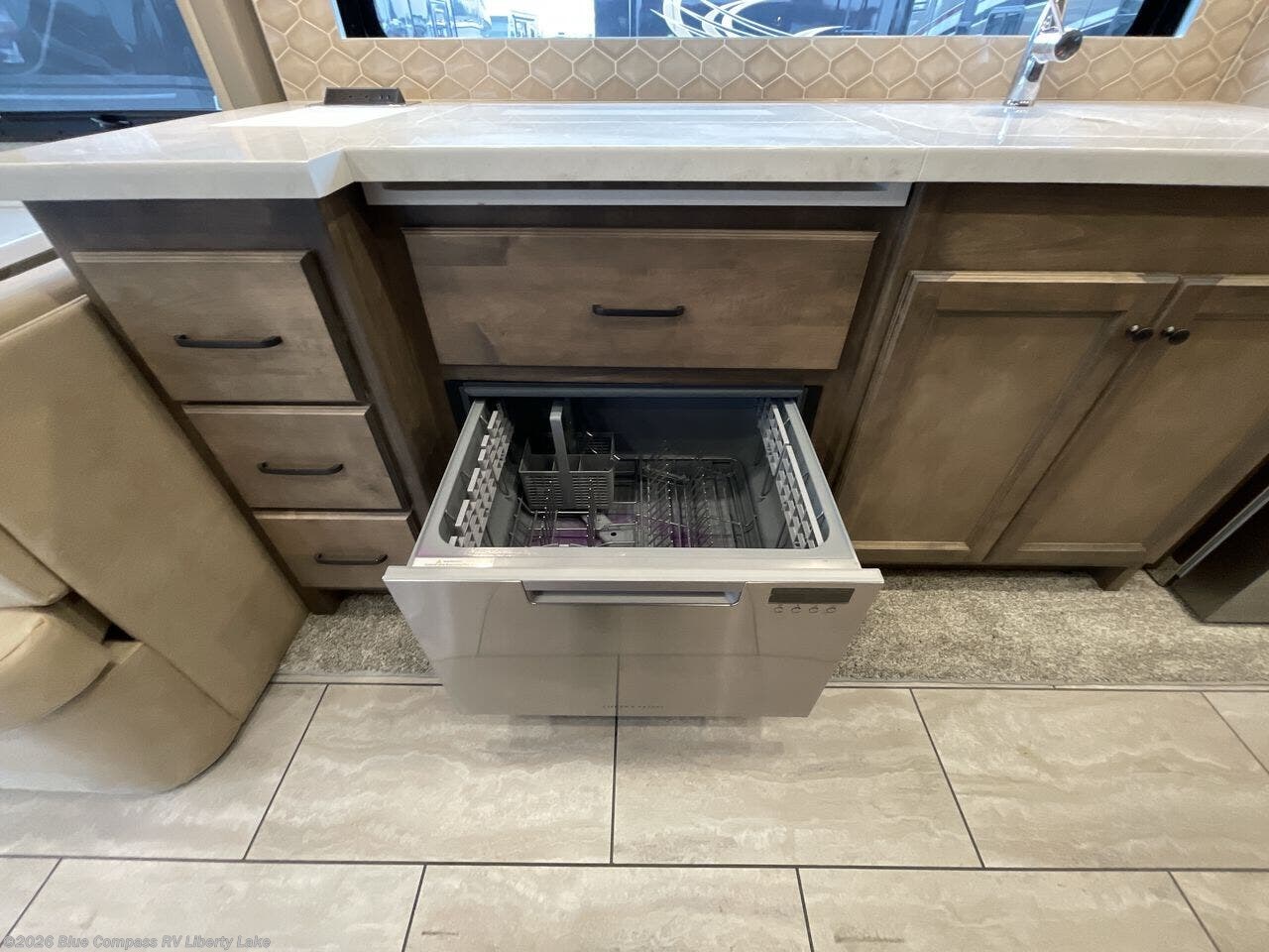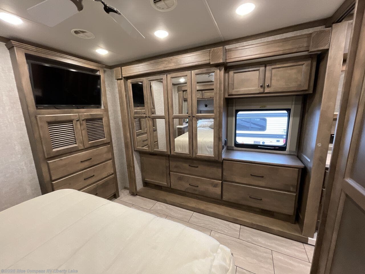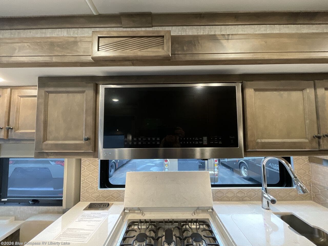 There are many standard luxurious features you will love about this motorhome! It also has many optional features you can add like the optional drop-down front bunk, the super sofa, the air coil sofa bed, or the theater seating. The king bed slide in the rear private bedroom offers a comfortable place to sleep, as well as the flip and fold sofa bed in the living area. You will love the dinette bar with a lift TV, a flip-up countertop, and two chairs that will make this the perfect place to get some work done while you're on the road. The kitchen includes everything you need to prepare meals each day, including a 1.7 cu. ft. smart convection microwave with an air fryer, a three burner liquid propane cooktop, and a 23 cu. ft. stainless steel residential refrigerator with French doors and a bottom freezer. Head to the rear master bedroom with a queen bed slide out, a large wardrobe, a cabinet with a TV and drawers below, plus a private entrance into the dual entry bath!