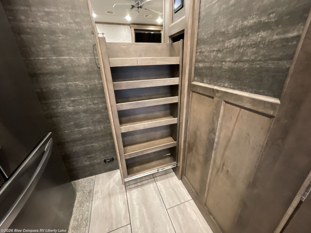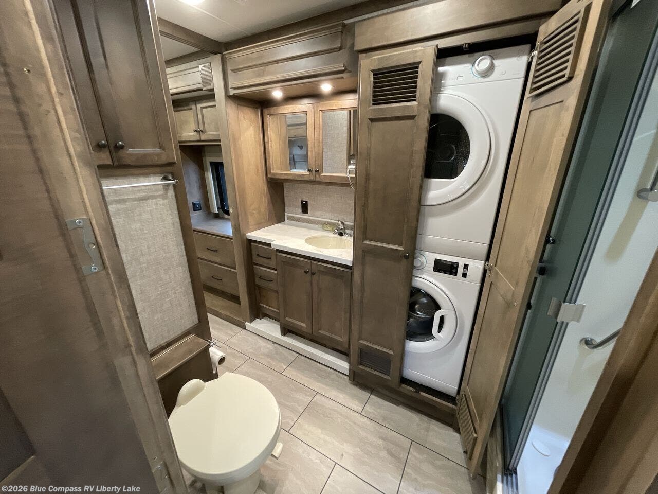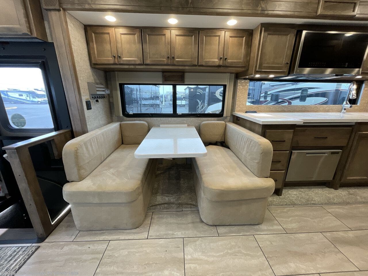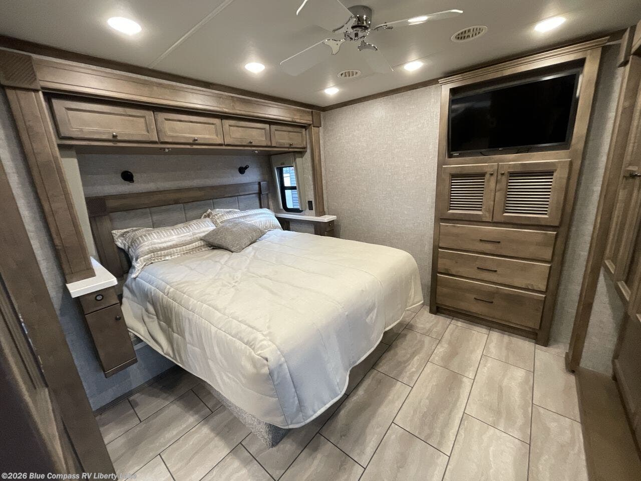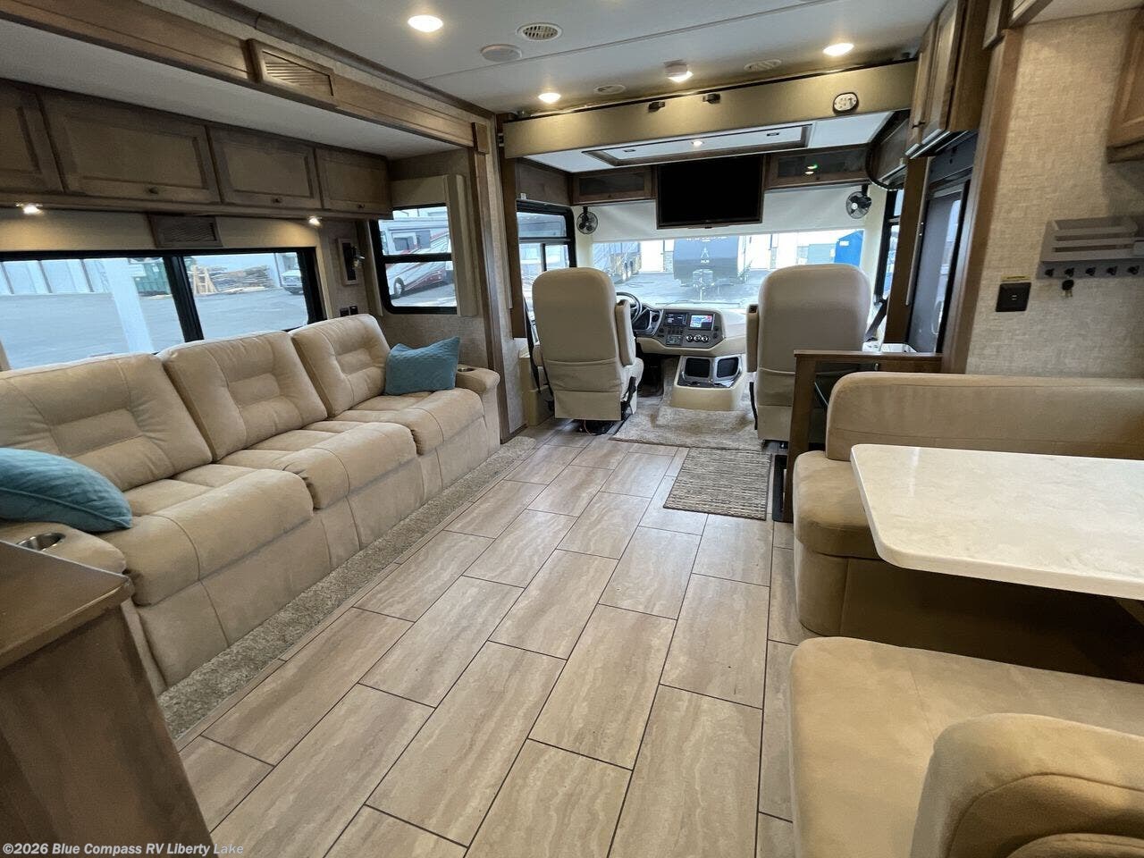 There are many standard luxurious features you will love about this motorhome! It also has many optional features you can add like the optional drop-down front bunk, the super sofa, the air coil sofa bed, or the theater seating. The king bed slide in the rear private bedroom offers a comfortable place to sleep, as well as the flip and fold sofa bed in the living area. You will love the dinette bar with a lift TV, a flip-up countertop, and two chairs that will make this the perfect place to get some work done while you're on the road. The kitchen includes everything you need to prepare meals each day, including a 1.7 cu. ft. smart convection microwave with an air fryer, a three burner liquid propane cooktop, and a 23 cu. ft. stainless steel residential refrigerator with French doors and a bottom freezer. Head to the rear master bedroom with a queen bed slide out, a large wardrobe, a cabinet with a TV and drawers below, plus a private entrance into the dual entry bath!