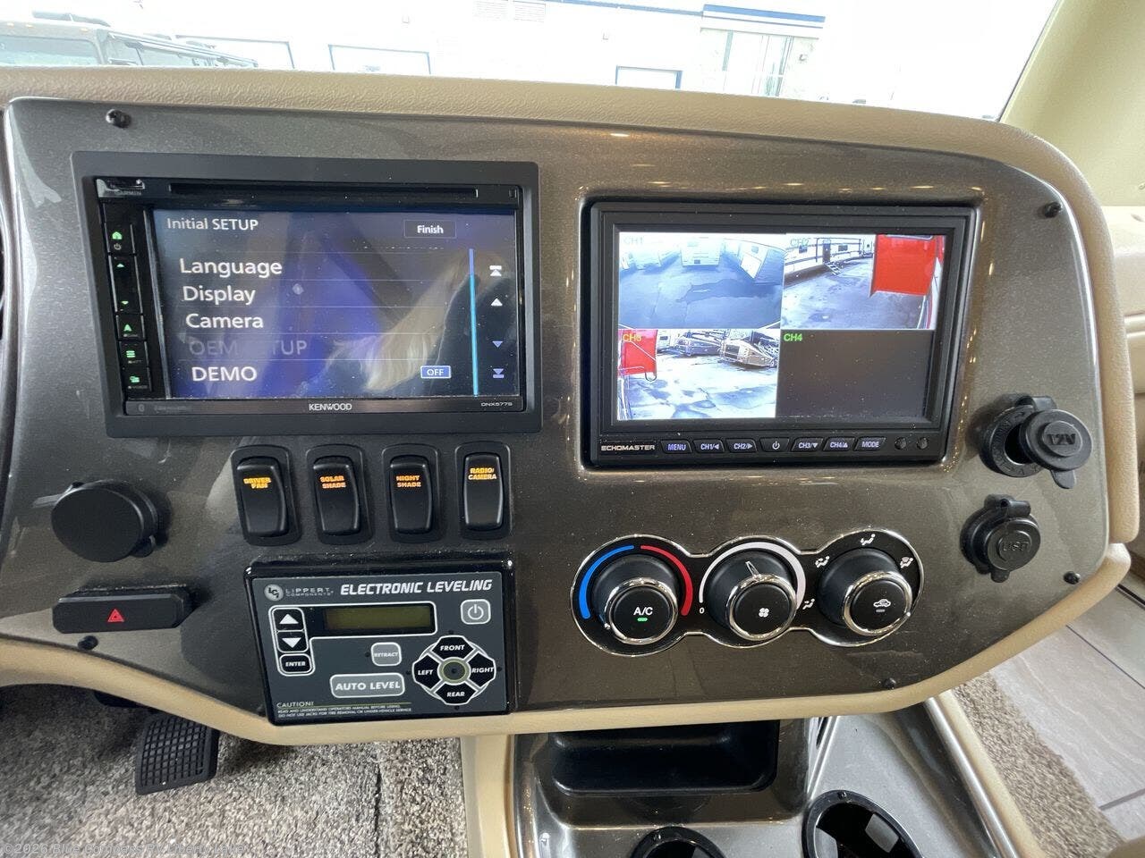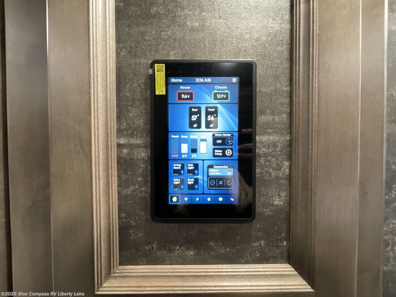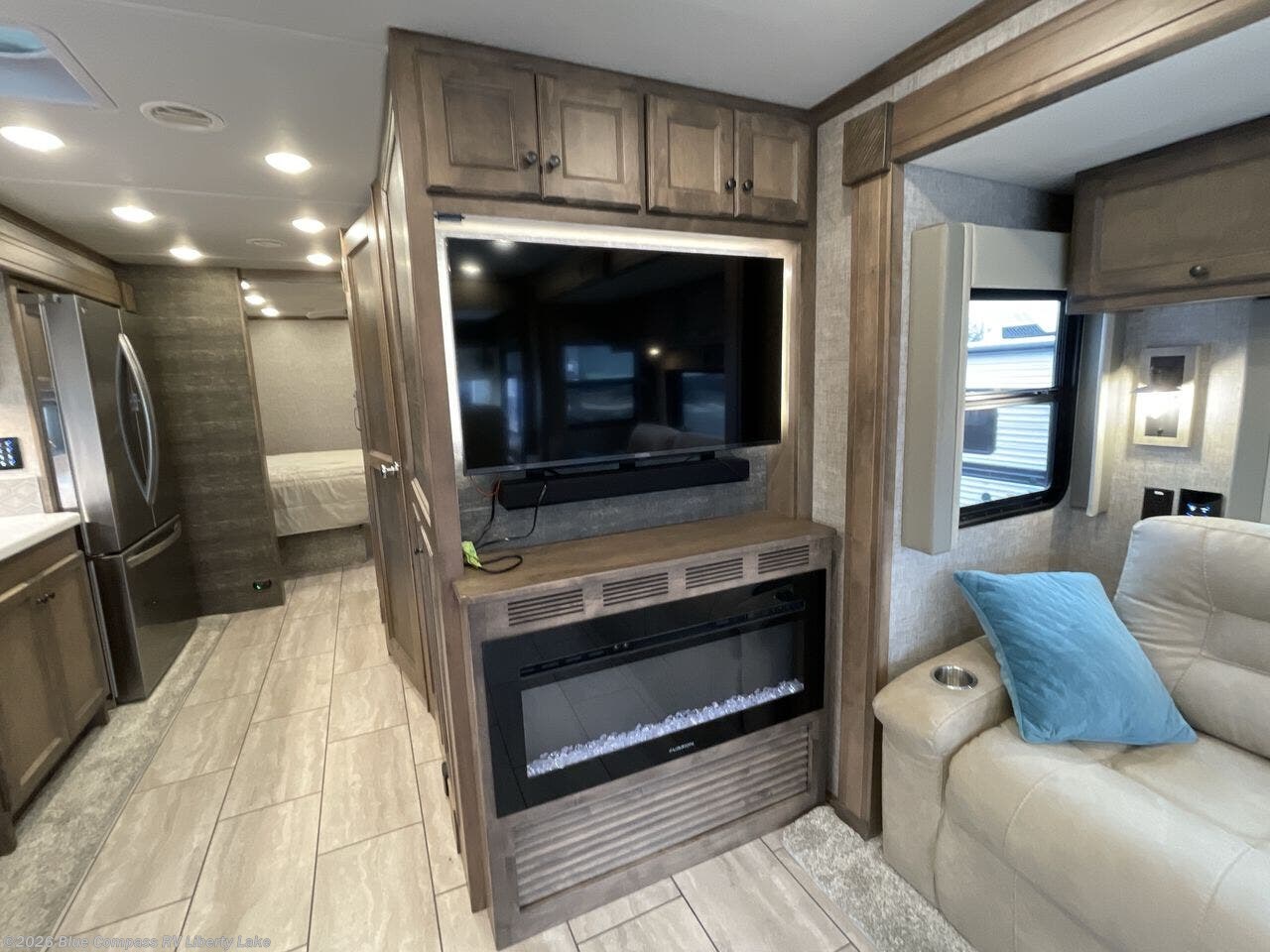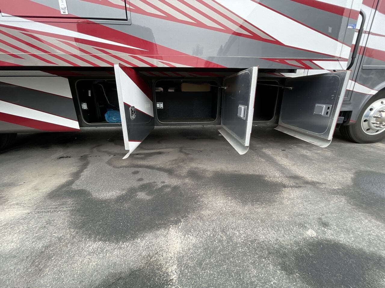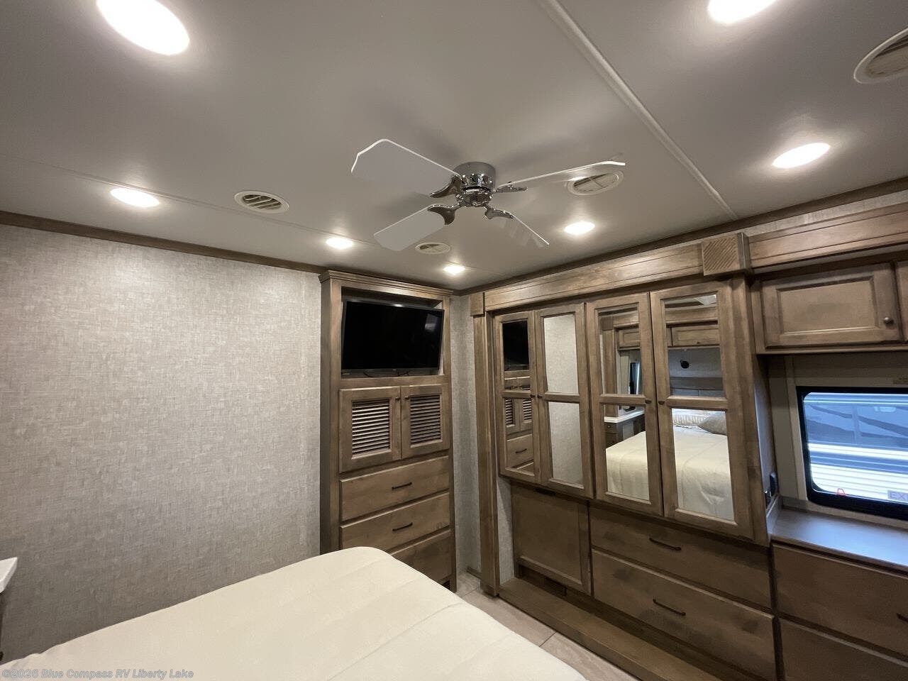 There are many standard luxurious features you will love about this motorhome! It also has many optional features you can add like the optional drop-down front bunk, the super sofa, the air coil sofa bed, or the theater seating. The king bed slide in the rear private bedroom offers a comfortable place to sleep, as well as the flip and fold sofa bed in the living area. You will love the dinette bar with a lift TV, a flip-up countertop, and two chairs that will make this the perfect place to get some work done while you're on the road. The kitchen includes everything you need to prepare meals each day, including a 1.7 cu. ft. smart convection microwave with an air fryer, a three burner liquid propane cooktop, and a 23 cu. ft. stainless steel residential refrigerator with French doors and a bottom freezer. Head to the rear master bedroom with a queen bed slide out, a large wardrobe, a cabinet with a TV and drawers below, plus a private entrance into the dual entry bath!