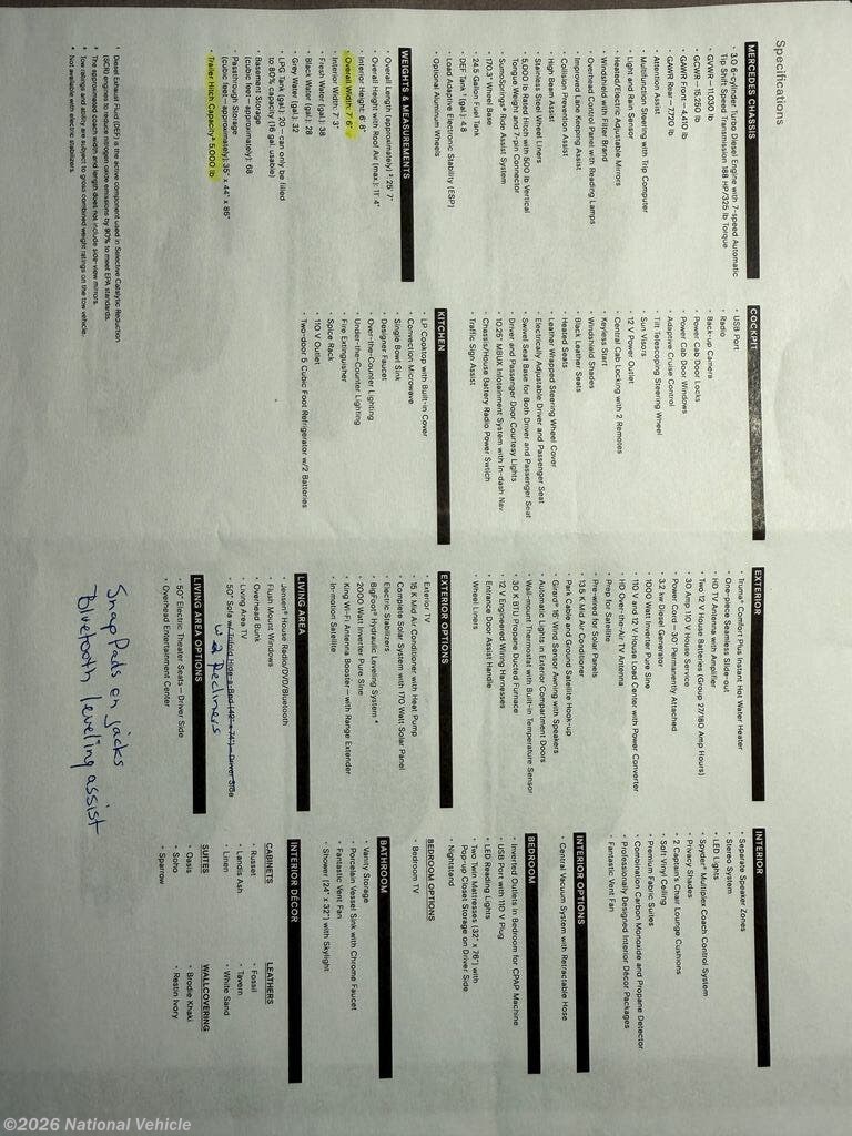 Entertainment & Technology: MBUX infotainment system with in-dash navigation, TVs in the living area, bedroom, and outdoor entertainment center. WiFi booster, satellite-ready, multiple USB and 12?V outlets.
