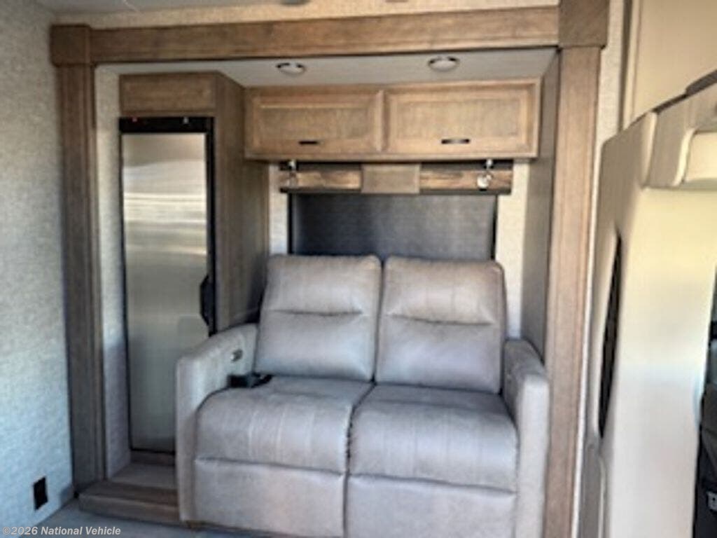 Seating & Dining: Theatre seating with heat, swivel captains chairs with attachable TV trays, and convertible dinette/lounge space.